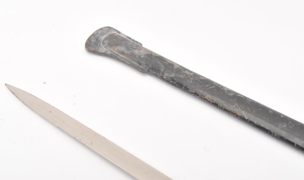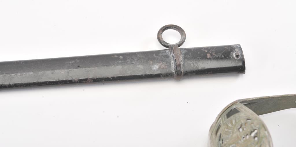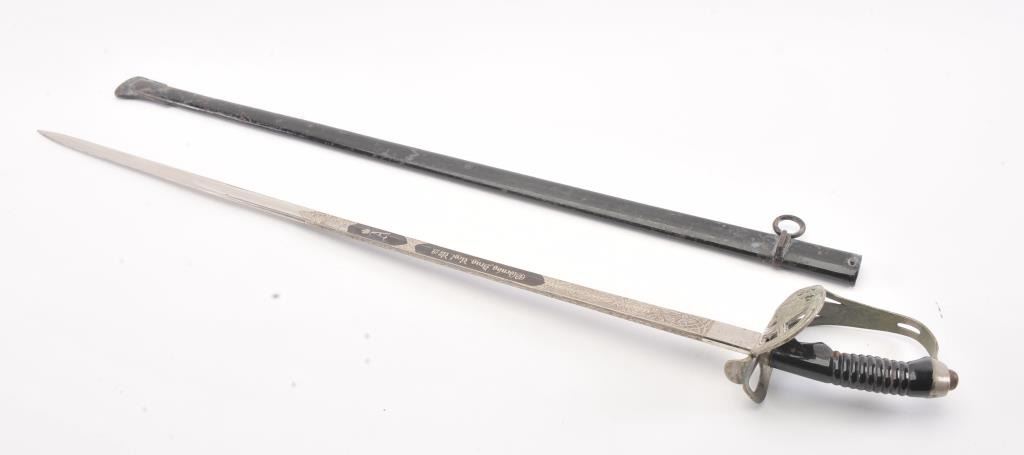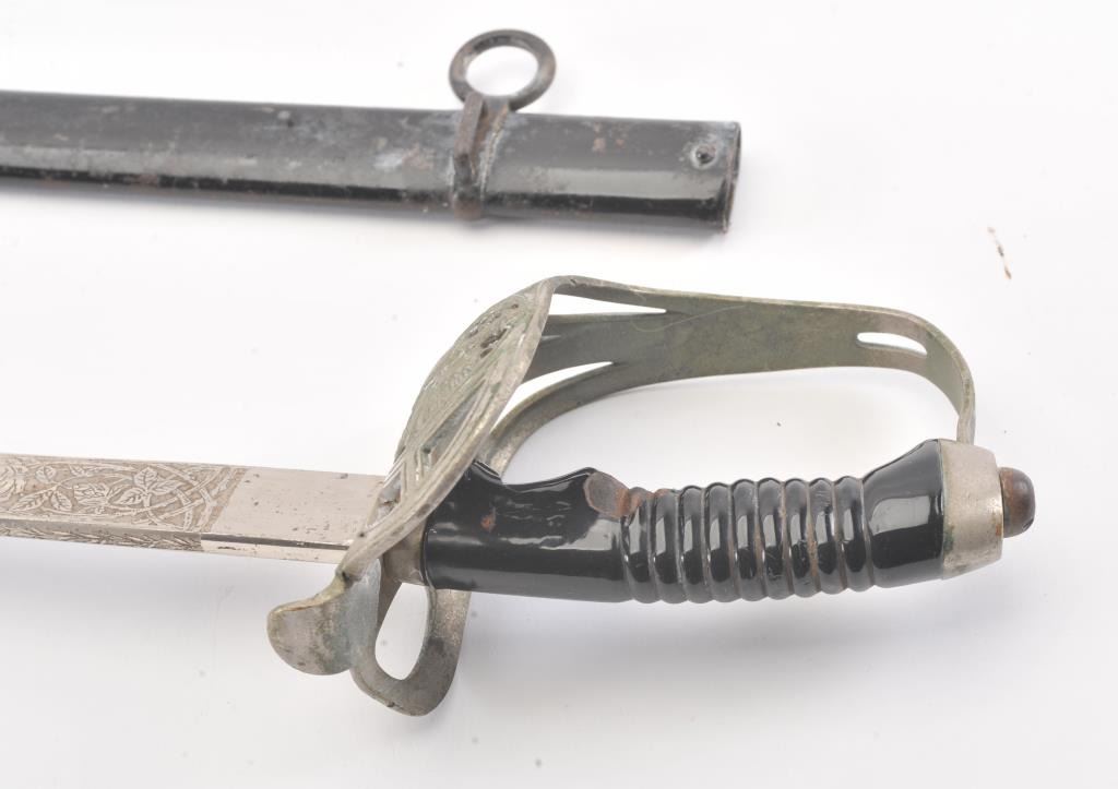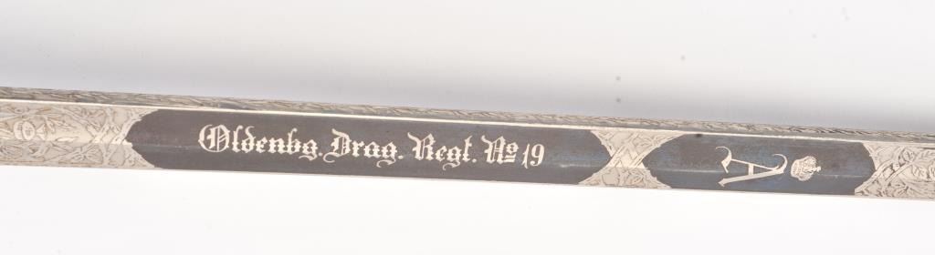 Prussian Cavalry m1889 Degen Half-basket Hilt Model 1889 KD-89] with folding guard. Unmarked triple etched nickeled blade is 30-5/8” long and 1” wide at the ricasso. Single fullered blade with false back edgecontains floral motif on spine. The obverse is etched with panoply of arms and contains blued “Oldenbg. Drag. Regt. No. 19” with Crown over “A”. The reverse is acid etched with floral motif and panoply of arms alongwith a blued scene of ten attacking cavalry with drawn swords. Sheet metal D-shaped guard is tarnished. Grooved celluloid covered but peeling wood grip. Flat top pommel with round tang nut. Folding guardhas the Prussian Coast of Arms. Black painted metal scabbard has one fixed hanger ring. Est.: $250-$500