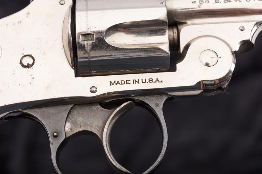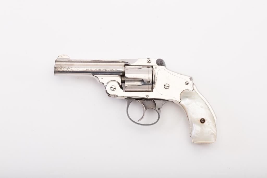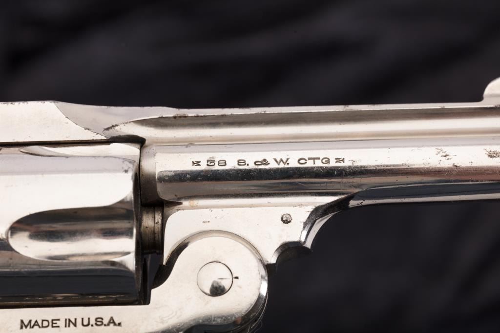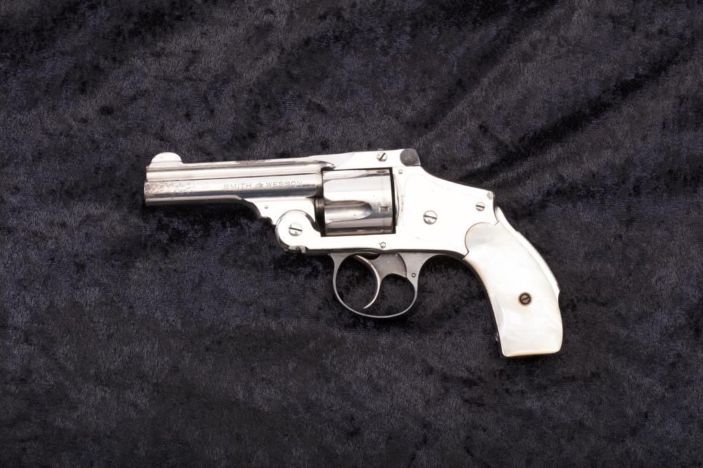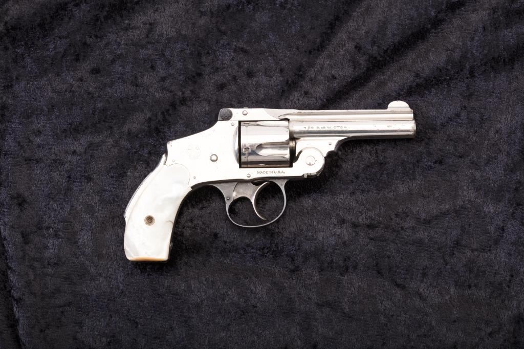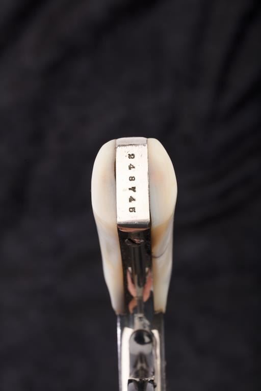 Smith & Wesson New Departure “Lemon Squeezer” revolver, .38 caliber, Serial #248745. The pistol is in good to very good overall condition retaining 80%-90% of the nickel finish with minor erosion and peeling. There is significant blue on the trigger guard and latch with considerable case colors on the trigger. The pearl grips are in good condition. The action is good and the bore is also good. Est.: $250-$500. (C+R/PPT).