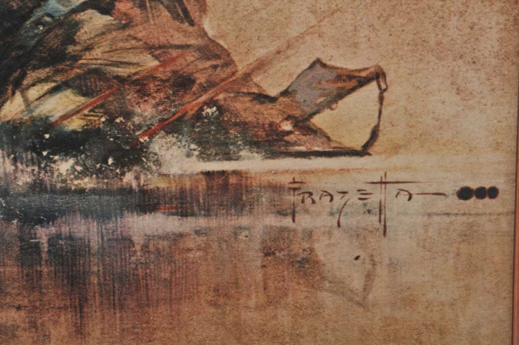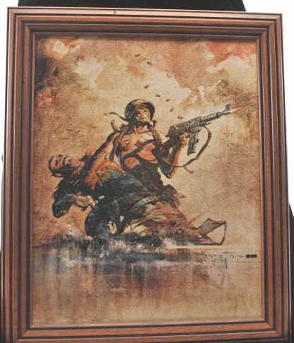 Frank Frazetta glicee "Combat" of a battle scene with two soldiers in a river, one shot and another coming to his aid and firing back with a machine gun. Measures 20"x16". Rarely seen in this size. Nicely framed.Est. $100-200