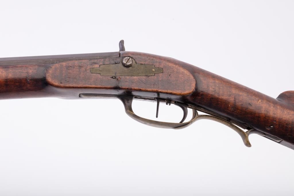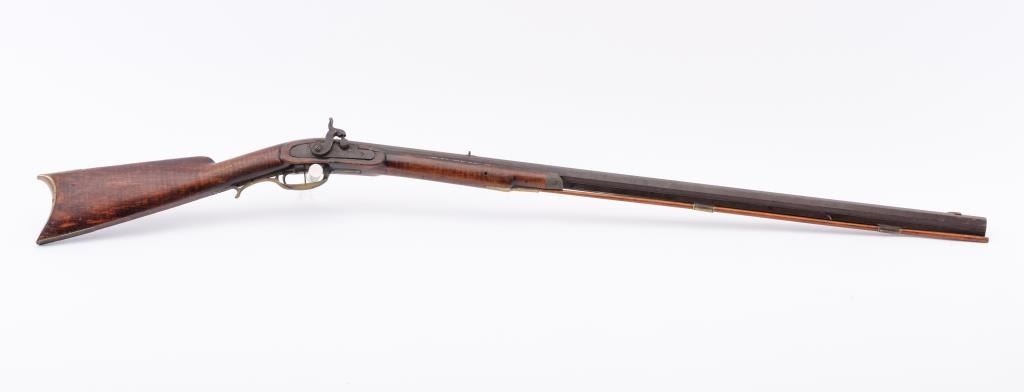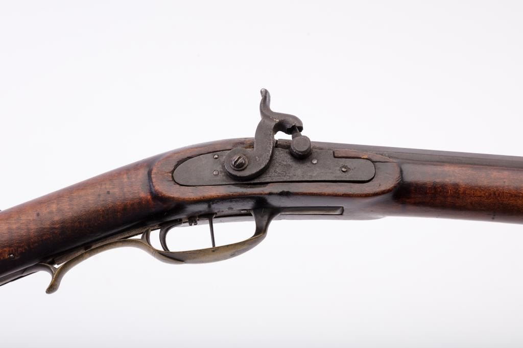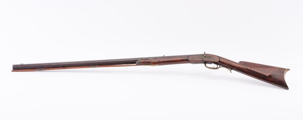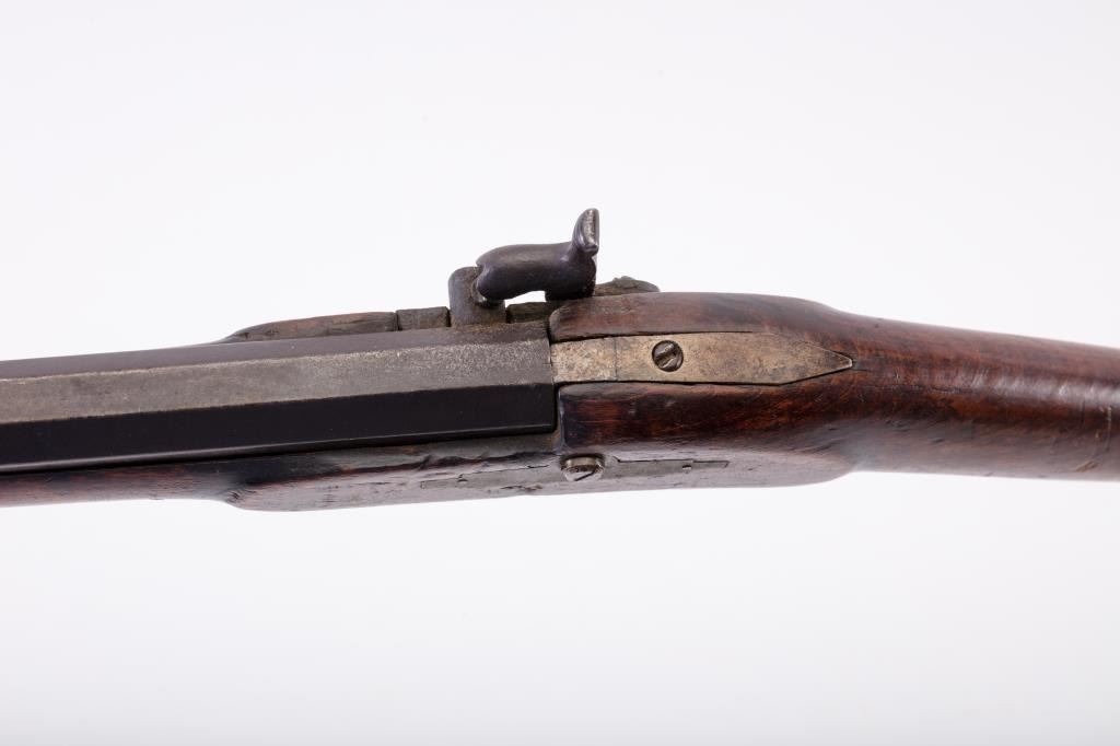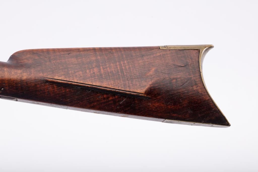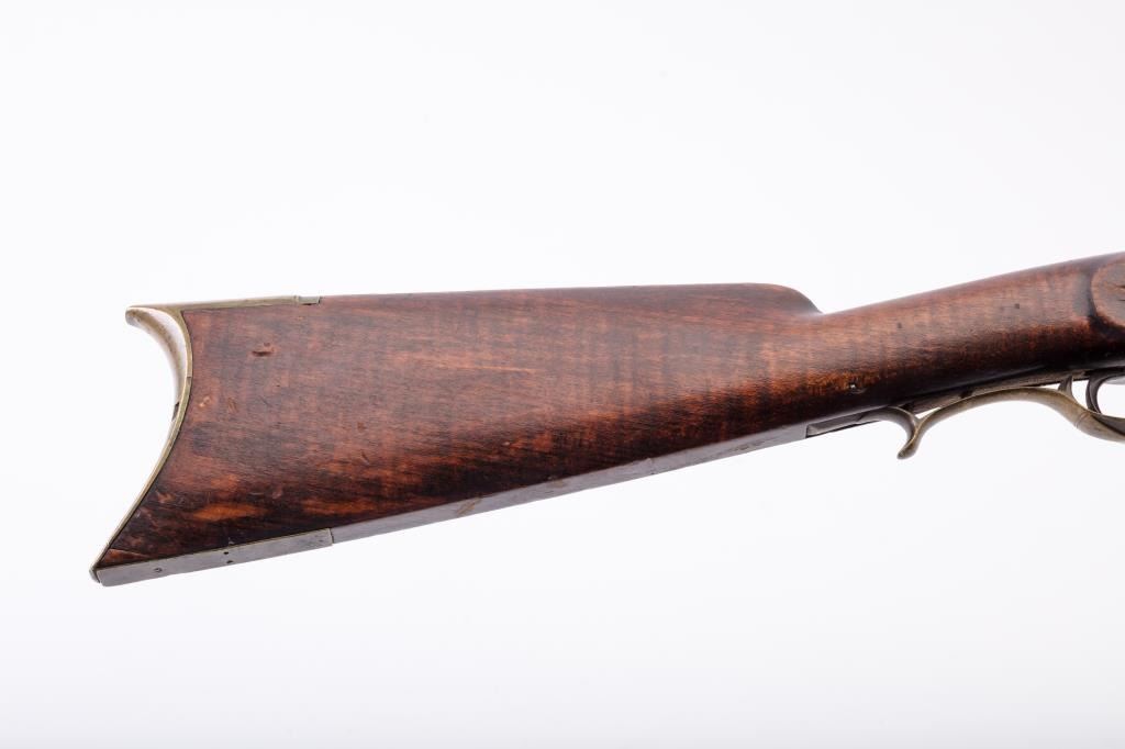 Unmarked half stocked percussion plains rifle measuring 52” overall with a 38” octagon barrel on medium weight in approximately .36 caliber with set trigger and pewter fore end cap. Simple brass mounts. Lock works well and trigger set. V notch and blade front sight. Dark patina on the metal and good to very good untouched condition found in the gold rush area of Northern California by old collector. (Antique) Est.: $400-$800