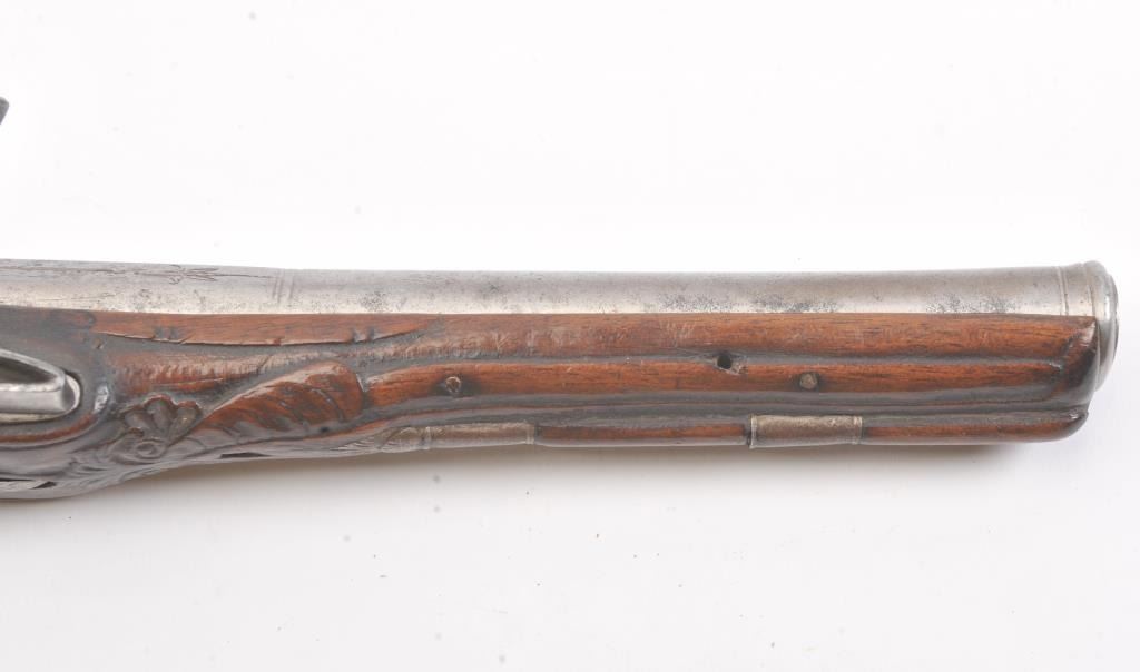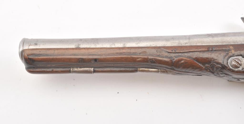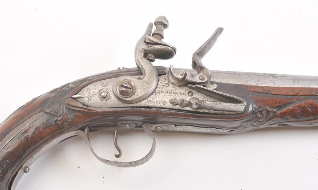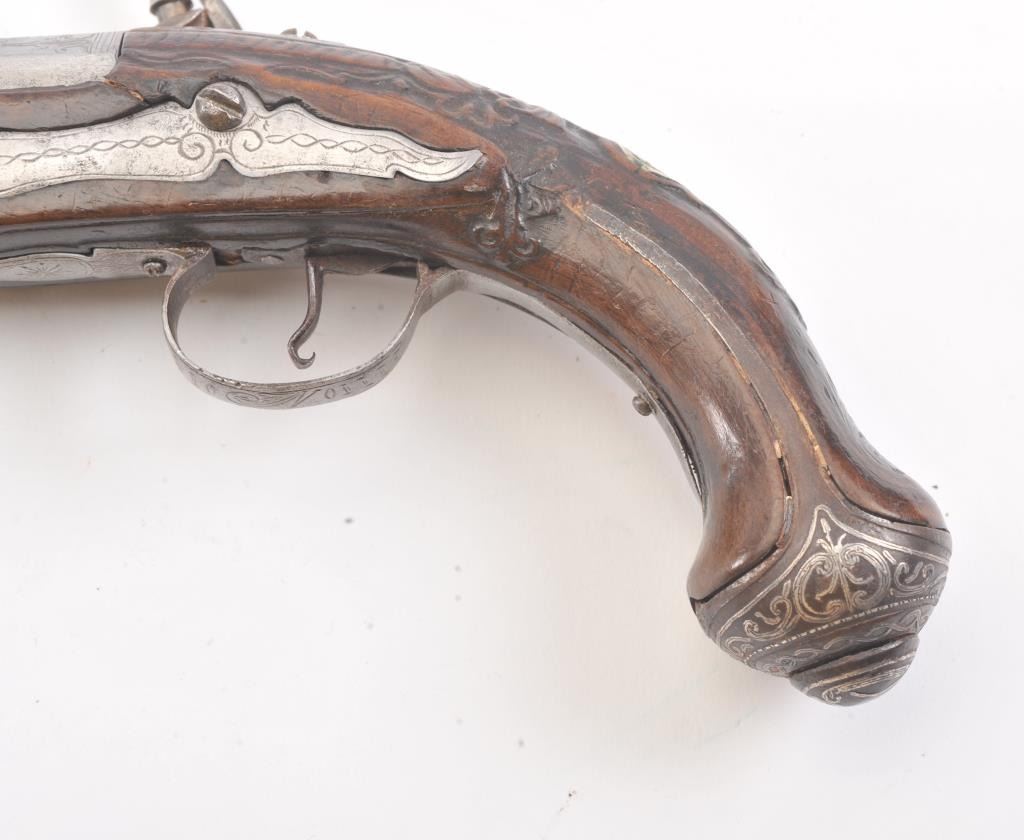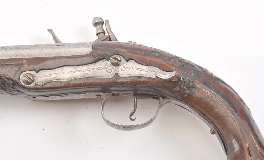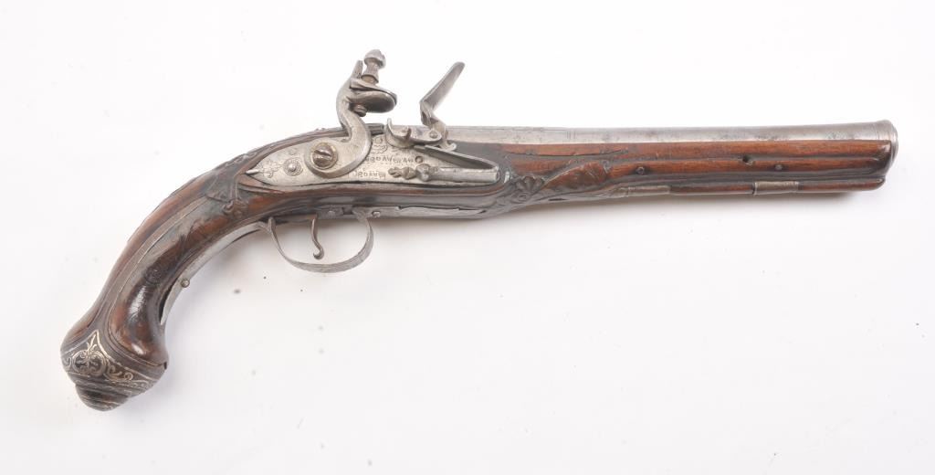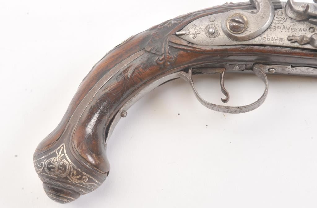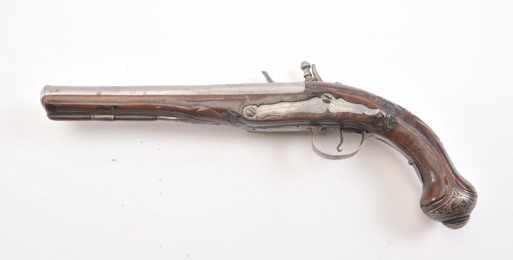 Flintlock pistol with silver inlaid butt possibly Greek or Baltic with signed lock in block letters. Measures 13 1/4" overall with a 8 1/4" barrel with ring cannon type muzzle of approximately .60 caliber smoothbore. Themetal has been cleaned to light gray in European tradition. Lock working. The stock is carved and generally good with minor imperfection and aging. False ramrod. (Antique) Est.: $350-$700
