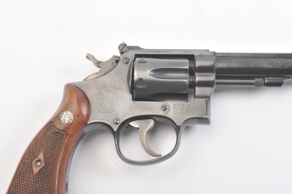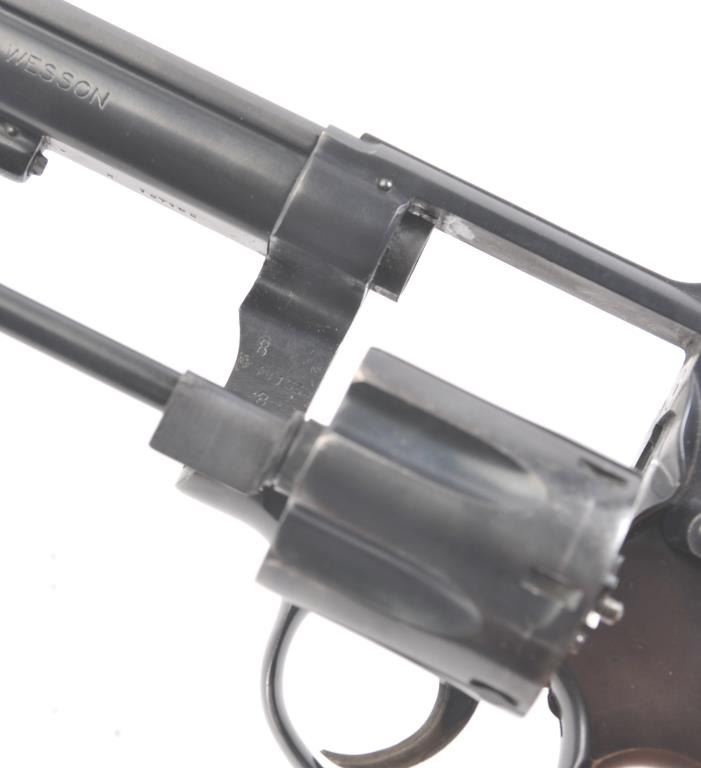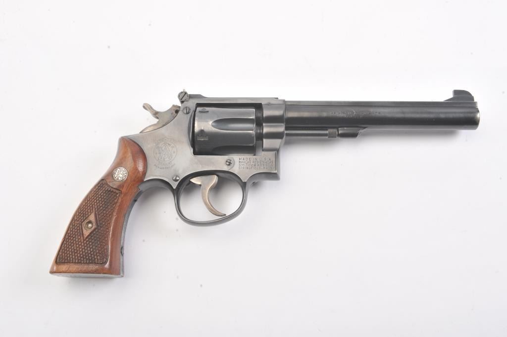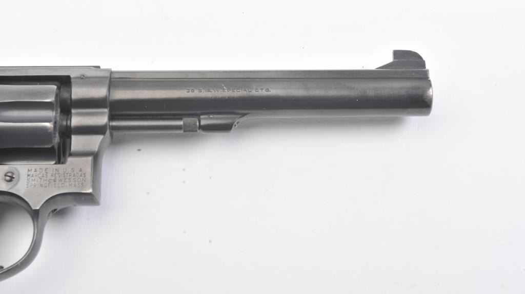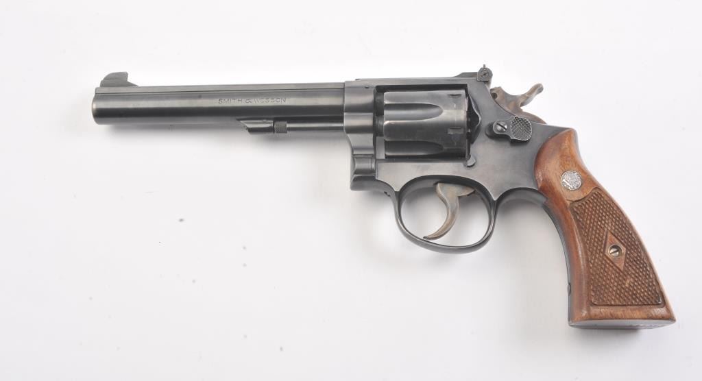 Early Smith & Wesson Model K38 double action revolver, .38 Special caliber, Serial #K167196. The pistol is in fine overall condition with a 6” pinned barrel with a ramped blade front and adjustable rearsights. The pistol retains approximately 90%-95% of the original blue finish with wear at the muzzle and an index line on the cylinder. The hammer and trigger show vivid case hardening. The checkered wood medallion grips are in very good condition with small mars and sharp checkering. The bore is good, the action is crisp and the markings are sharp on this desirable K38. Est.: $400-$800. (C+R).