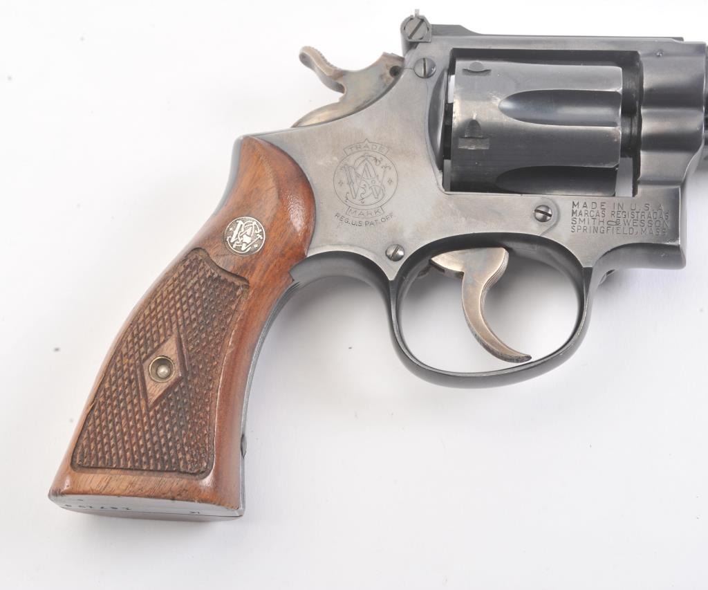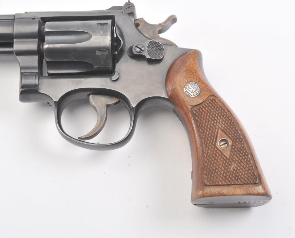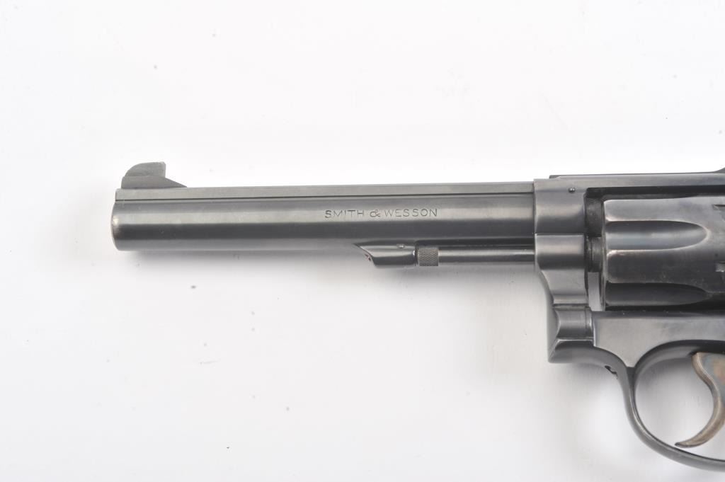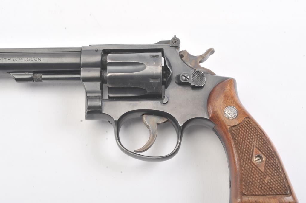 Early Smith & Wesson Model K38 double action revolver, .38 Special caliber, Serial #K167196. The pistol is in fine overall condition with a 6” pinned barrel with a ramped blade front and adjustable rearsights. The pistol retains approximately 90%-95% of the original blue finish with wear at the muzzle and an index line on the cylinder. The hammer and trigger show vivid case hardening. The checkered wood medallion grips are in very good condition with small mars and sharp checkering. The bore is good, the action is crisp and the markings are sharp on this desirable K38. Est.: $400-$800. (C+R).
