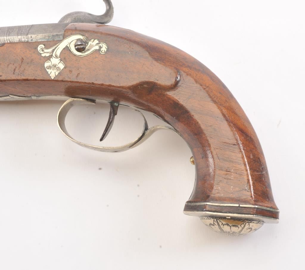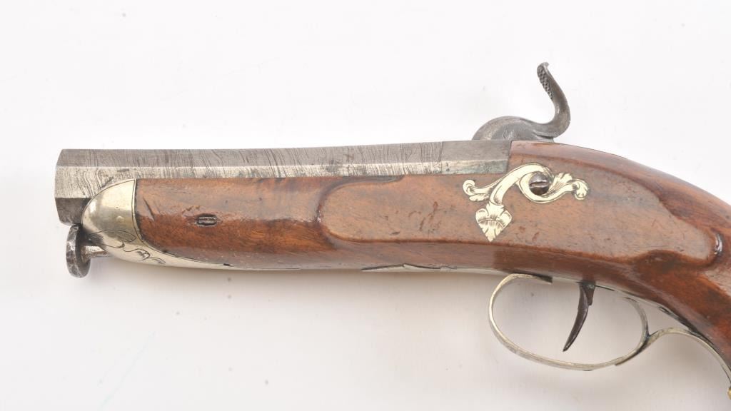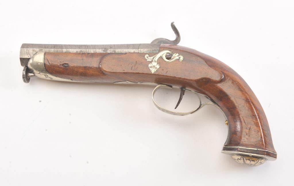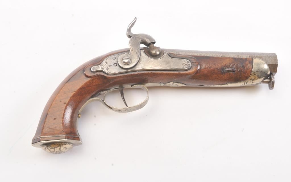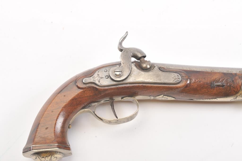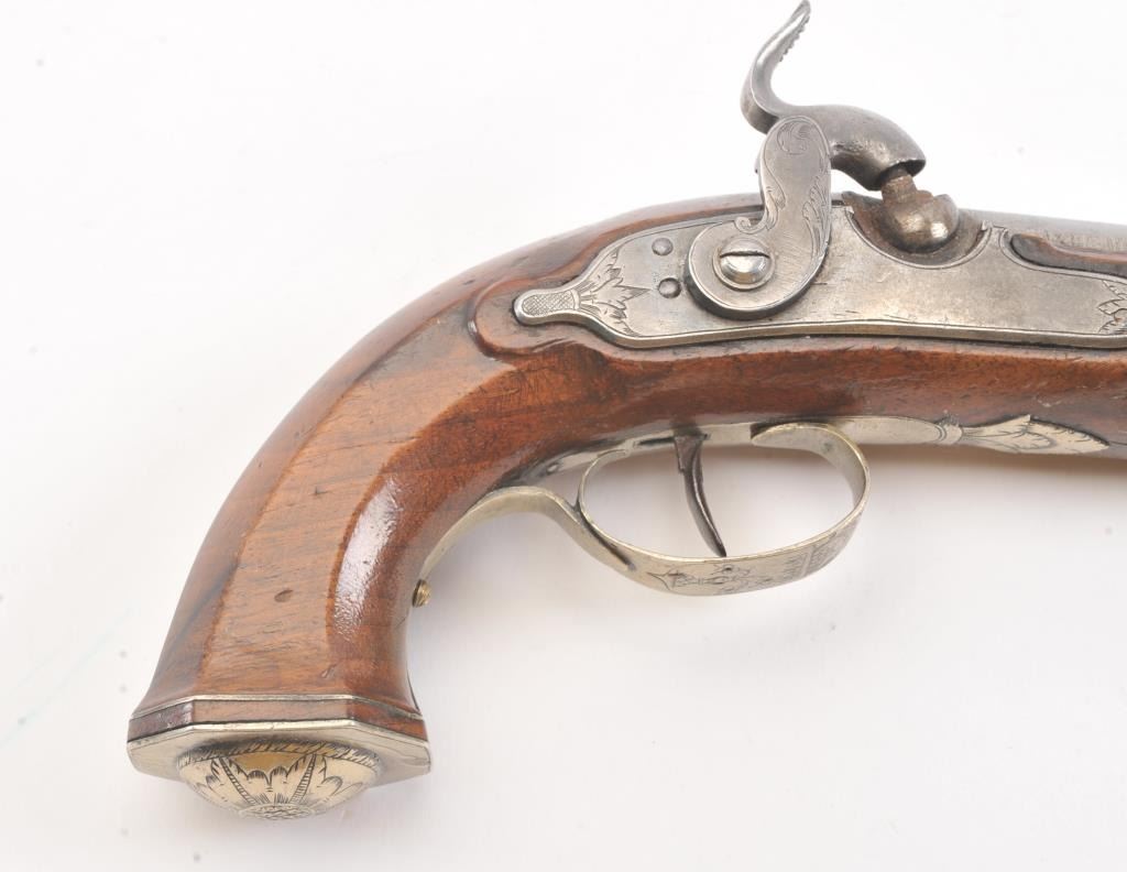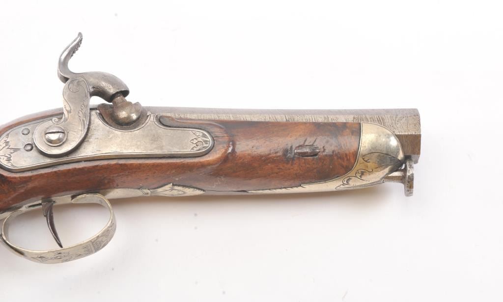 Good quality percussion pistol with engraved silver mounts from southern Europe circa Mid-19th century. Measures 9" overall with full stock and octagonal shaped square butt. Approximately .60 caliber plus octagonbarrel. Fancy escutcheon around lock screw taht is unique. Not staying on full cock, otherwise good to very good overall with minor marks in wood and normal metal aging. (Antique) Est.: $250-$500