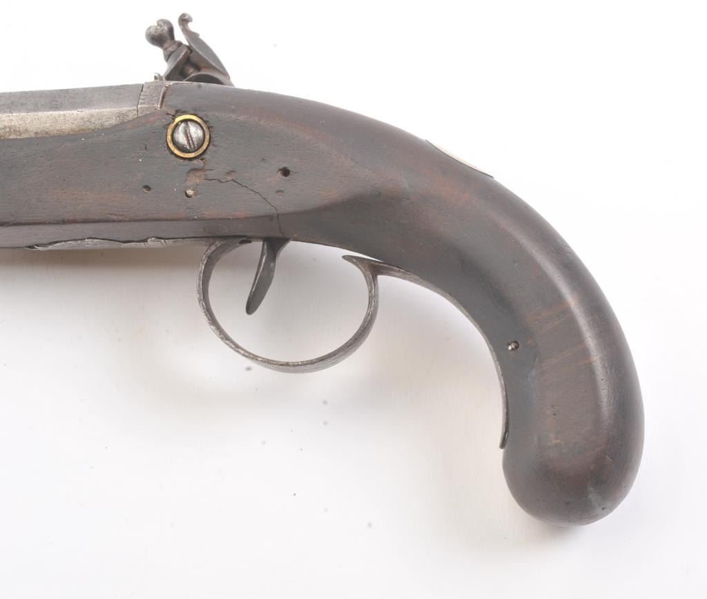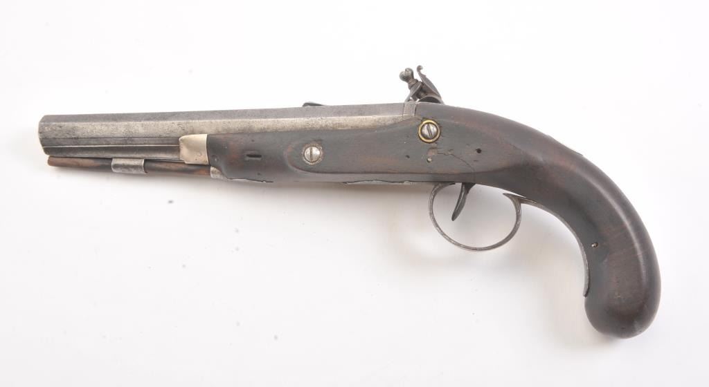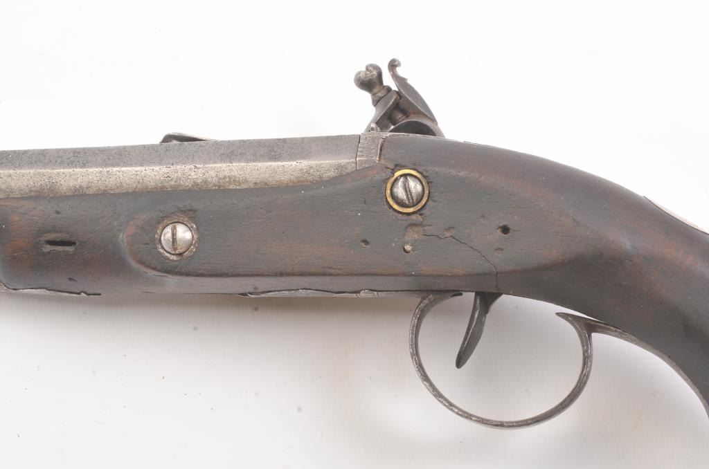 Flintlock dueling pistol marked "____ & Wallace" on the lock with an 8" octagon barrel of .60 caliber smoothbore. Half stocked with gold touch hole and roller on the frizzen in the style of 1815-30s. Thestock has been cleaned and repaired. Gray metal with light to slightly heavy pitting and erosion. The lock is not working properly but cocks and releases. Ramrod replaced. Fair only. (Antique) Est.: $350-$700