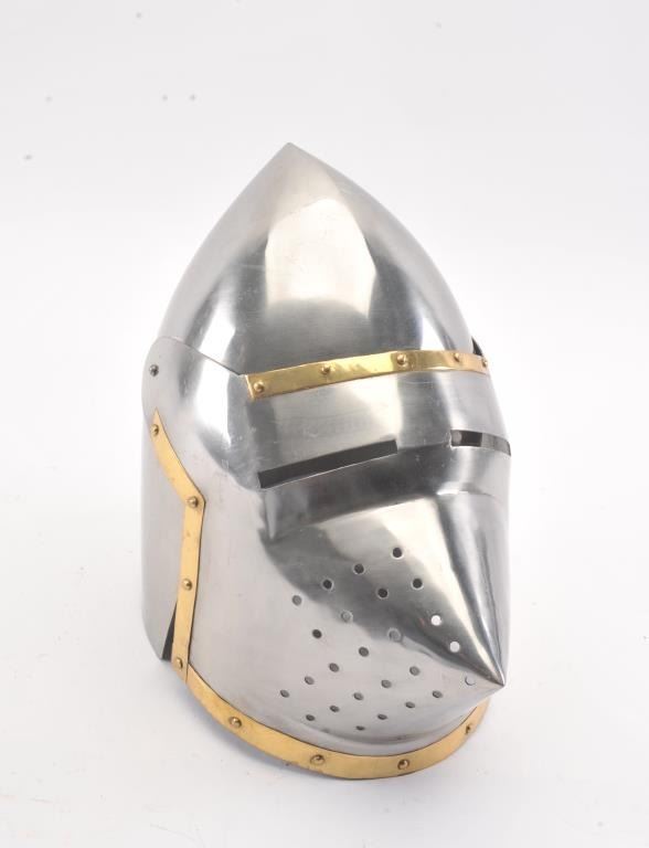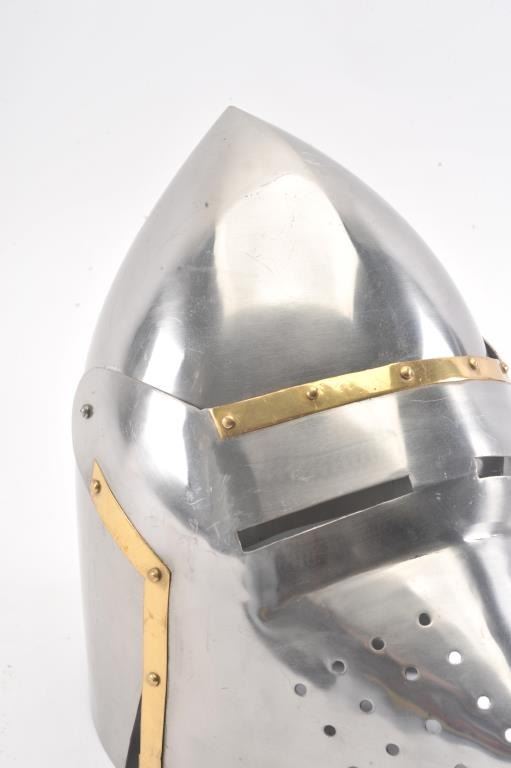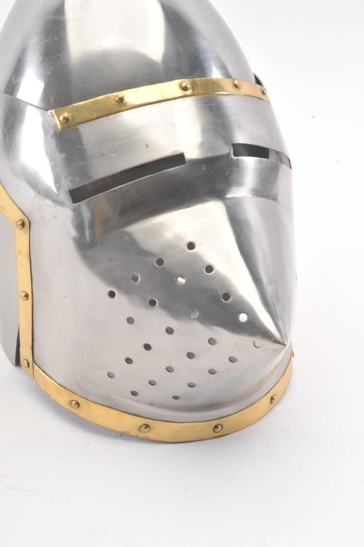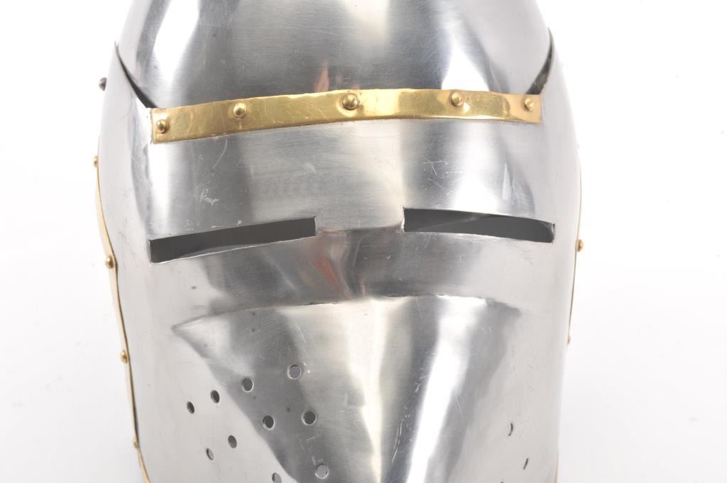 20th century made helmet in gothic style with brass decoration from re-enactor. Seamed and good quality with correct proportions. Est.: $350-700