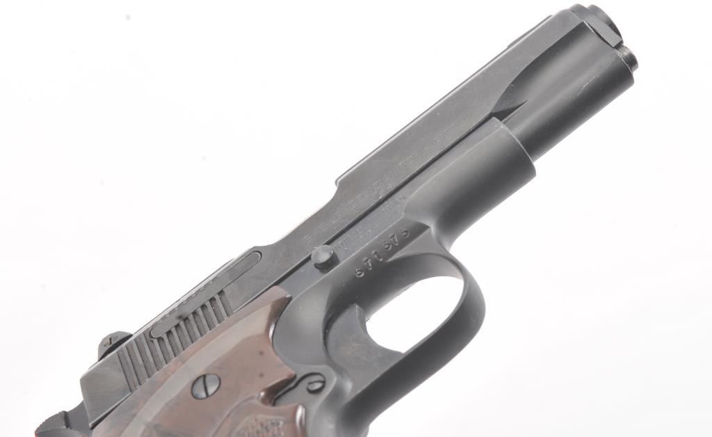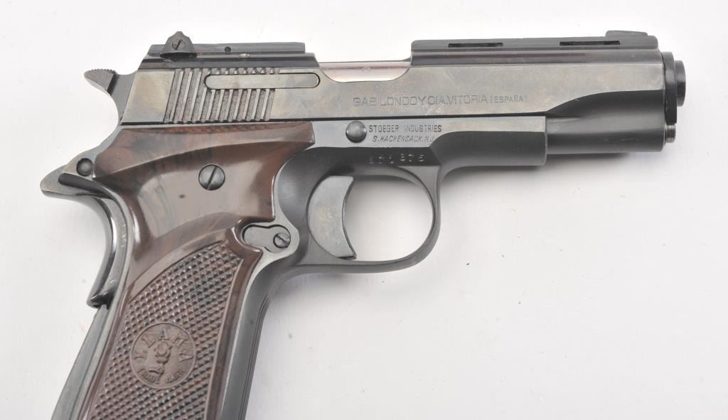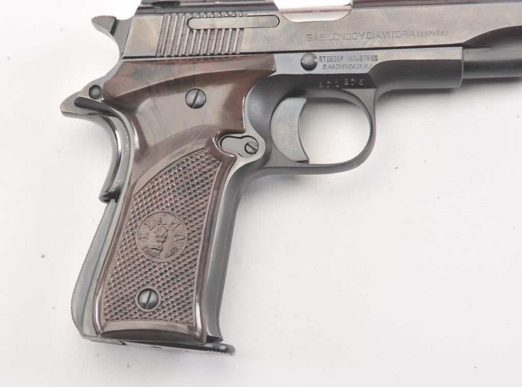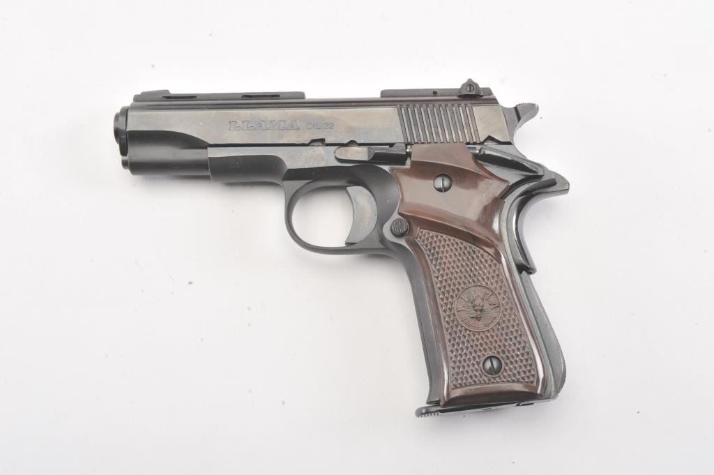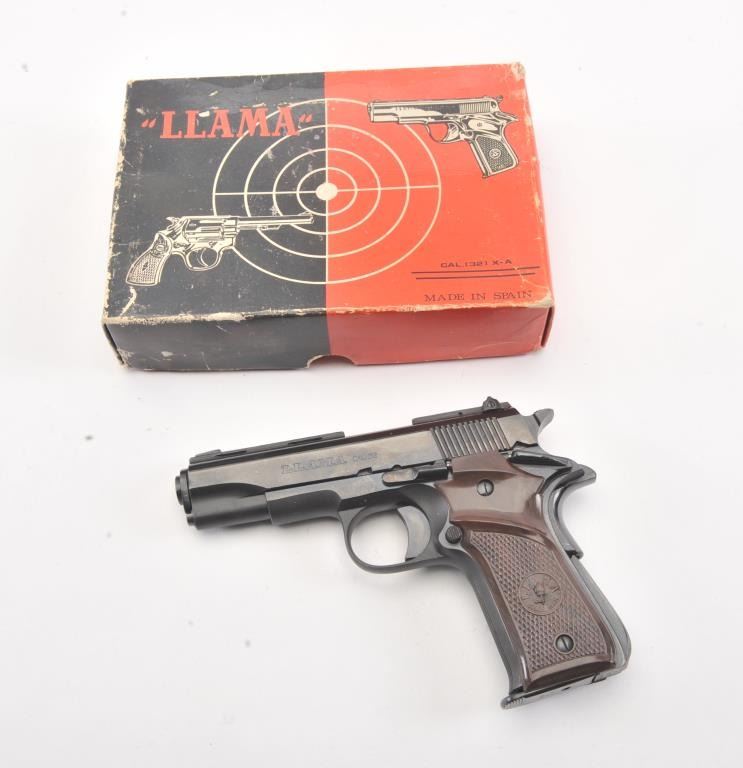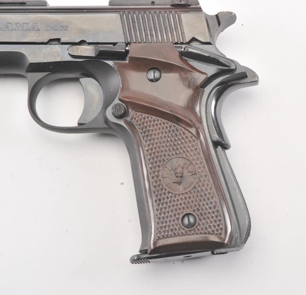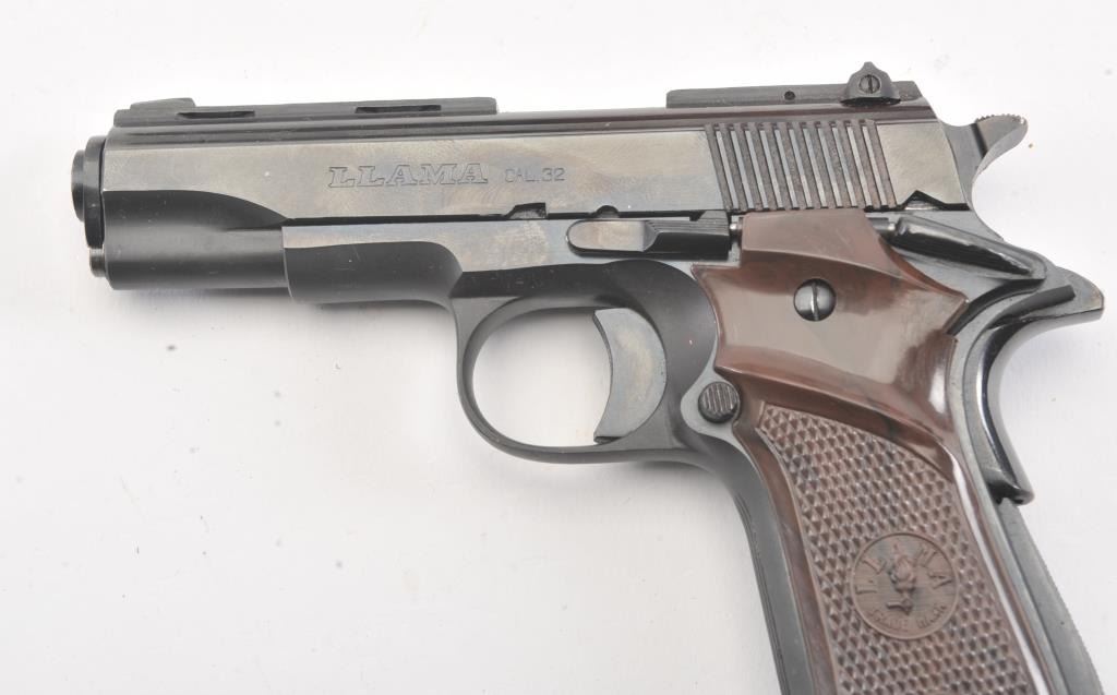 Llama X-A semi-automatic pistol, .32 ACP caliber, Serial #671375. The pistol is in fine overall condition with a 3 ½” barrel with a ventilated rib. The pistol retains nearly all of the blue finish with lighthandling marks. The checkered plastic grips are in very good condition. The bore is good, the action is crisp and the markings are sharp. The lot includes the factory cardboard box, one correct magazine andcleaning accessories. Est.: $200-$400. (Modern/PPT).