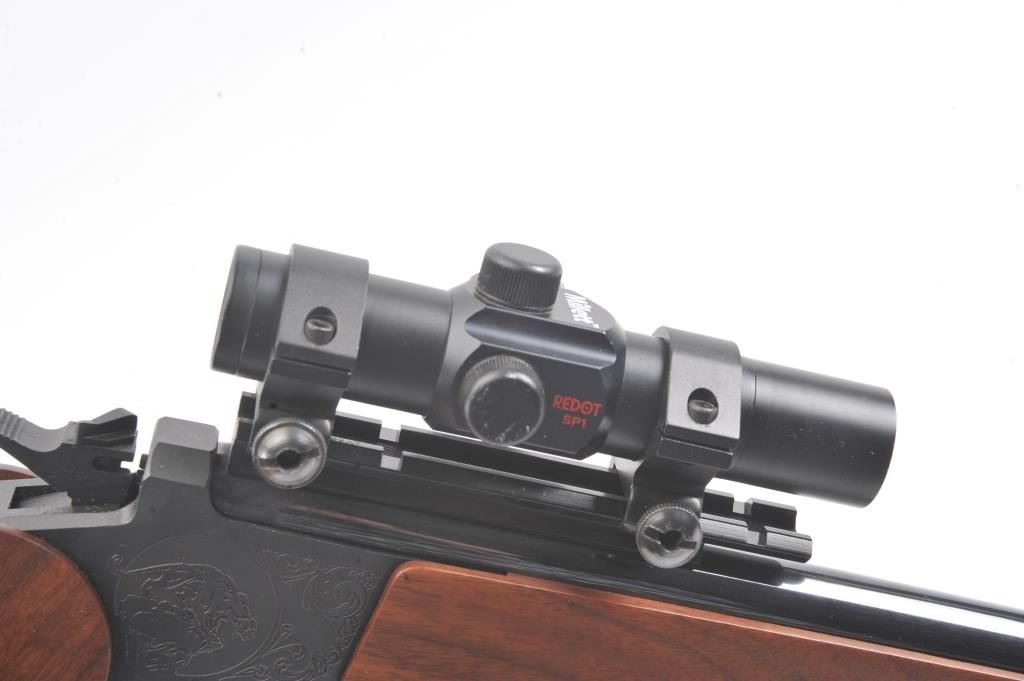 Thompson Center Arms single shot pistol, .22 LR caliber, Serial #340469. The pistol is in fine overall condition with a 10” barrel with a ramped post front sight and scope mount with Millett SP1 red dot scope. The barrelretains nearly all of its polished blue finish while the receiver is tastefully engraved. The smooth wood grips and fore end are in very good condition. The bore is good, the action functions and markings are sharp. (Modern/PPT) Est.: $300-600