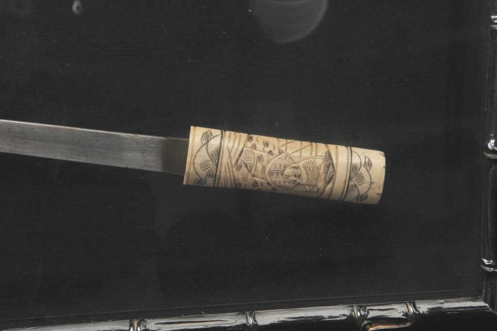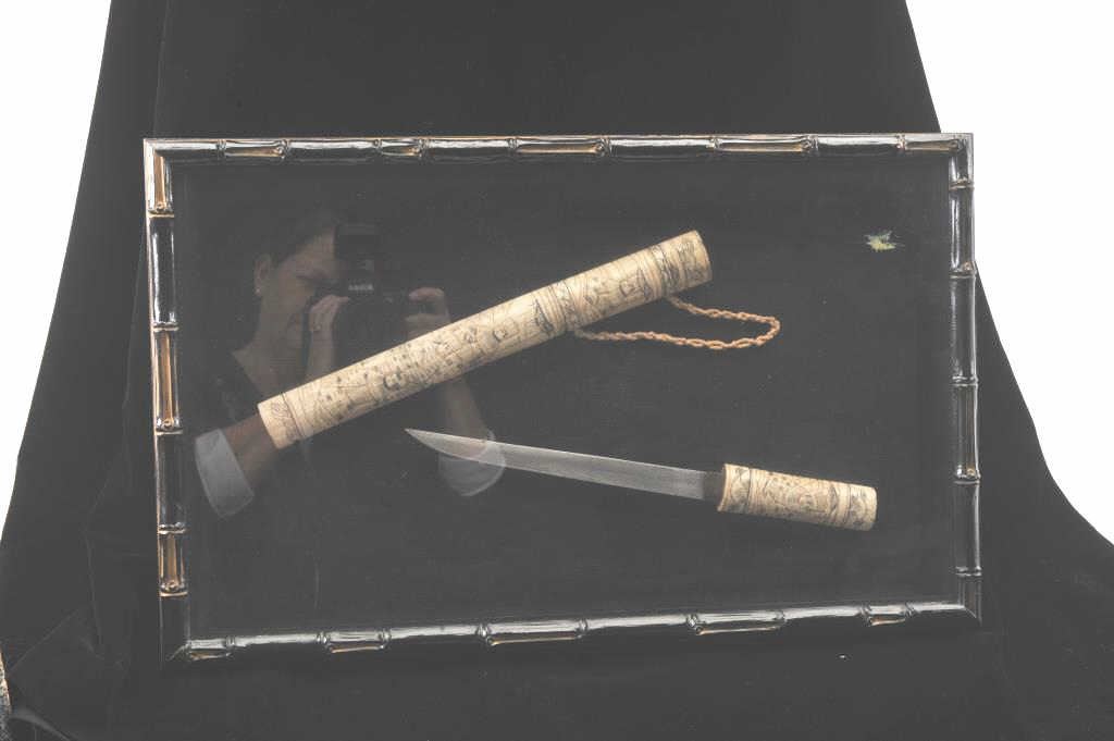 Beautifully scrimshawed knife and sheath in display case. The knife is 12 ½” in overall length with an 8 ¼” blade. The handle and scabbard appear to be bone with ornate scrimshaw depicting an Asian motif. Theknife is mounted in a wooden wall mount case measuring 20 ½” x 12 ½”. Est.: $200-$400.
