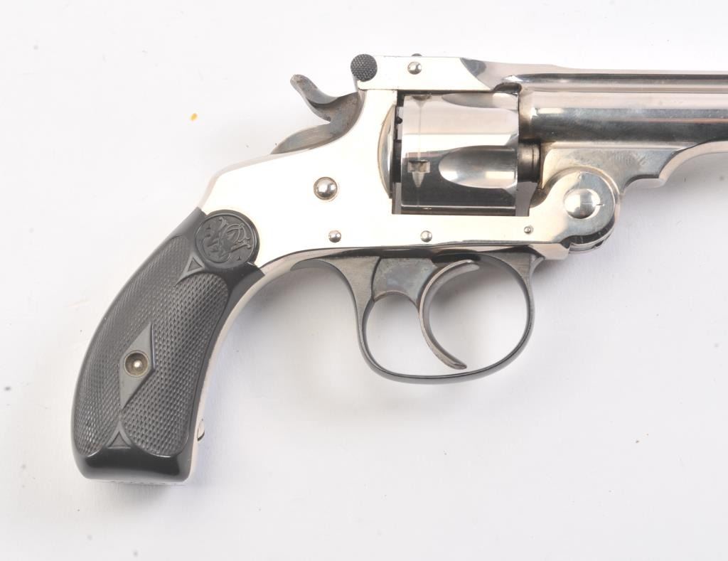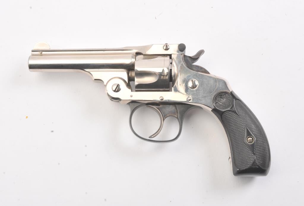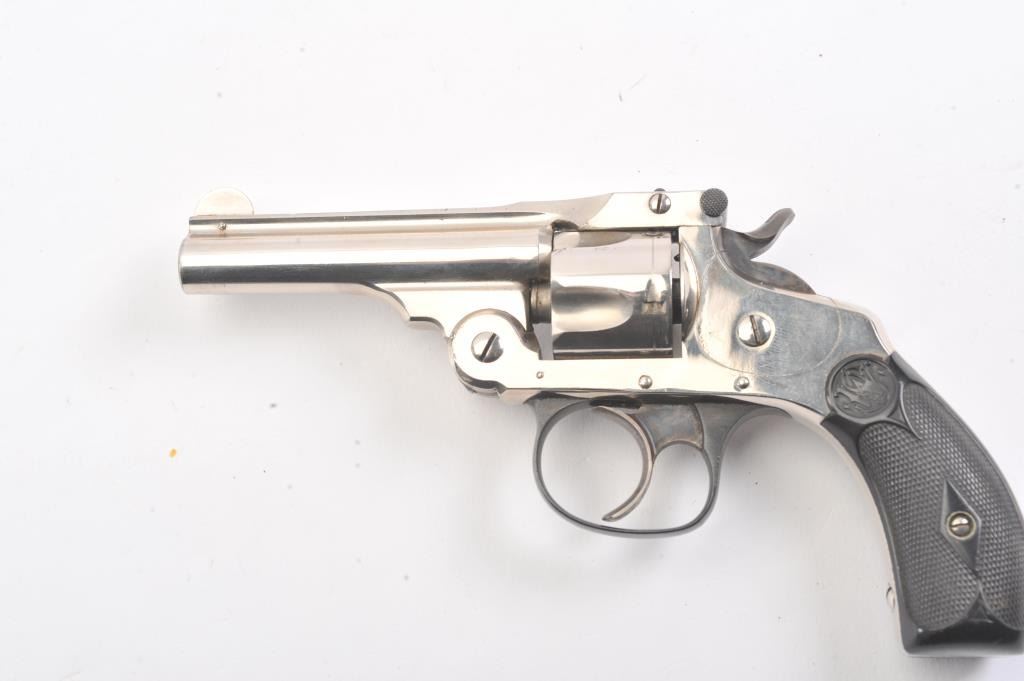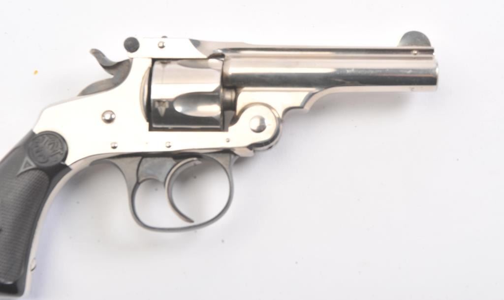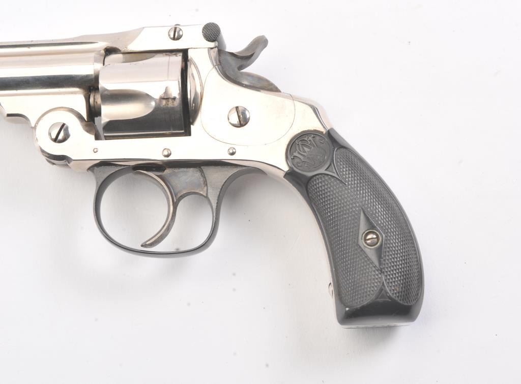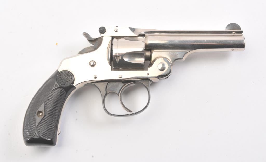 Smith & Wesson DA 4th Model revolver, .32 caliber, Serial #107304*. The pistol is in fine overall condition as factory re-finished. The pistol retains nearly all of the nickel finish with handling marks andan index line on the cylinder. The trigger and hammer show vivid case hardening. The Serial # on the butt of the pistol ends with a star, indicating a factory re-finish. The checkered rubber grips are in very goodcondition. The bore is fair, the action is crisp and the markings are sharp. Est.: $200-$400. (C+R/PPT).