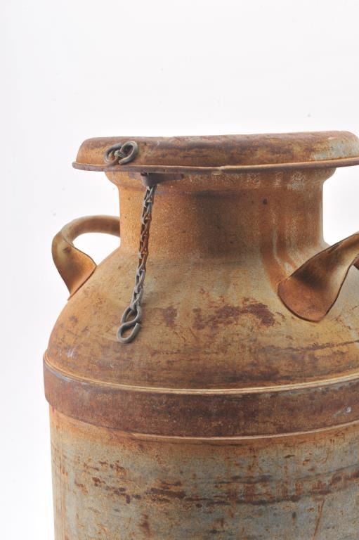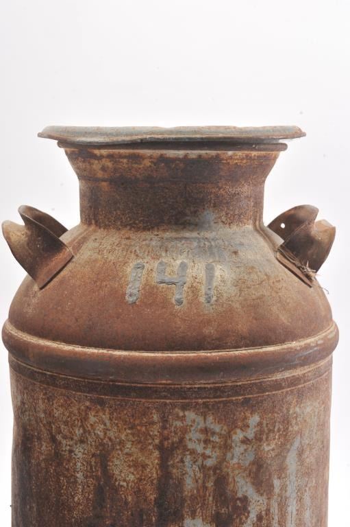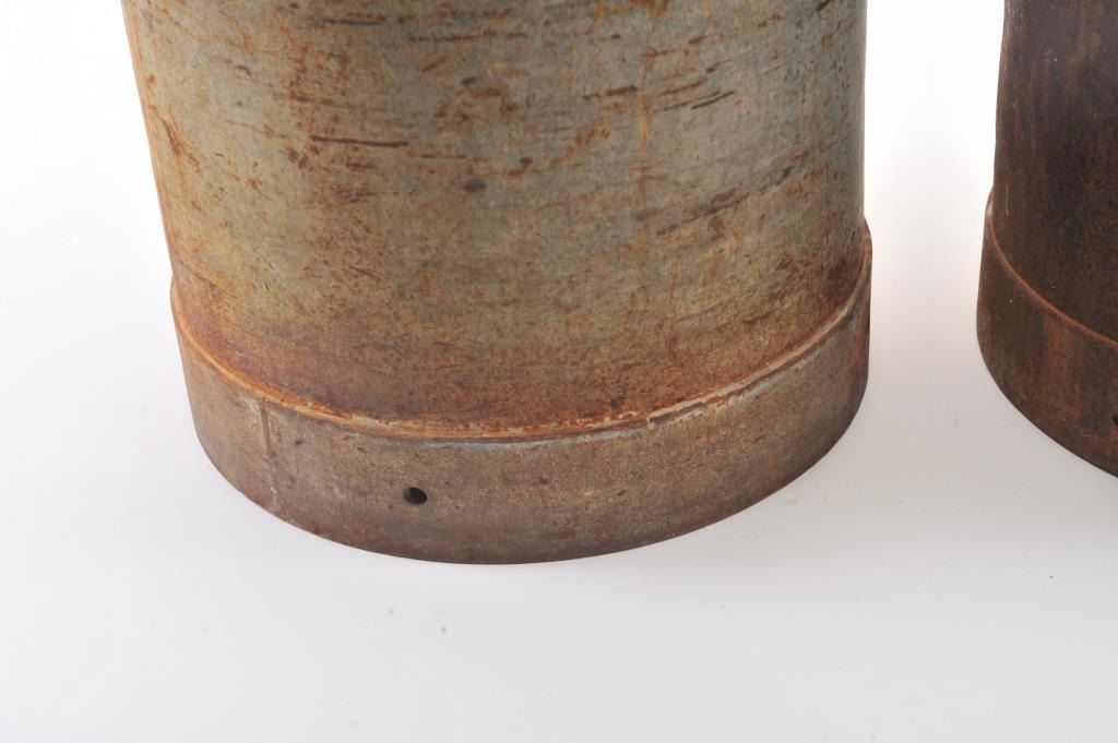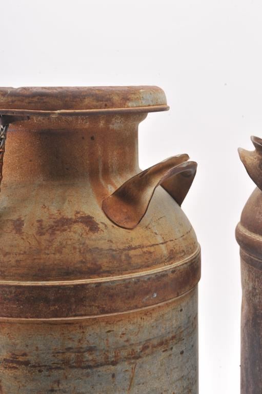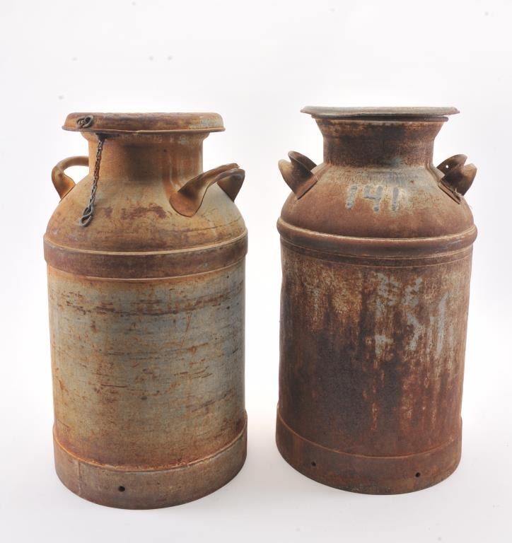 Pair of large un-cleaned old metal milk cans, each approximately 24” in height and 14” in diameter. Est.: $125-$175.