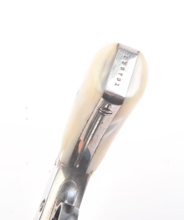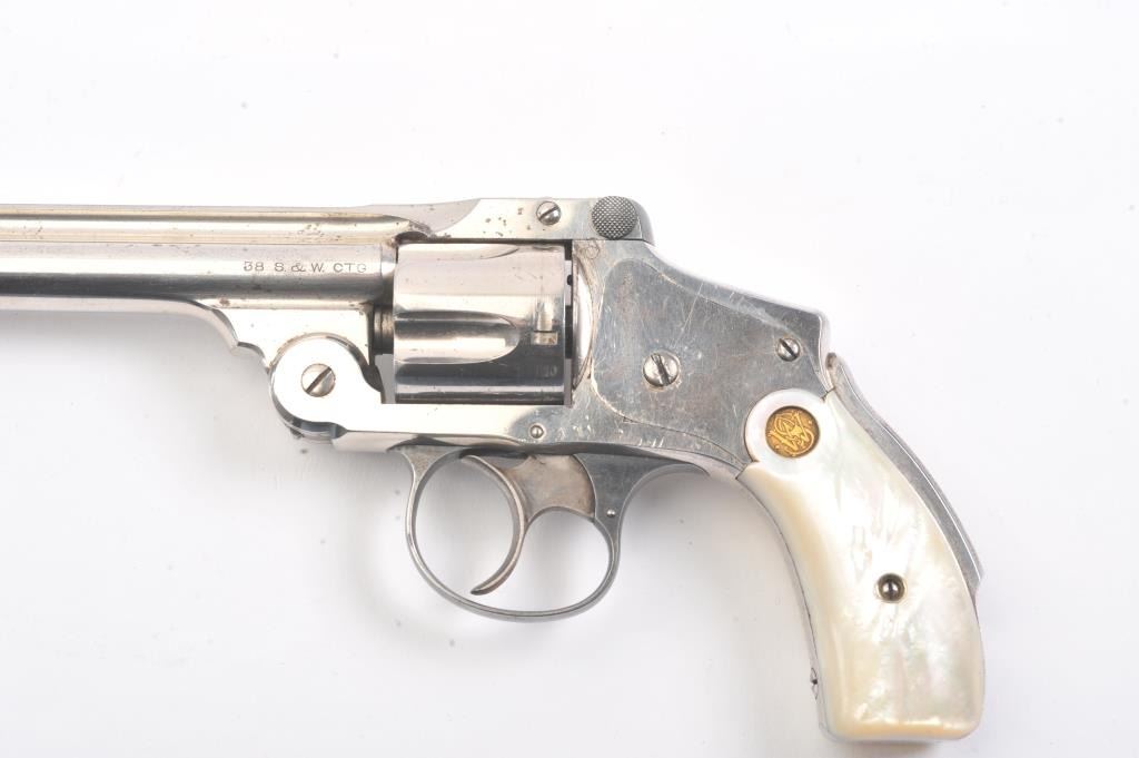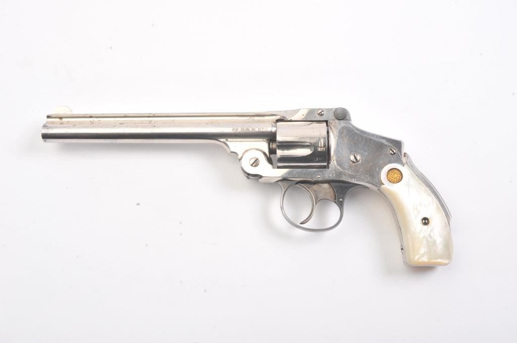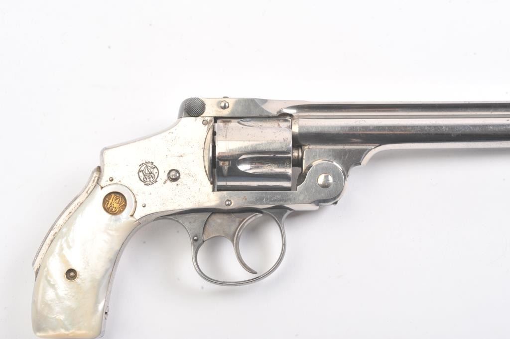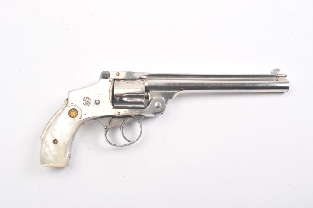 Smith & Wesson New Departure double action revolver, .38 caliber, Serial #139791. The pistol is in fine overall condition with 6” barrel with a fluted rib. The pistol retains nearly all of the nickel finish with wear at the muzzle and light surface erosion. The trigger shows muted case hardening. The smooth pearl medallion grips are in very good condition with great fit and finish. The bore is fair, the action is crisp and themarkings are sharp on this long barrel “Lemon Squeezer”. Est.: $400-$800. (C+R).