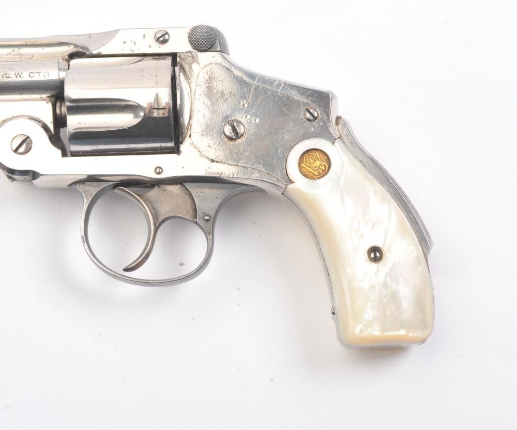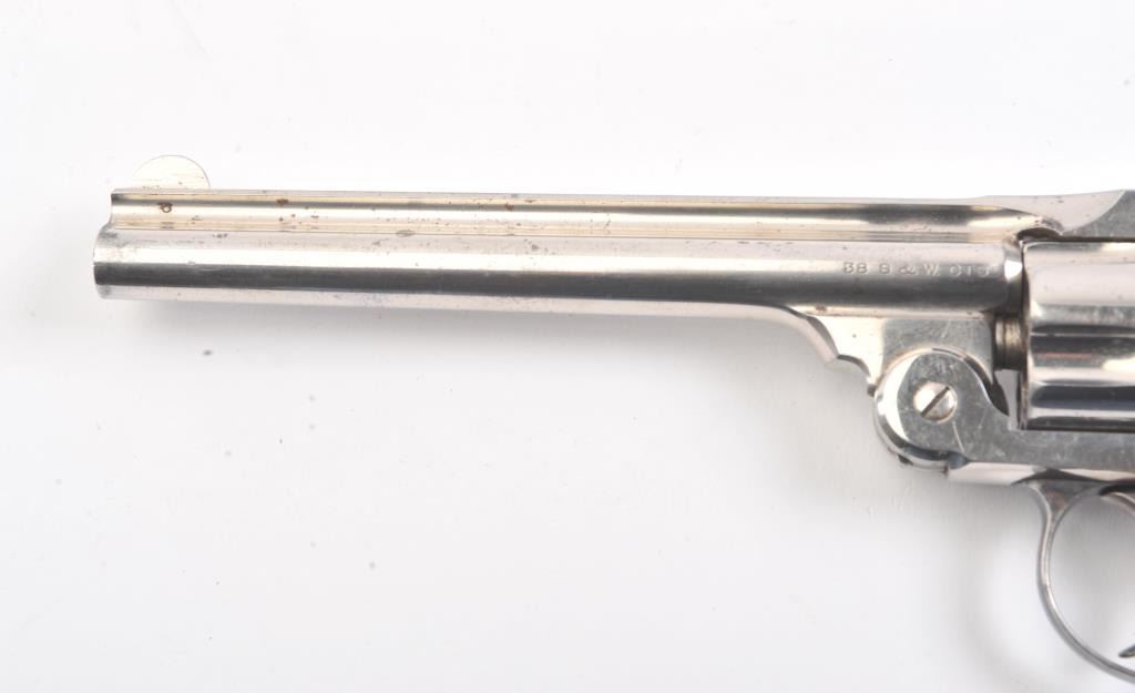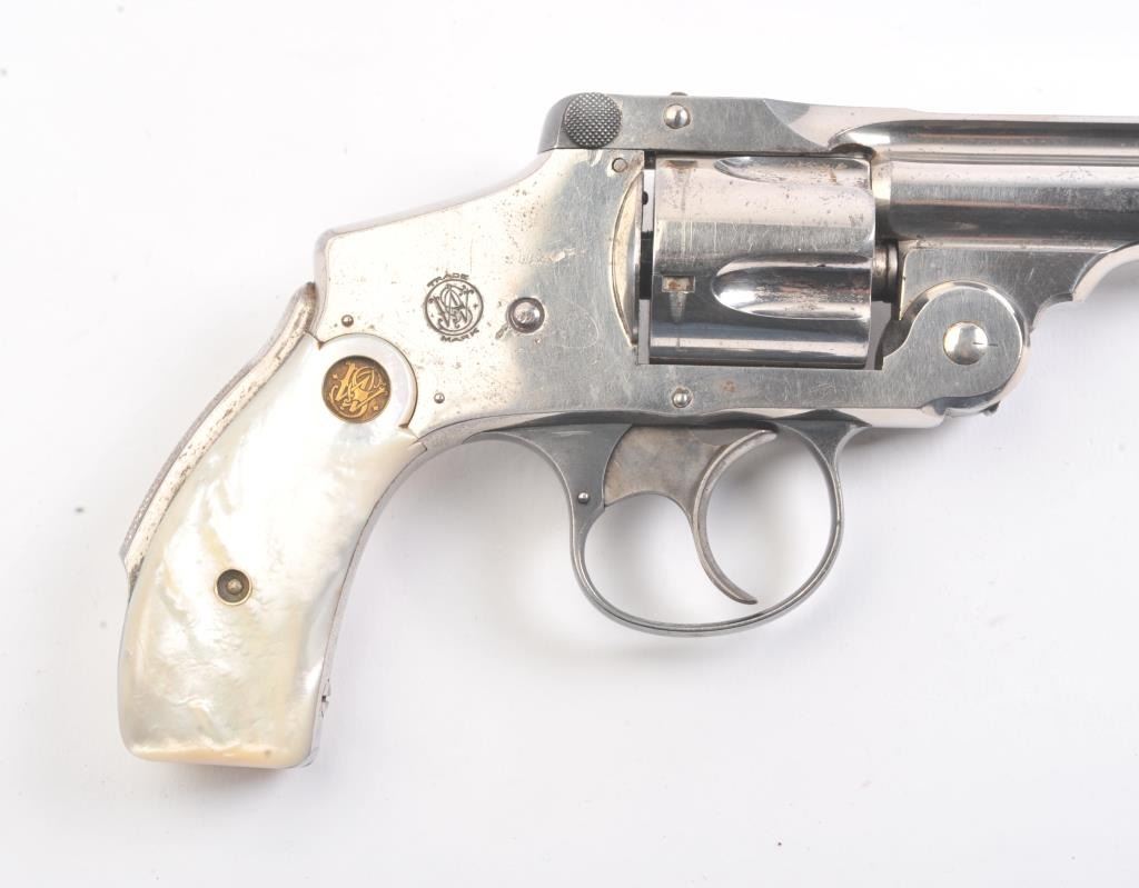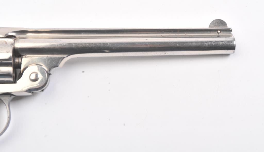 Smith & Wesson New Departure double action revolver, .38 caliber, Serial #139791. The pistol is in fine overall condition with 6” barrel with a fluted rib. The pistol retains nearly all of the nickel finish with wear at the muzzle and light surface erosion. The trigger shows muted case hardening. The smooth pearl medallion grips are in very good condition with great fit and finish. The bore is fair, the action is crisp and themarkings are sharp on this long barrel “Lemon Squeezer”. Est.: $400-$800. (C+R).
