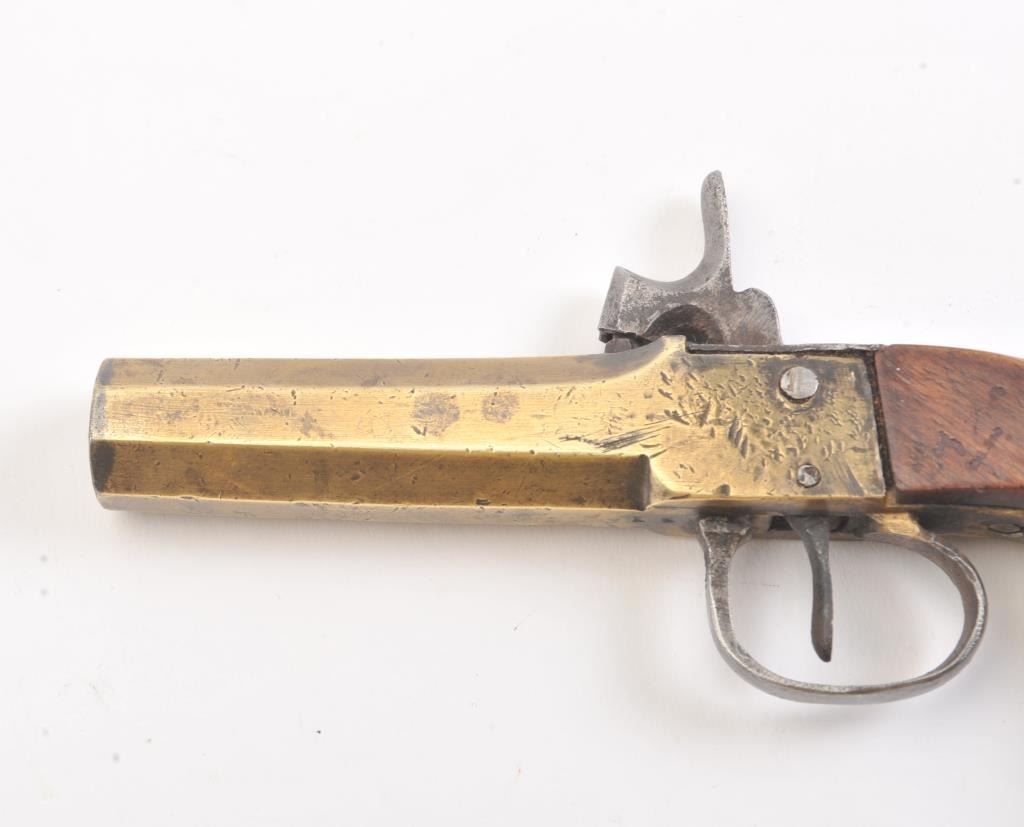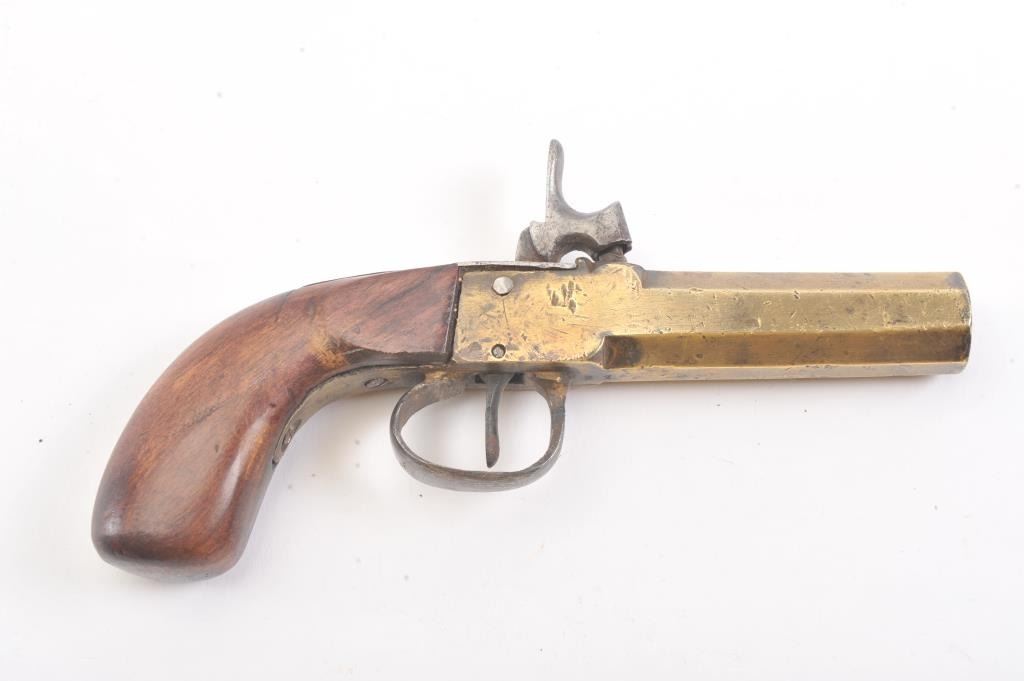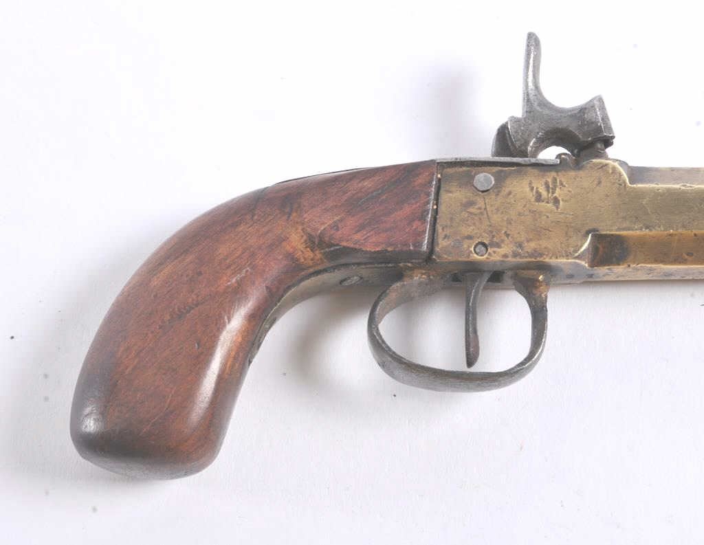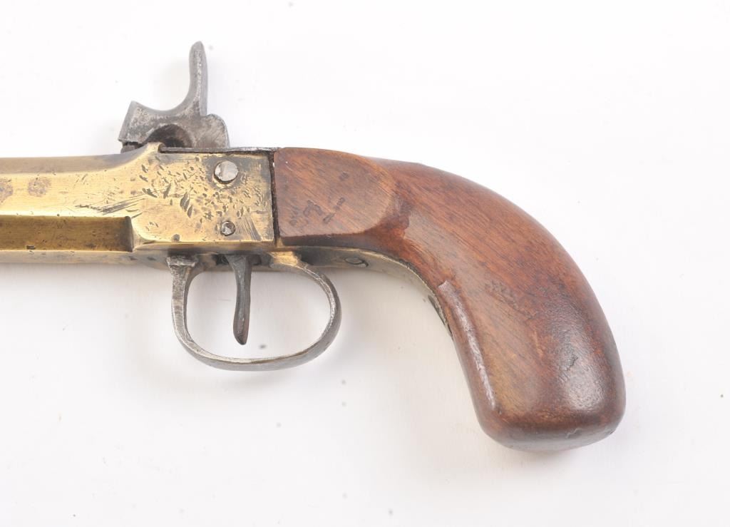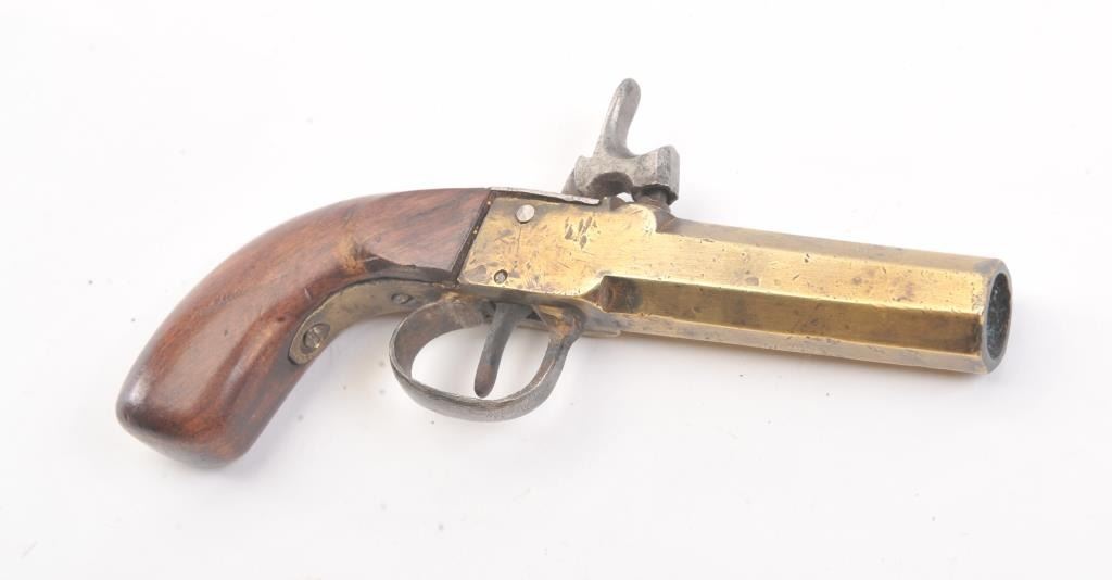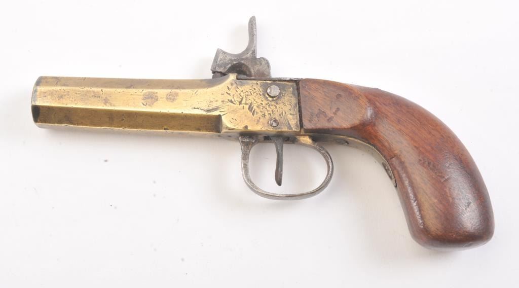 Percussion pocket pistol with brass frame and barrel circa about 1850. Probably Belgium but unmarked. Measures 7 1/4" overall with a 2 3/4" barrel of approximately .60 caliber smooth bore. The lock is working. Fair togood overall showing marks in brass. (Antique) Est.: $150-$300