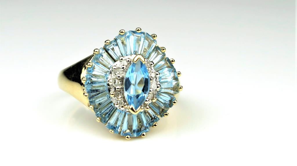 Beautiful Ballerina Style Blue Topaz and Diamond Ring featuring marquise and baguette cut Topaz accented with round Diamonds total carat weight approx. 4.00 carats set in 10 karat yellow gold. Estimates $800-$1,200