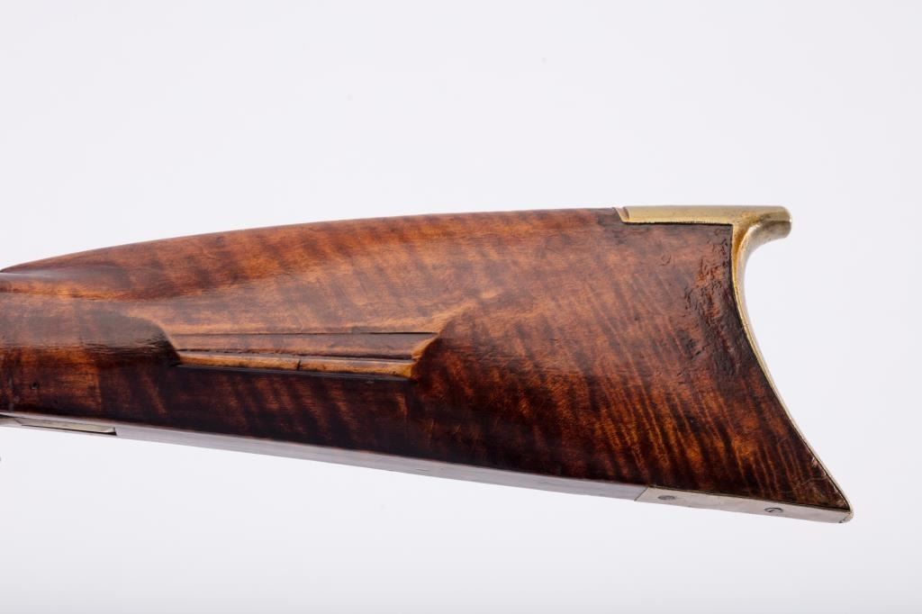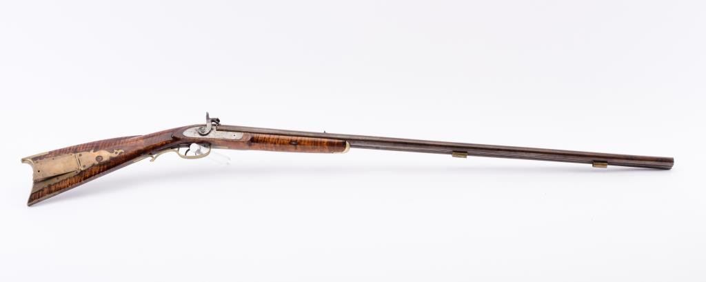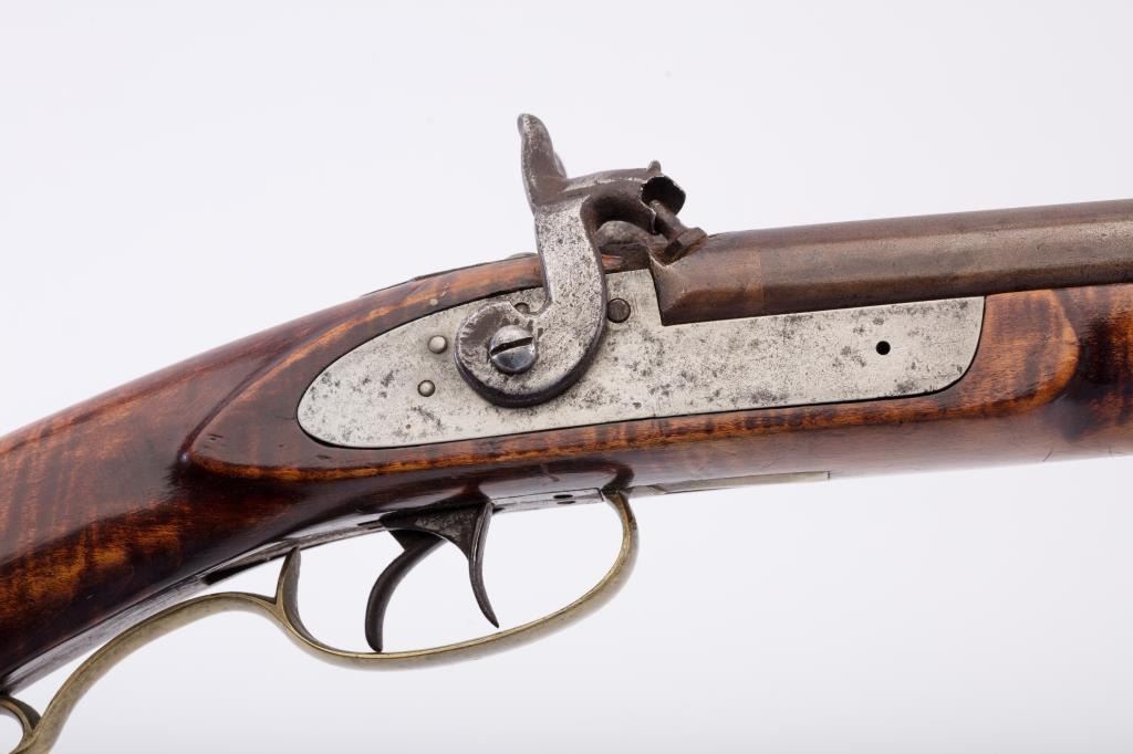 American Kentucky Double Barrel Buck and Ball gun with artificially striped stock and large “whale’s tail” type patch box. Measures 53” overall with 38” barrels of approximately .60 caliber smoothbore barrels. V notch and bead sights. The rib and barrels show old repair and re-soldering probably during period of use. The stock is very good with most restored violin type varnish. The front of right hammer shows a break and lossand in not coking (Mainspring broken or missing). The left hammer cocks and works well. The locks have been lightly cleaned and no ramrod is included. From an old Northern California gold rush area collection.(Antique) Est.: $700-$1400