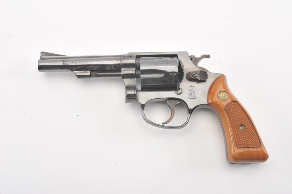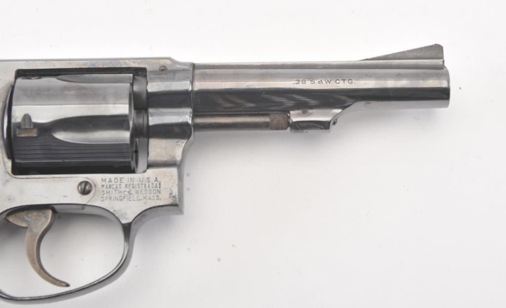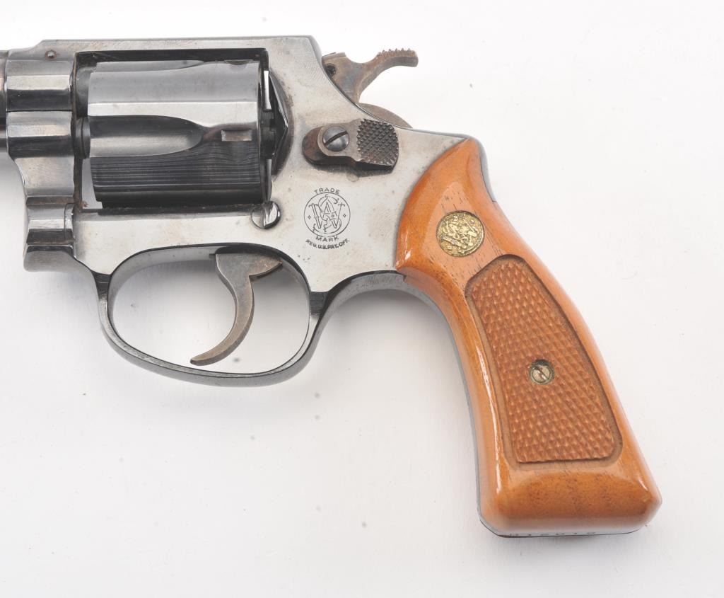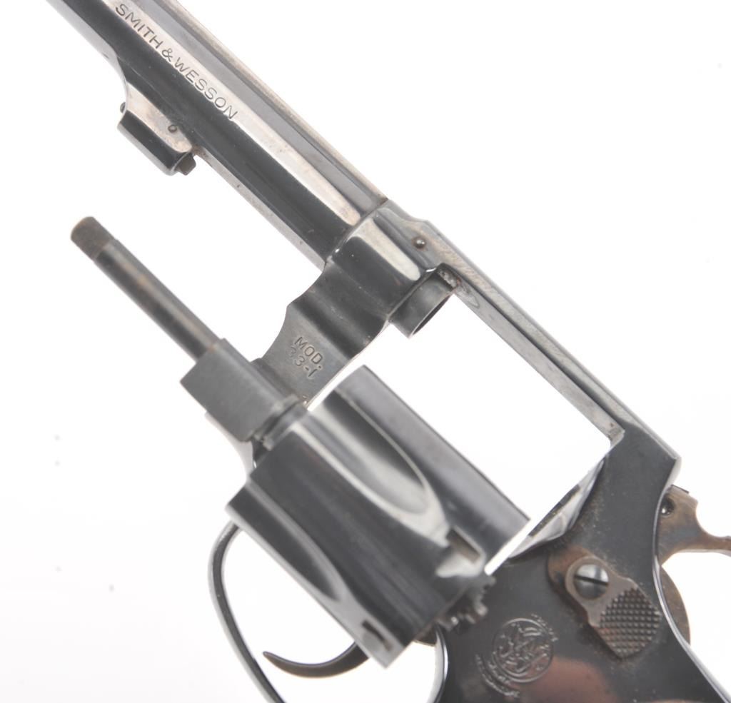 Smith & Wesson Model 33-1 DA revolver, #R12016, .38 S&W caliber, 4” barrel, blued finish, checkered wood medallion grips. Gun is in near fine condition overall, with slight muzzle wear, light scratches and minor freckling on the backstrap. Bore is bright, action is very good, grips are fine. (C&R/PPT). Est.: $400-800