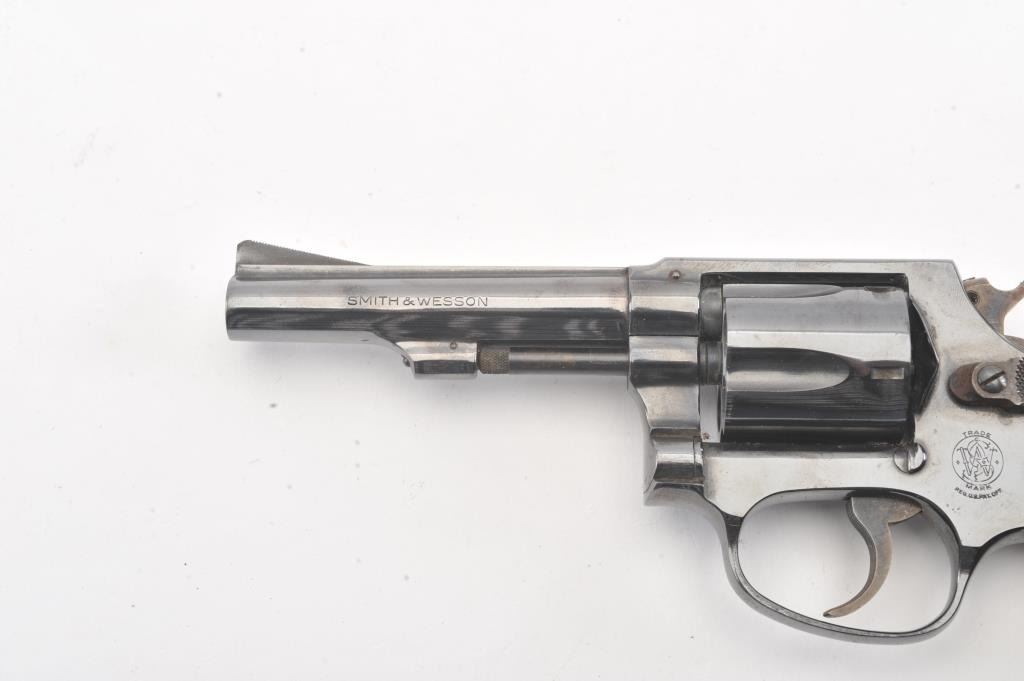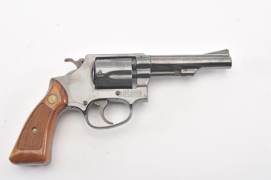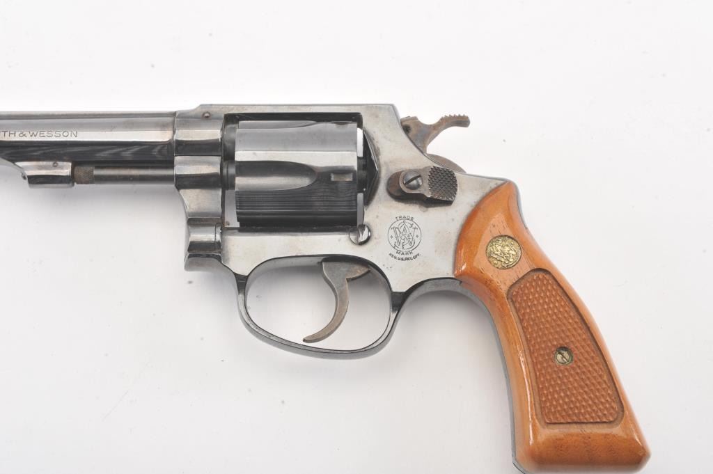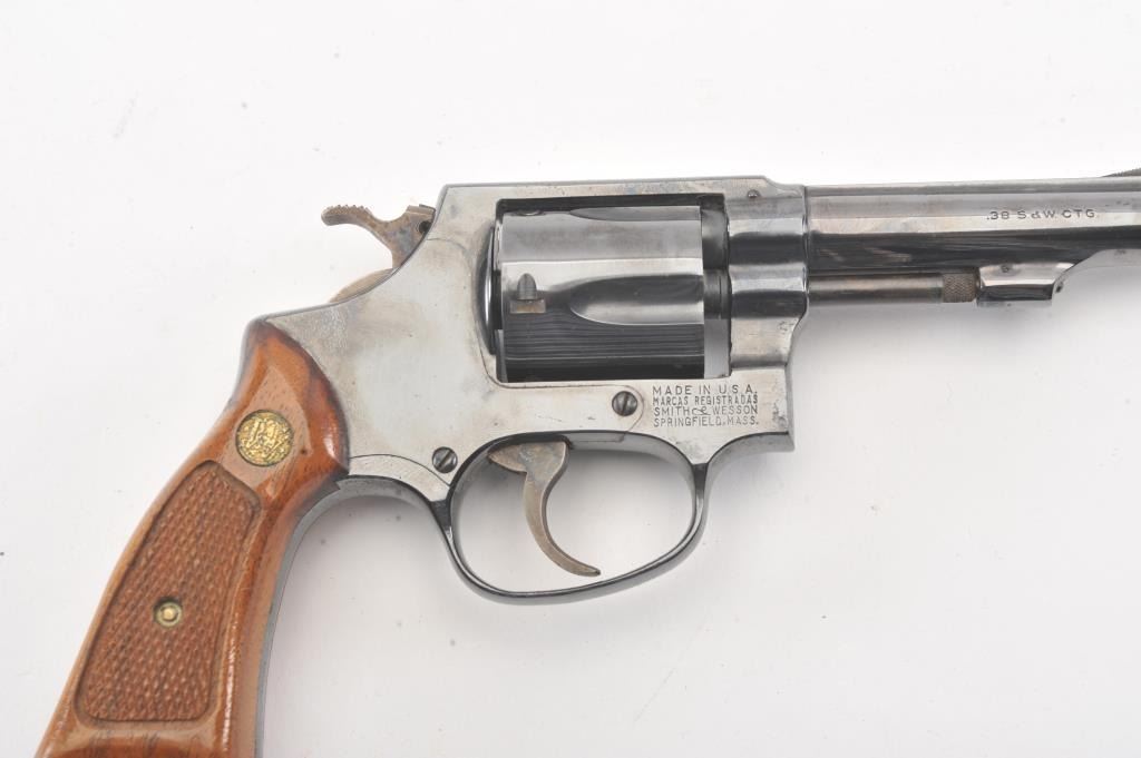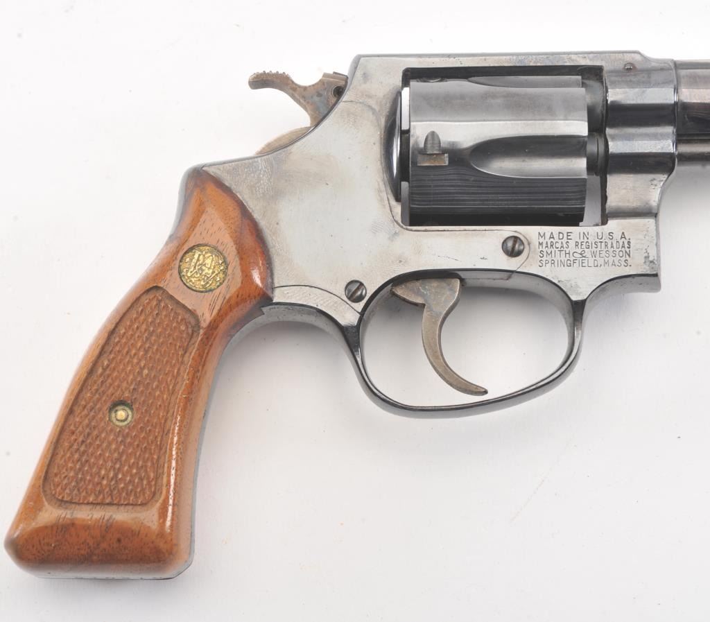 Smith & Wesson Model 33-1 DA revolver, #R12016, .38 S&W caliber, 4” barrel, blued finish, checkered wood medallion grips. Gun is in near fine condition overall, with slight muzzle wear, light scratches and minor freckling on the backstrap. Bore is bright, action is very good, grips are fine. (C&R/PPT). Est.: $400-800