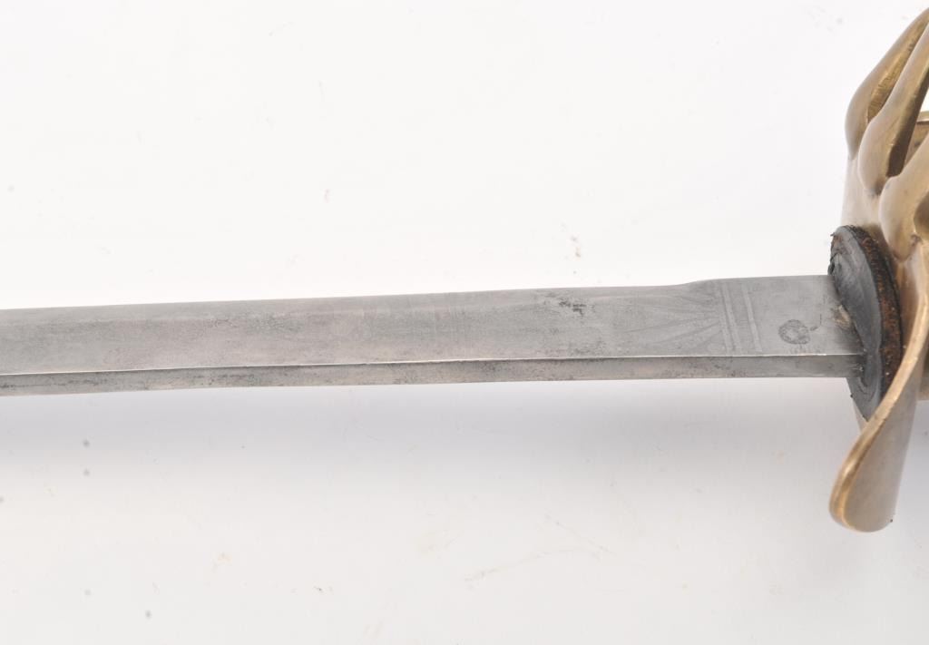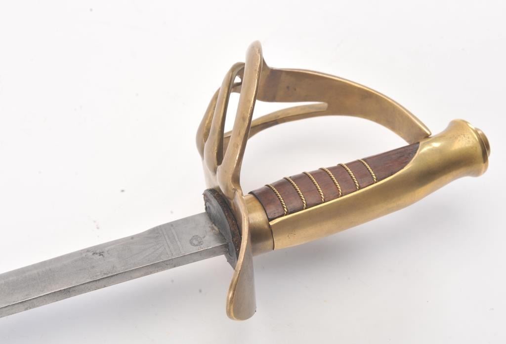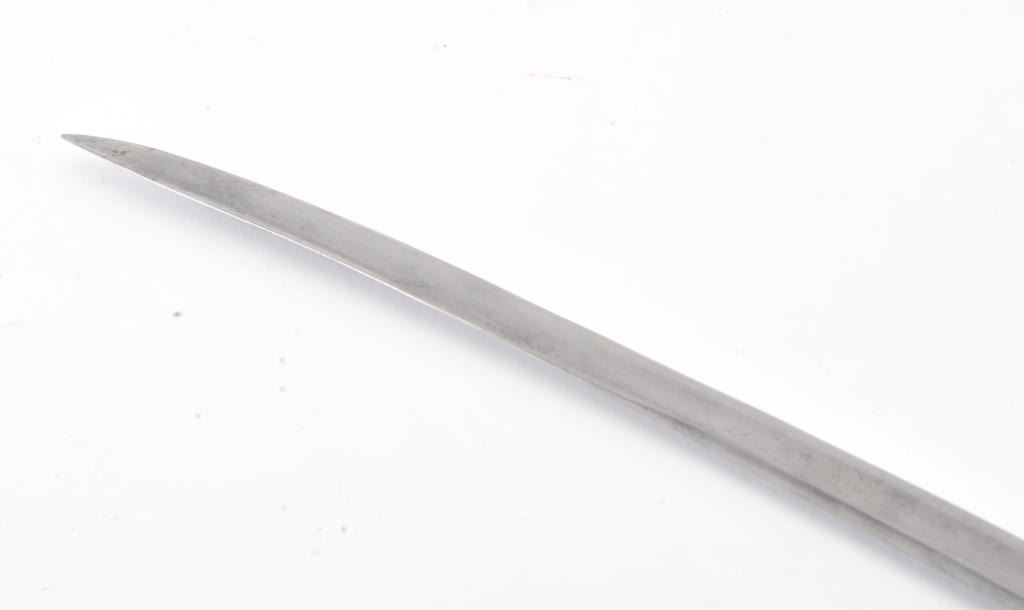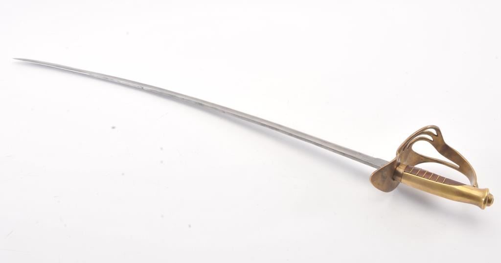 Older very good quality reproduction of fancy Confederate Civil War presentation sword attributed to English fakers with English etched blade and showing inscription “G.M. Moody, Morengo rifles, Alabama” and “C.S.A.”on the reverse. Single wire wrapped wood grip with heavy cast guard in correct style. Measures 39 ½” overall with a 34” cavalry style blade. Some artificial aging. This type were the first pirated onto the U.S. marketin the 1960s and the 70s and many have do pass for authentic as the etching is well done and they have had time to “Season”. We have seen a similar example in a magazine article and 1 in a private museum. Est.:$300-$600