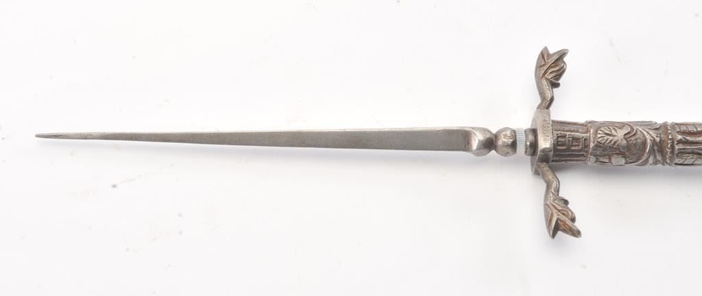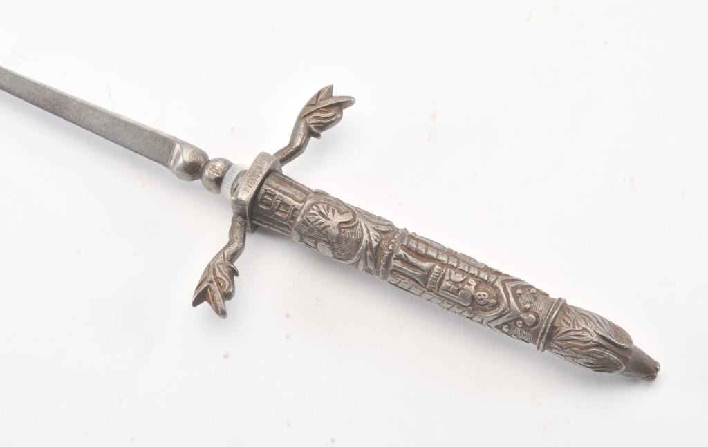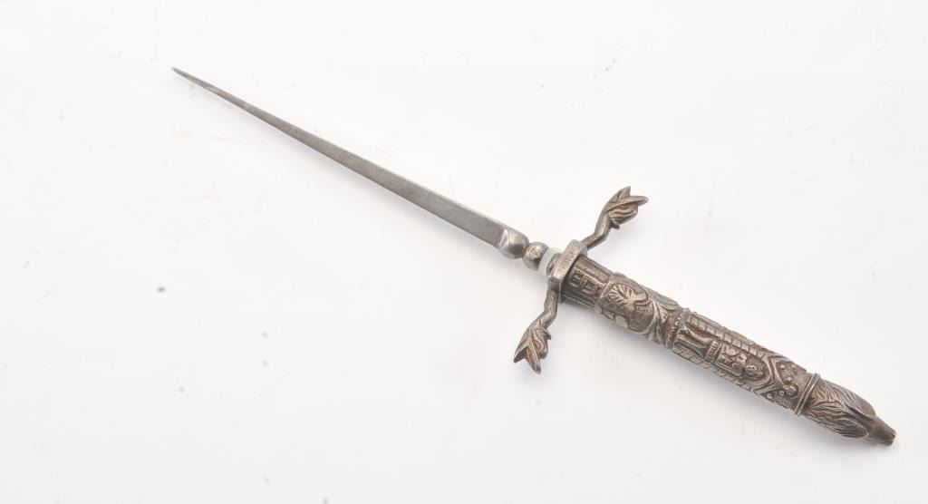 Interesting European dagger with triangular blade and chiseled steel hilt, grips and pommel. Measures 10 3/4" overall with a 6 1/4" blade. The pommel shows a dog head and the hilt shows stylized warriors withshields, scrolls and foliate decorations. The hilt shows birds head at each end. Lightly cleaned and in good condition. Circa 18th-19th century. Est.: $175-$350