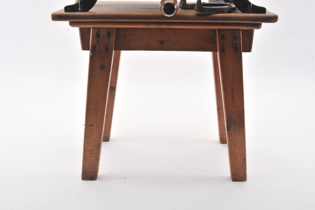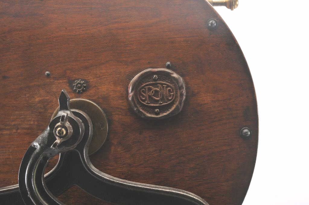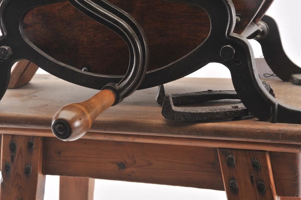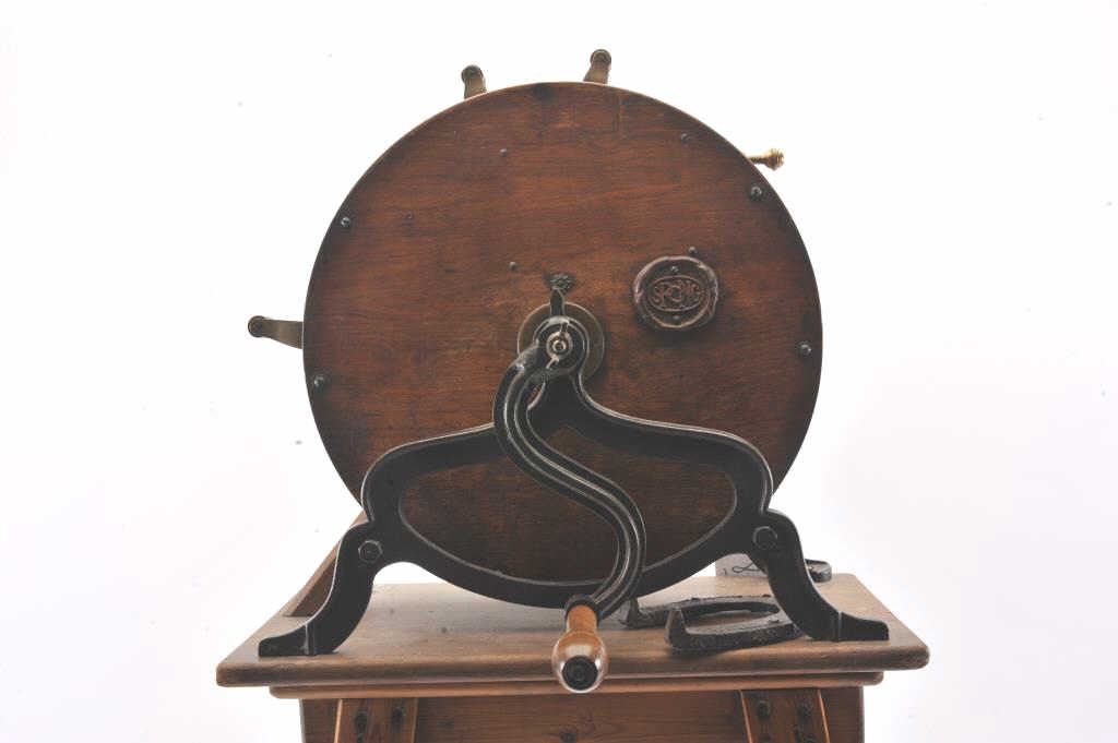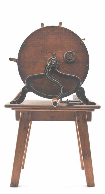 Antique knife sharpening wheel on wooden stand, brass and iron fixtures, by Spong; un-cleaned with great patina; approximately 37” in height, 20” wide and 16” deep. Est.: $150-$300.