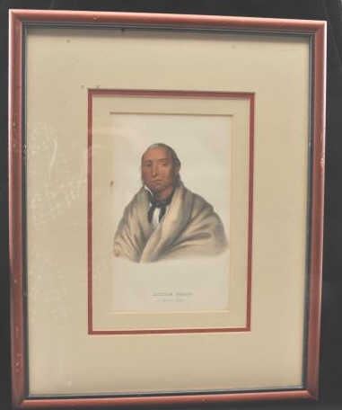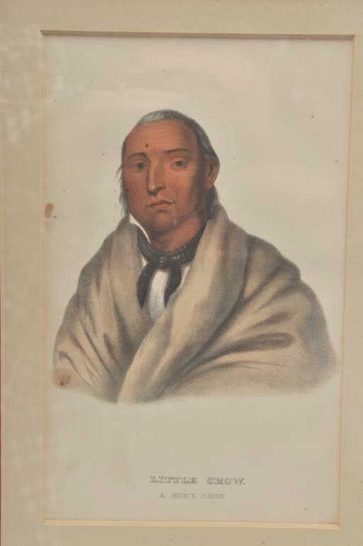 Hand colored 19th century litho titled "Little Crow, Sioux Chief" by McKenny & Hall. Taken from the book "Indian Tribes of North America 1854". Good with minor burns and aging. Measures approximately 5 1/2" x 9".Est.: $400-$800