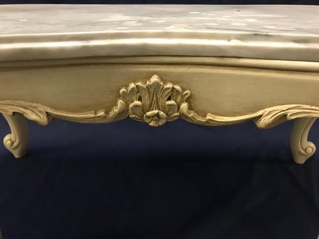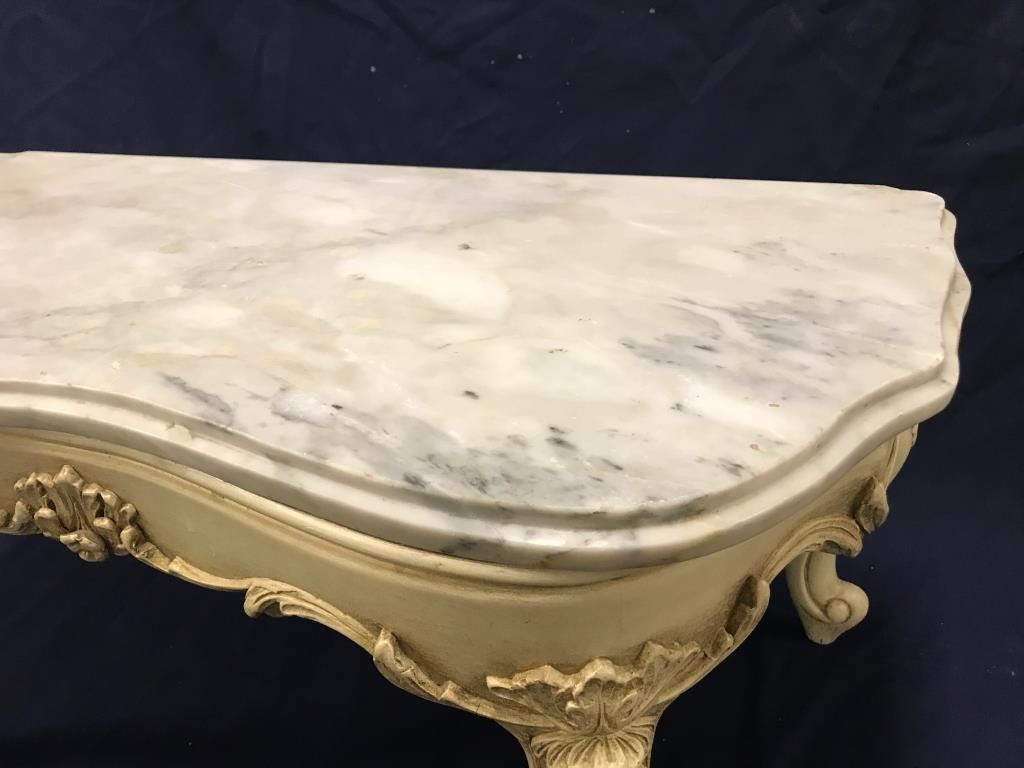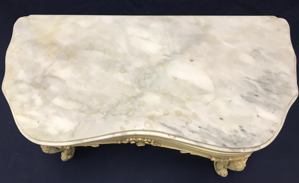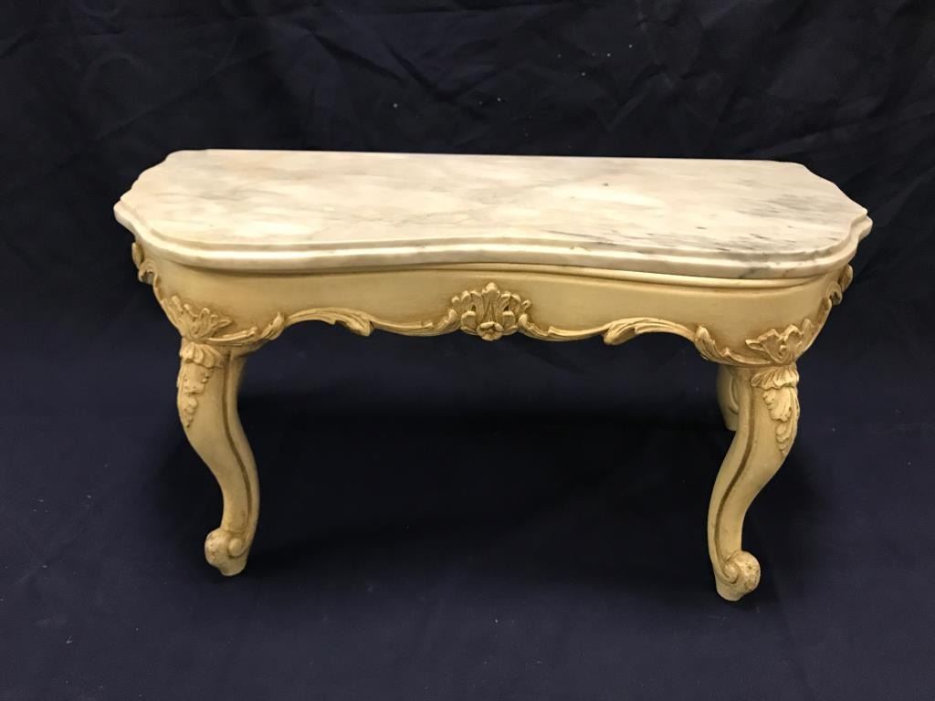 Vintage-style marble top small table; approximately 14” in height, 29” wide and 15” deep. Est.: $75-$150.