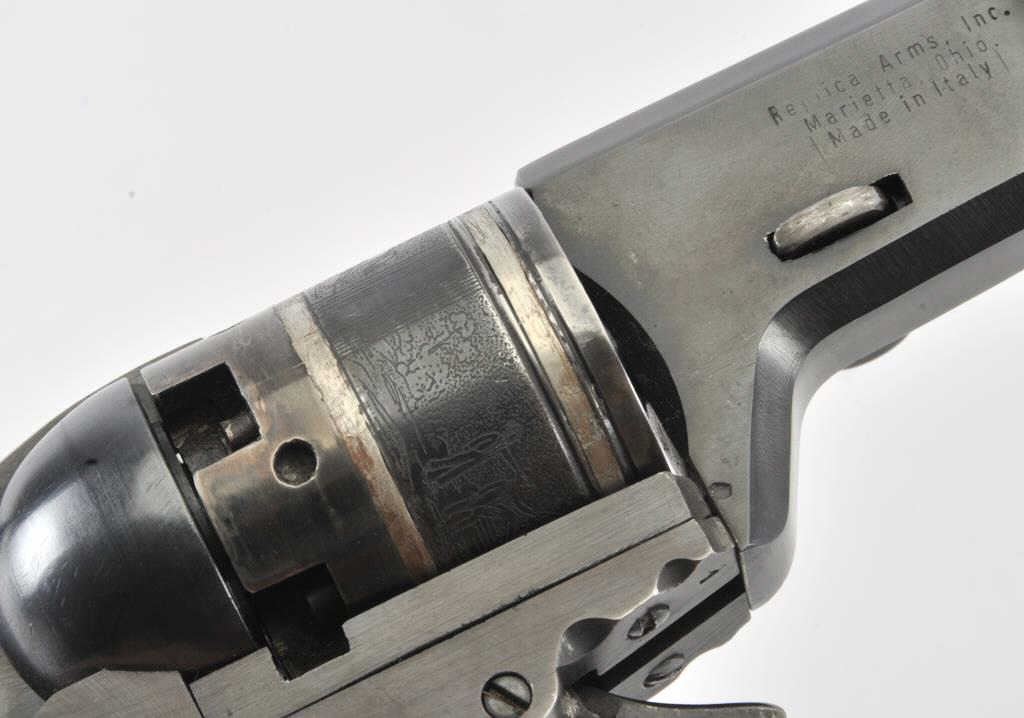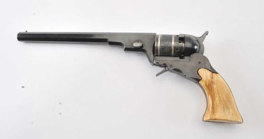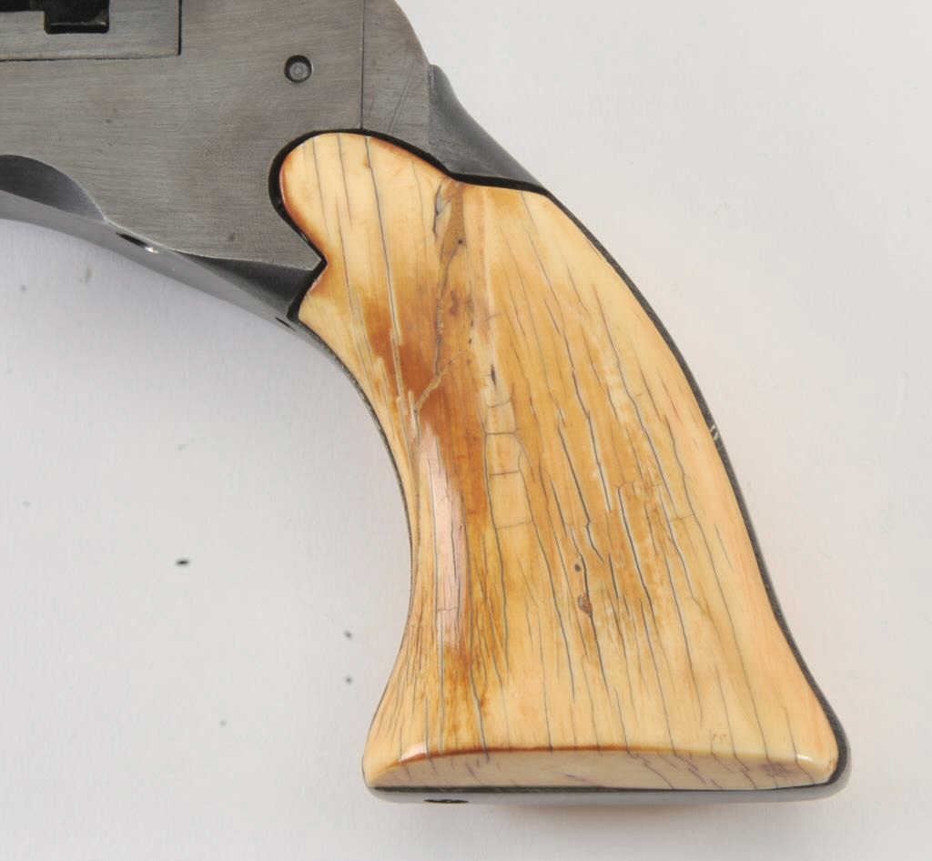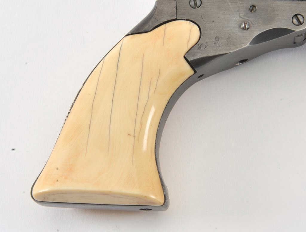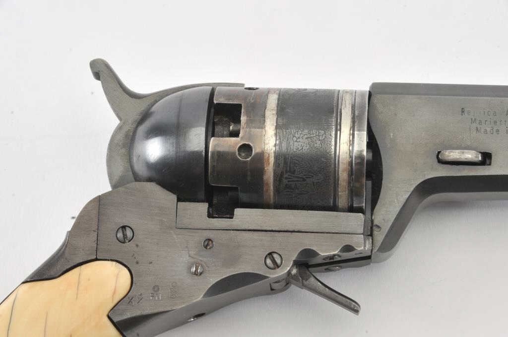 Early replica of Colt Texas Paterson .36 caliber revolver with 9” barrel and banded with ivory grips #1 showing Italian proofs. Purportedly Val Forgett’s personal Paterson made as fore runner to Navy Armsreproductions. Fine to excellent condition showing some minor use with “Antiqued” grips. Banded cylinder and great for display. (Percussion) Est.: $1000-$2000