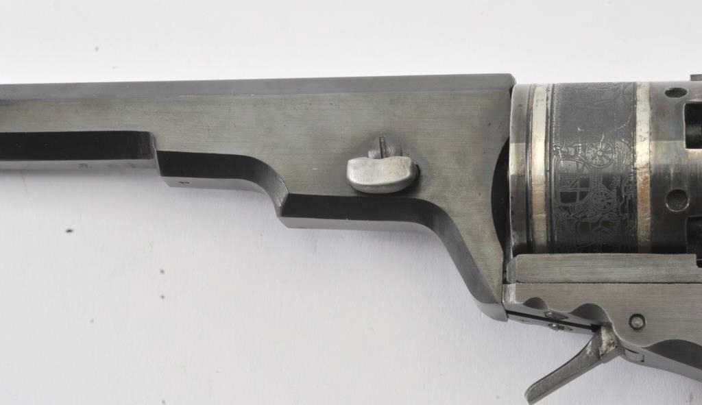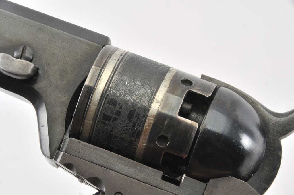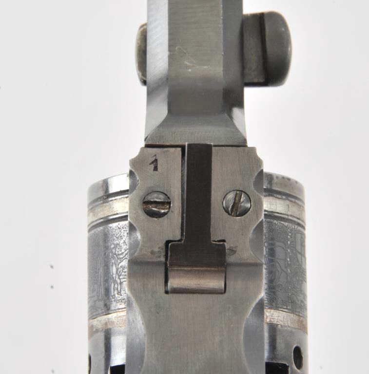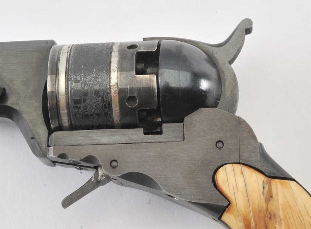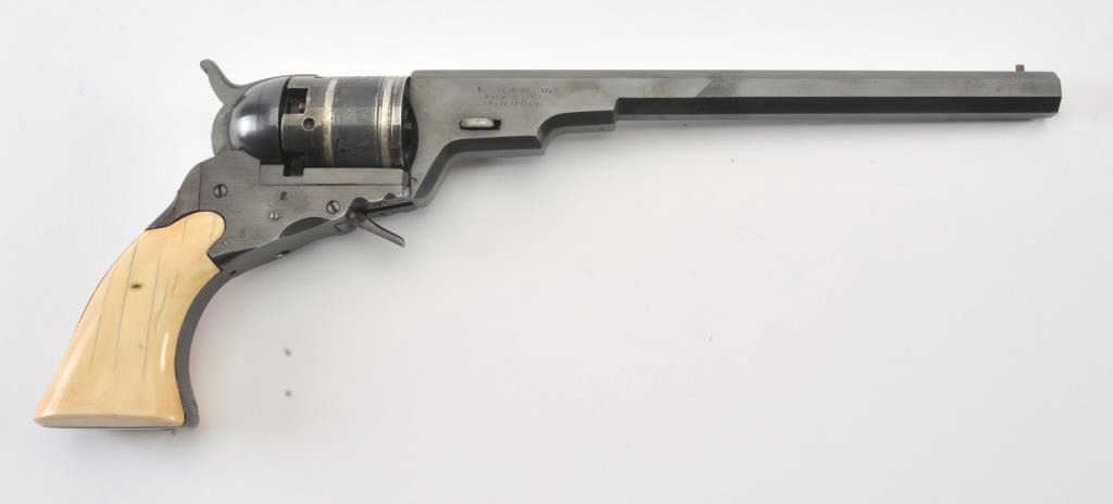 Early replica of Colt Texas Paterson .36 caliber revolver with 9” barrel and banded with ivory grips #1 showing Italian proofs. Purportedly Val Forgett’s personal Paterson made as fore runner to Navy Armsreproductions. Fine to excellent condition showing some minor use with “Antiqued” grips. Banded cylinder and great for display. (Percussion) Est.: $1000-$2000