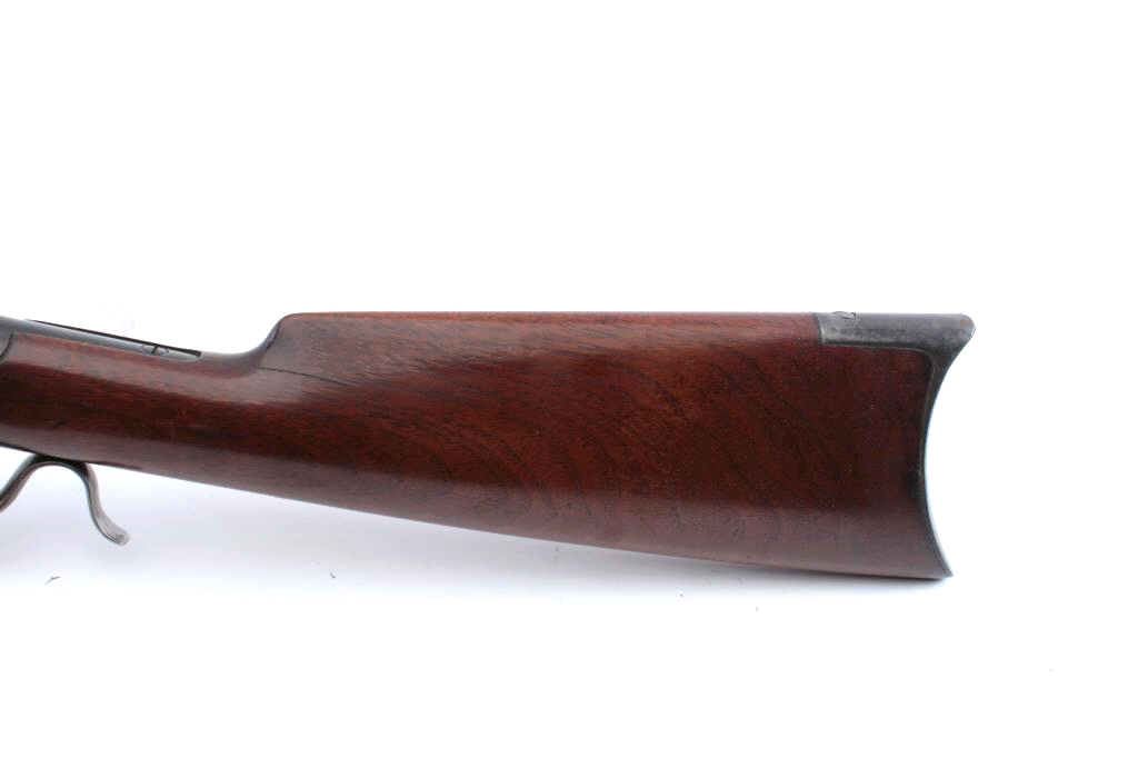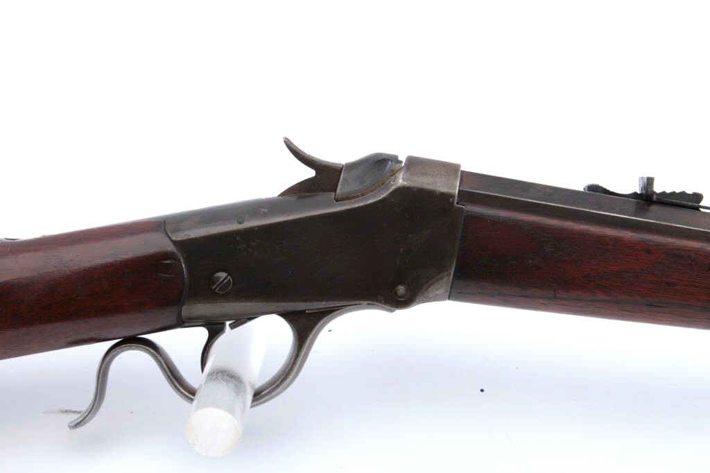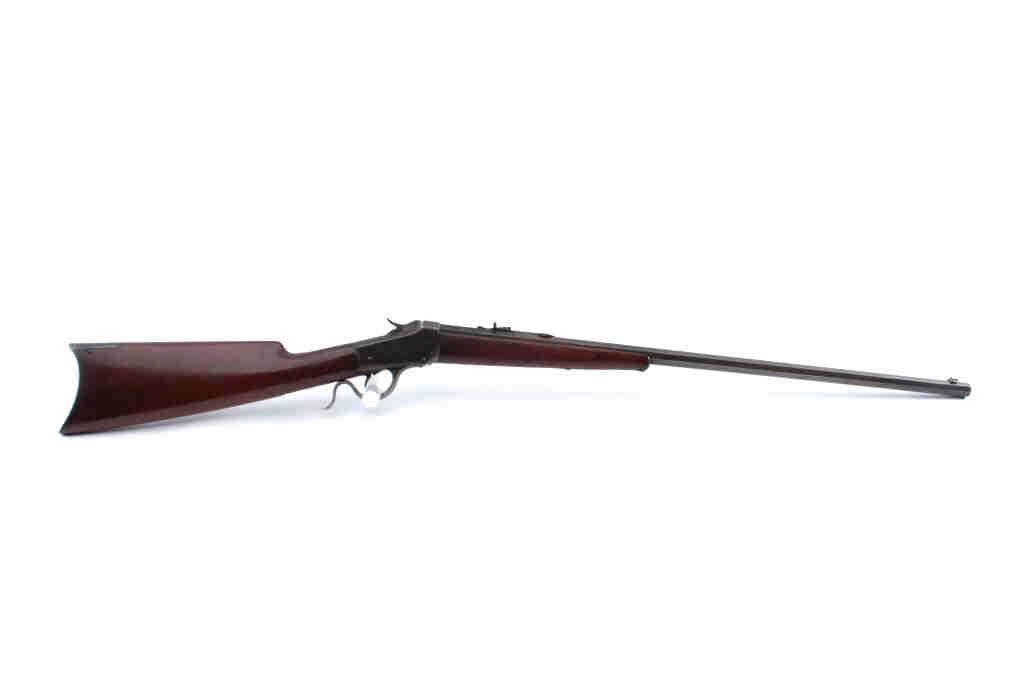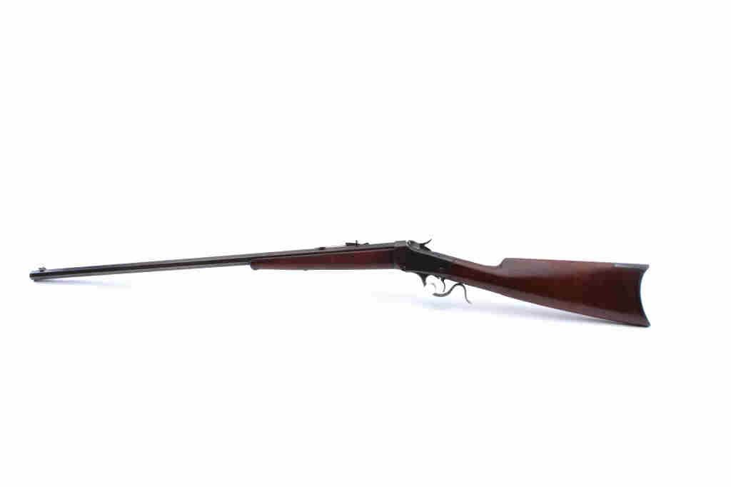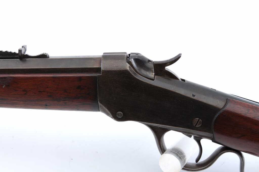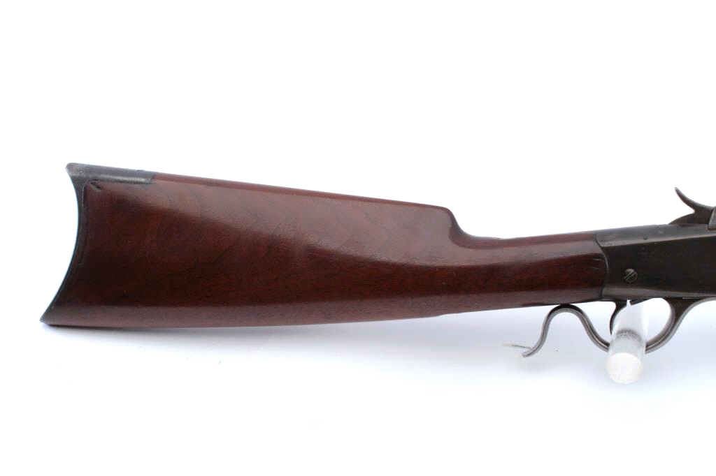 Winchester Model 1885 Low Wall single shot rifle, .32 WCF caliber, Serial #84114. The rifle is in very good overall condition with a 27” octagon barrel with a Beeches folding front sight. The barrel and receiver havegone to brown patina with sharp edges and crisp markings. The smooth wood stocks are in good condition with the butt stock a later replacement which is slightly proud at the tang and wrist. The butt ends with a smoothsteel crescent butt plate. The bore is fair, the action is crisp and the markings are sharp on this Low Wall, desirable in the .32 WCF chambering. Est.: $500-$1,000. (Antique).