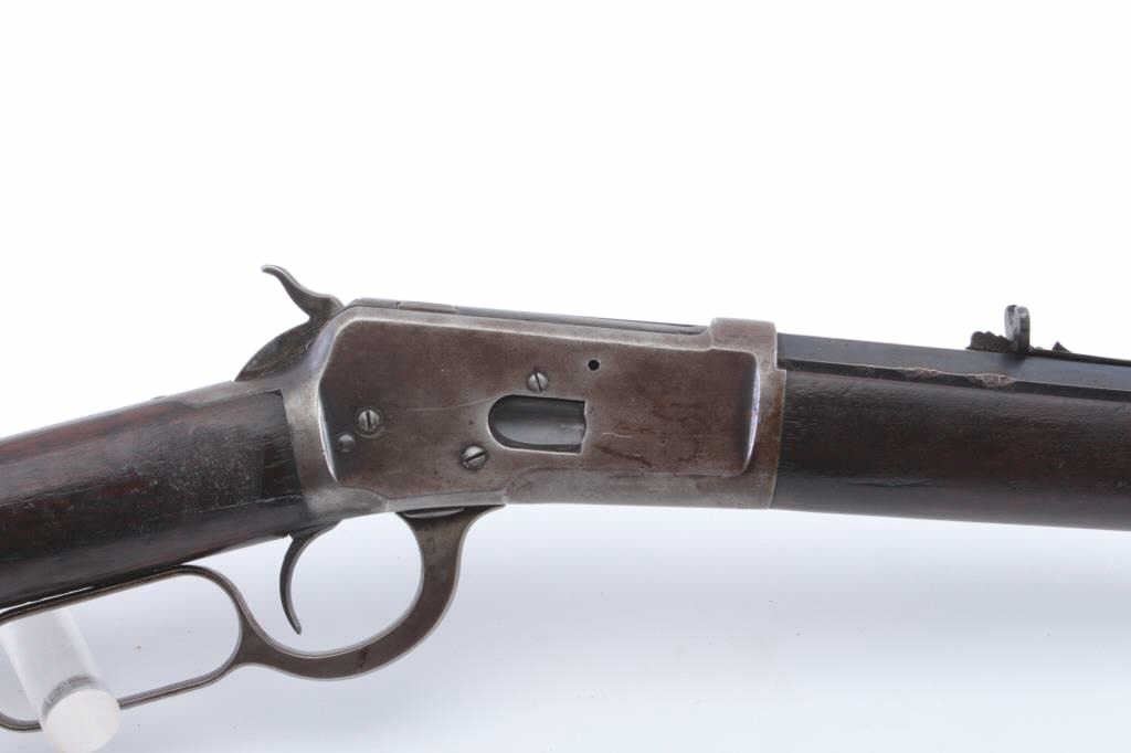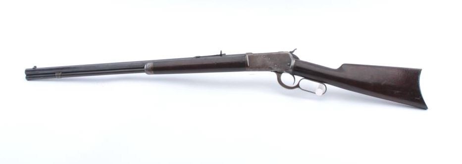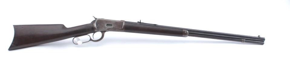 Winchester Model 1892 lever action rifle, .25-20 WCF, Serial #229620. The rifle is in good overall condition with a 24” octagon barrel and a full-length magazine. The barrel and magazine retain a significantamount of original blue finish with sharp edges, scratches and some knackering near the front ring. The receiver has gone to a grey/brown patina with dull case hardening on the hammer, trigger and protected areas onthe lever. The loading gate shows dull blue finish. The smooth wood stocks are in good condition with an extra coat of lacquer and small lateral cracks on both sides of the wrist. The butt ends with a smooth steelcrescent butt plate. The bore is fair, the action functions and the markings are legible. Est.: $700-$1,400. (C+R).