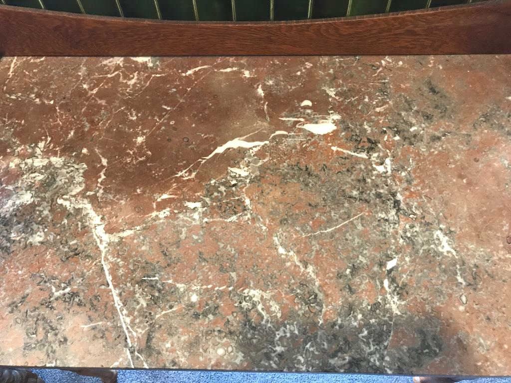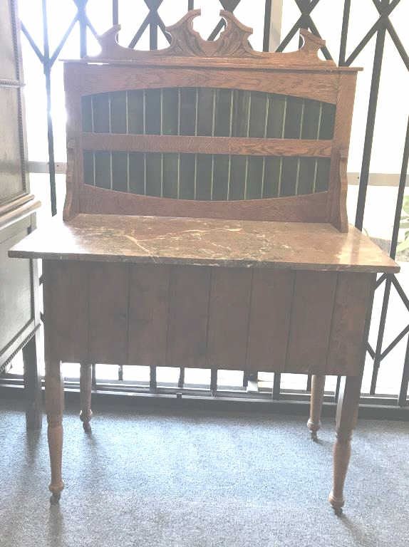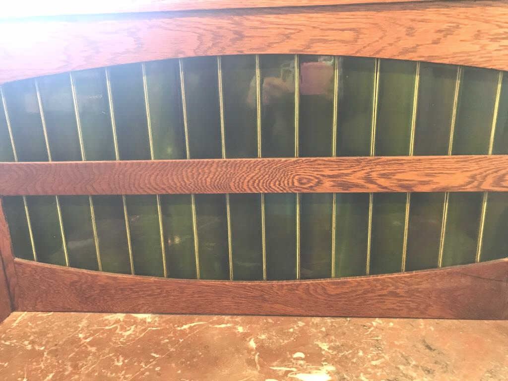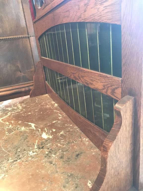 Vintage oak sideboard with marble top and green tile back splash; approximately 54” in height, 3 feet wide and 18.5” deep. Est.: $200-$400.