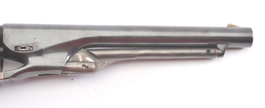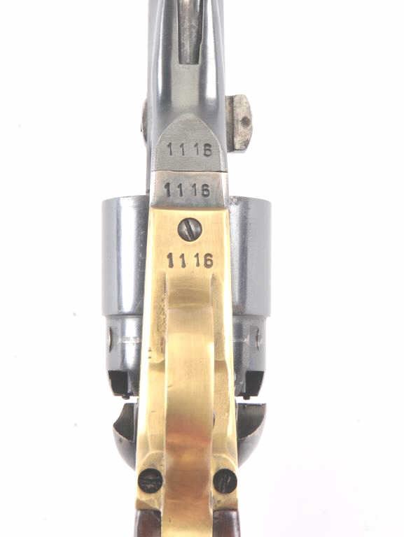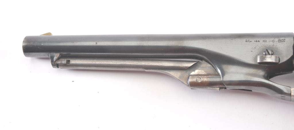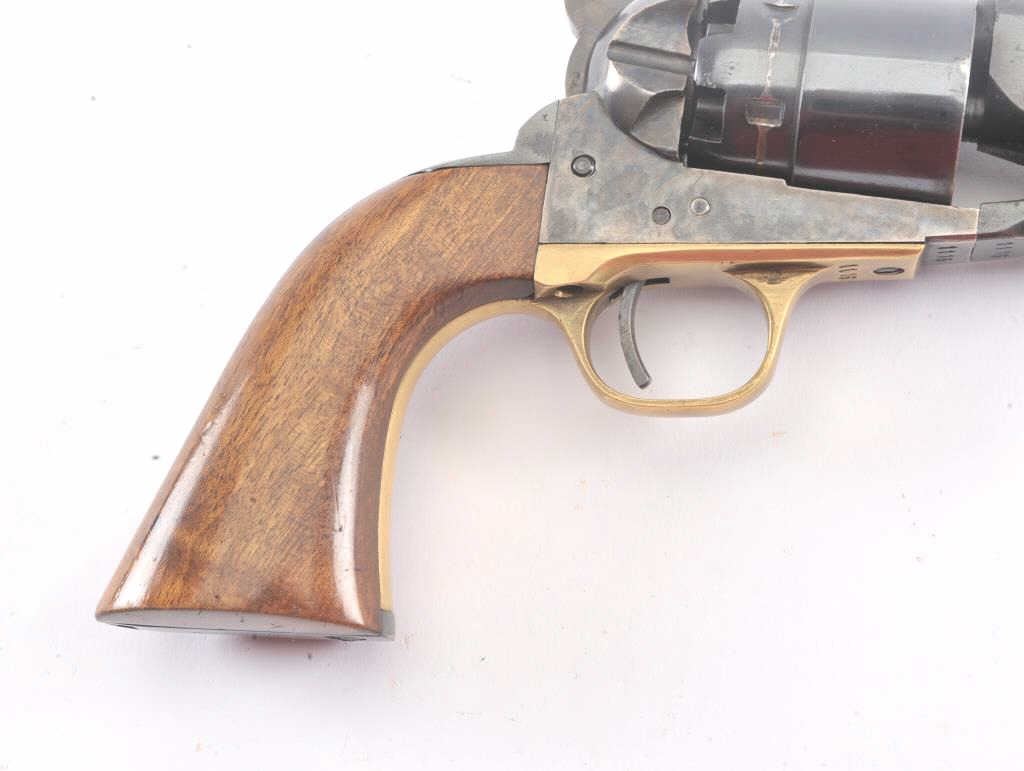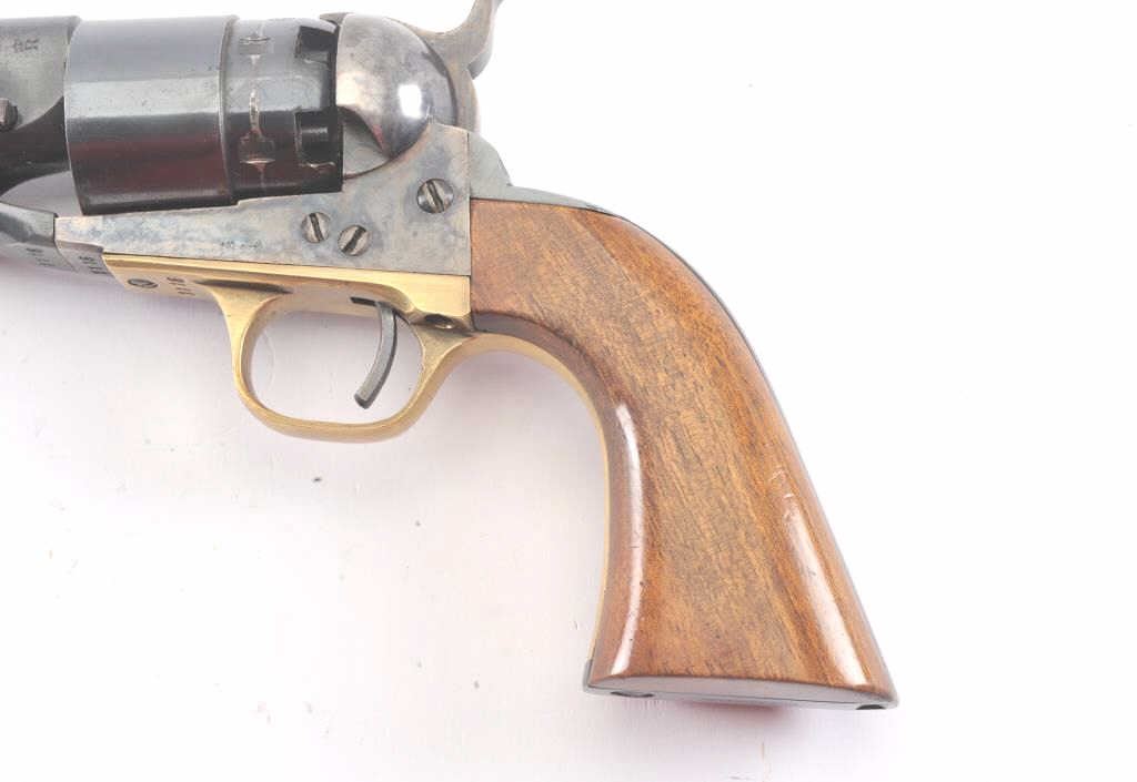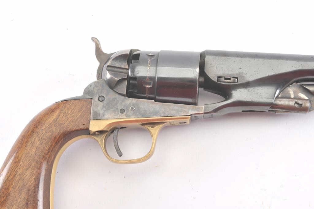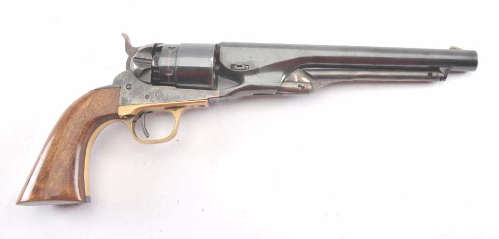 1960 New Model Army percussion revolver, .44 caliber, Serial #1116. The pistol is a Belgian copy of a Colt 1860 Army revolver with an 8” barrel in fine overall condition. The barrel and cylinder retain nearly all of their blue finish with vivid case hardening on the frame, hammer and trigger. The smooth wood grips are in very good condition and marked, “MADE IN BELGIUM” at the butt. The barrel address reads, “1960 NEW MODEL ARMY”. Est.: $300-$600.