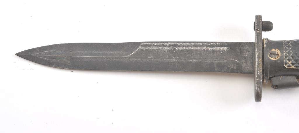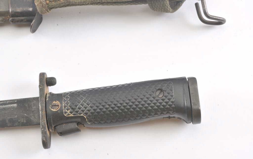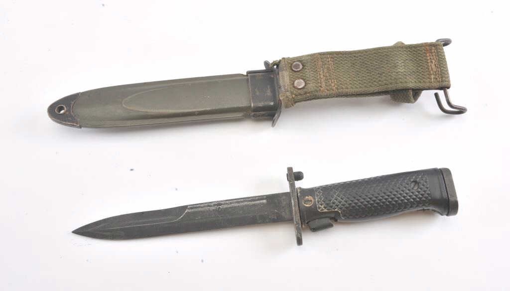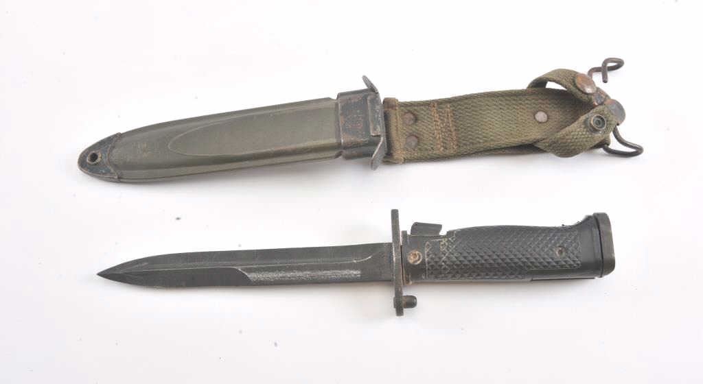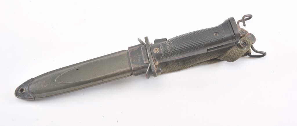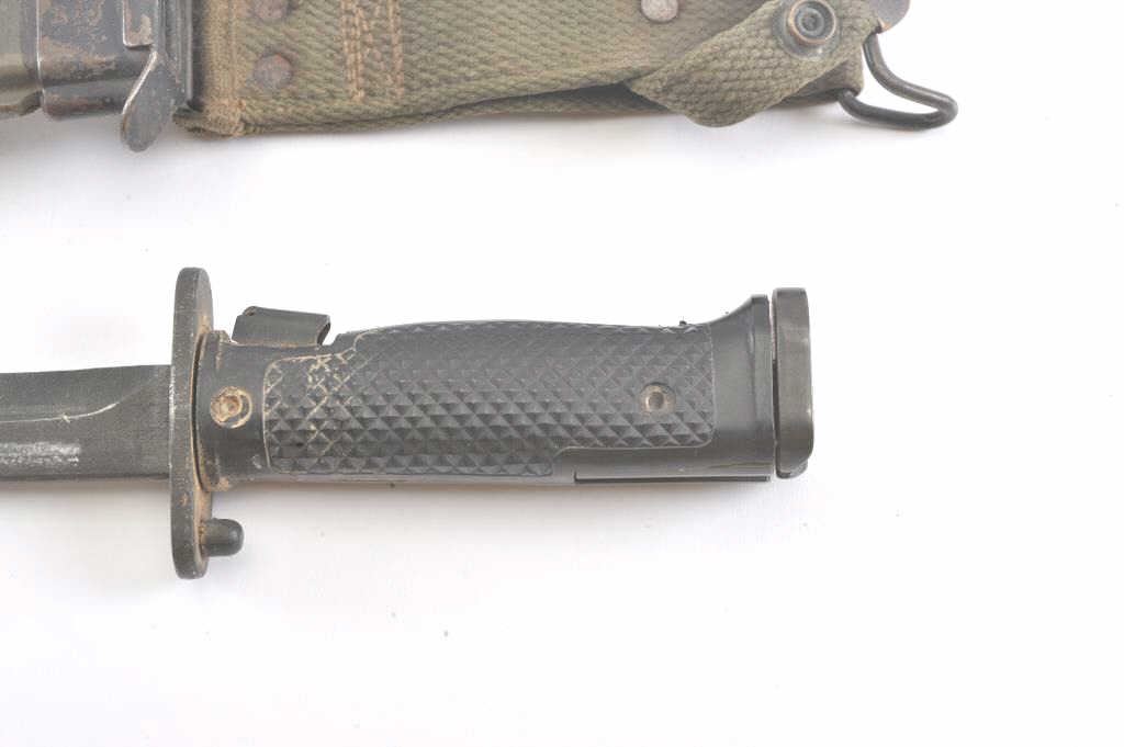 US M5A1 bayonet with a US M8 scabbard. The bayonet is in good overall condition and has not been sharpened. The scabbard is also in good condition with the OD green canvas hanger intact. Est.: $75-$150.