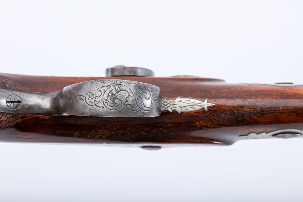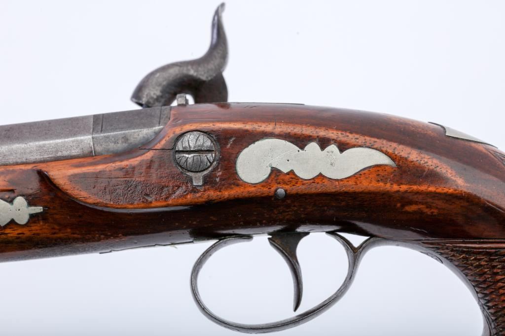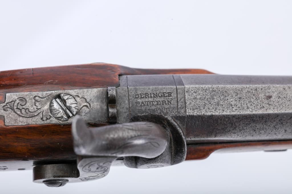 Intriguing Philadelphia style percussion derringer marked “Deringer Pattern Patent” on the lock and “Deringer Pattern” on the breech. Measures 7 ½” overall with a 3 ¾” rifled barrel of approximately .44 caliberwith iron trigger guard and plain non-engraved German silver mounts. Light scroll engraved hammer and lock. The escutcheon around single lock screw resembles Slaughter. Slaughter was key witness atlegal trail and this may have been his pattern or model. No proofs and American made. Really interesting. (Antique) Est.: $3500-$7000