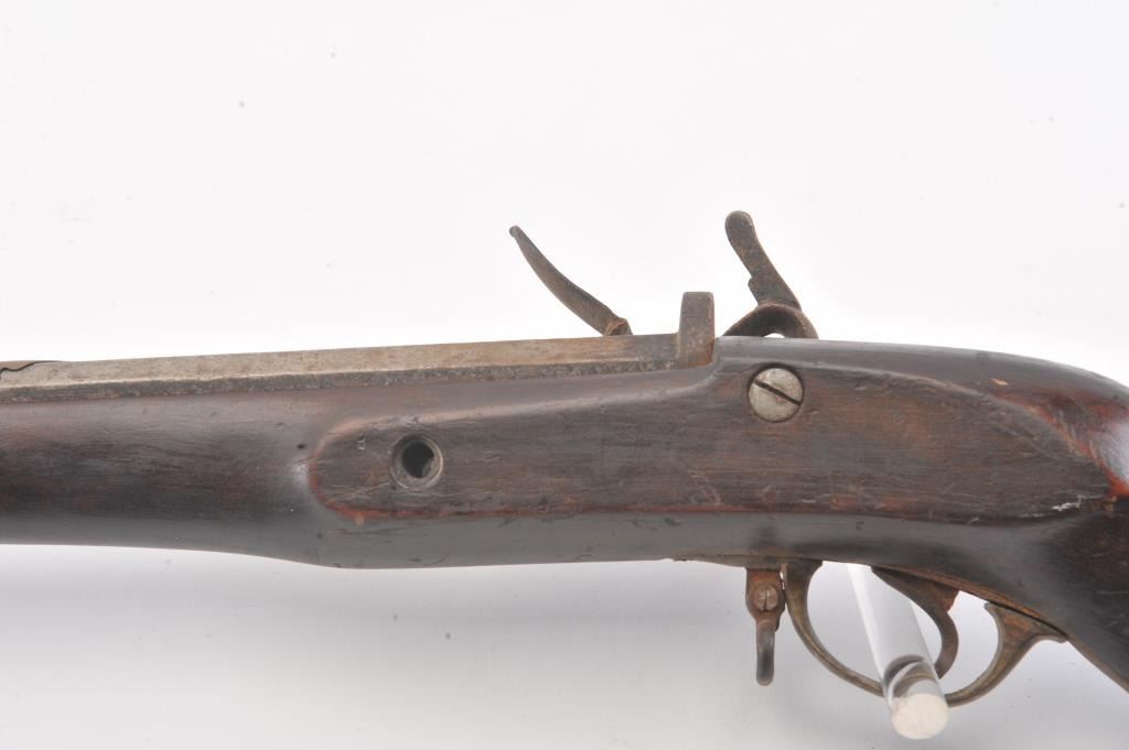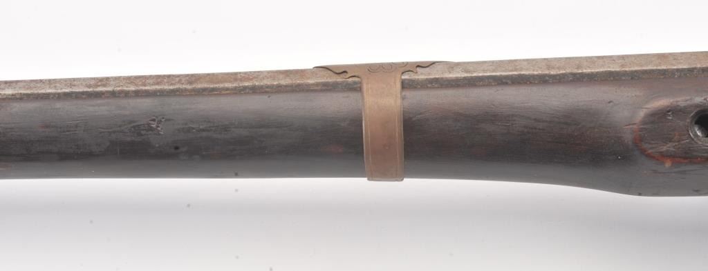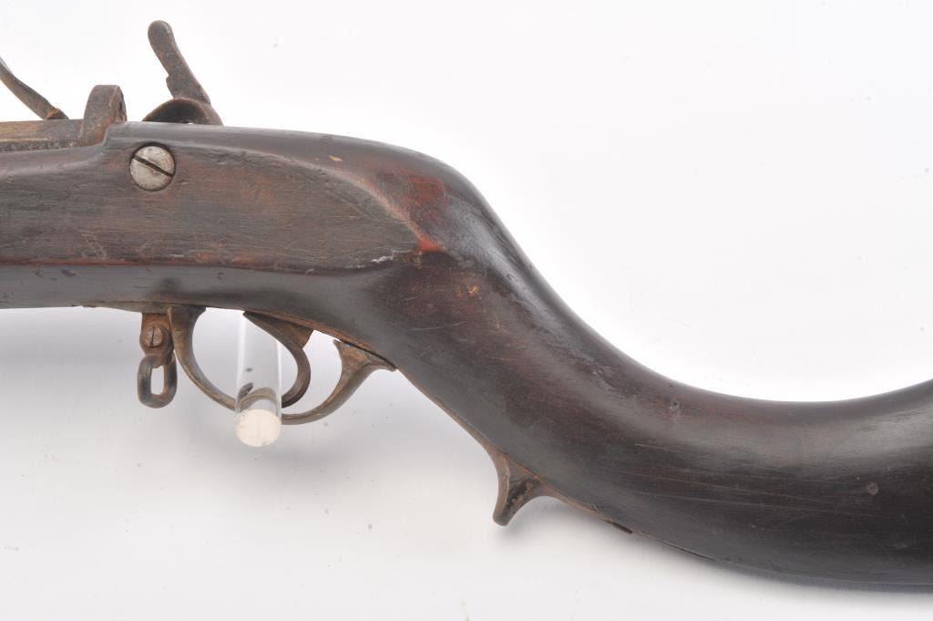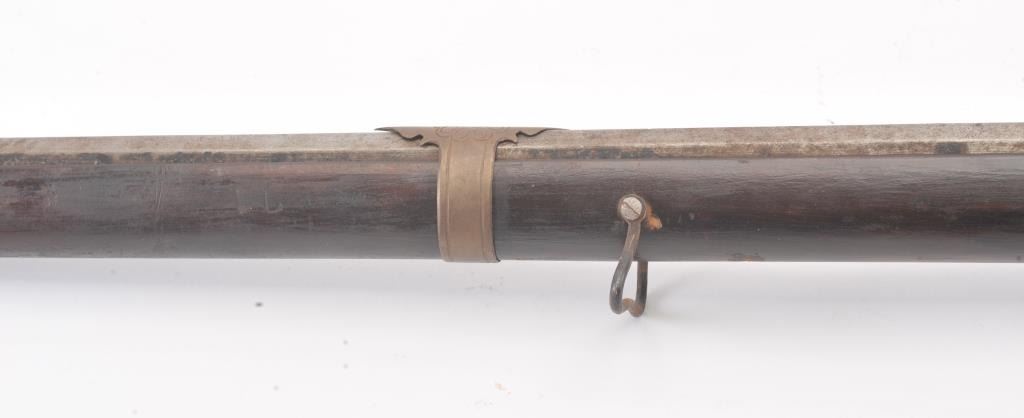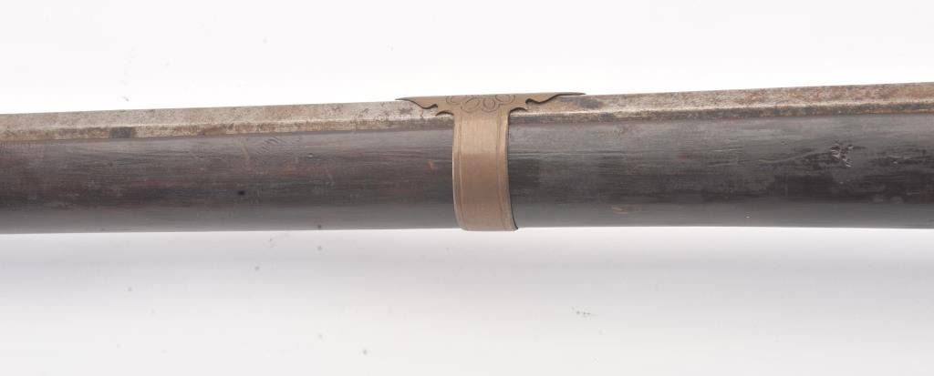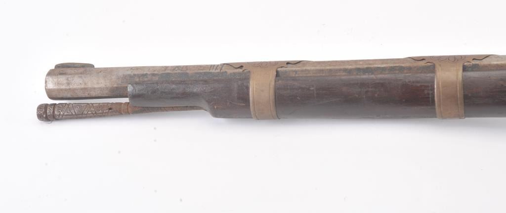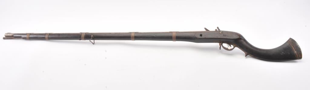 Flintlock mid-eastern camel gun, large caliber, 46-1/2” octagon barrel, full stock, lockplate dated 1807, un-cleaned condition with light coating of surface rust showing long storage, some minor parts missing; great character in appearance! (Antique). Est.: $150-$300.