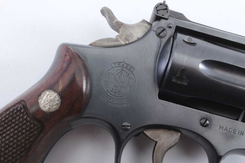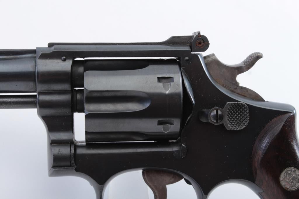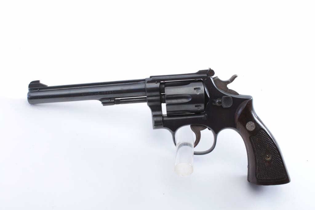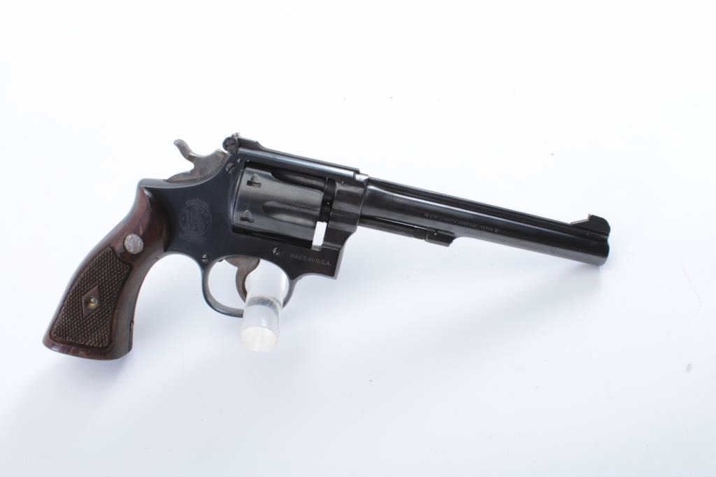 Smith & Wesson Model K-22 DA revolver, #K27073, .22 LR cal., 6" barrel, blued finish, adjustable sights, with checkered wood medallion grips. The revolver is in fine to excellent condition overall, showingapproximately 98% original finish, near fine bore, crisp action and markings, fine grips. The rear sight shows some light rust forming. Includes a two piece factory gold and blue cardboard box numbered to the gun. (C&R/PPT). Est.: $900-$1,800