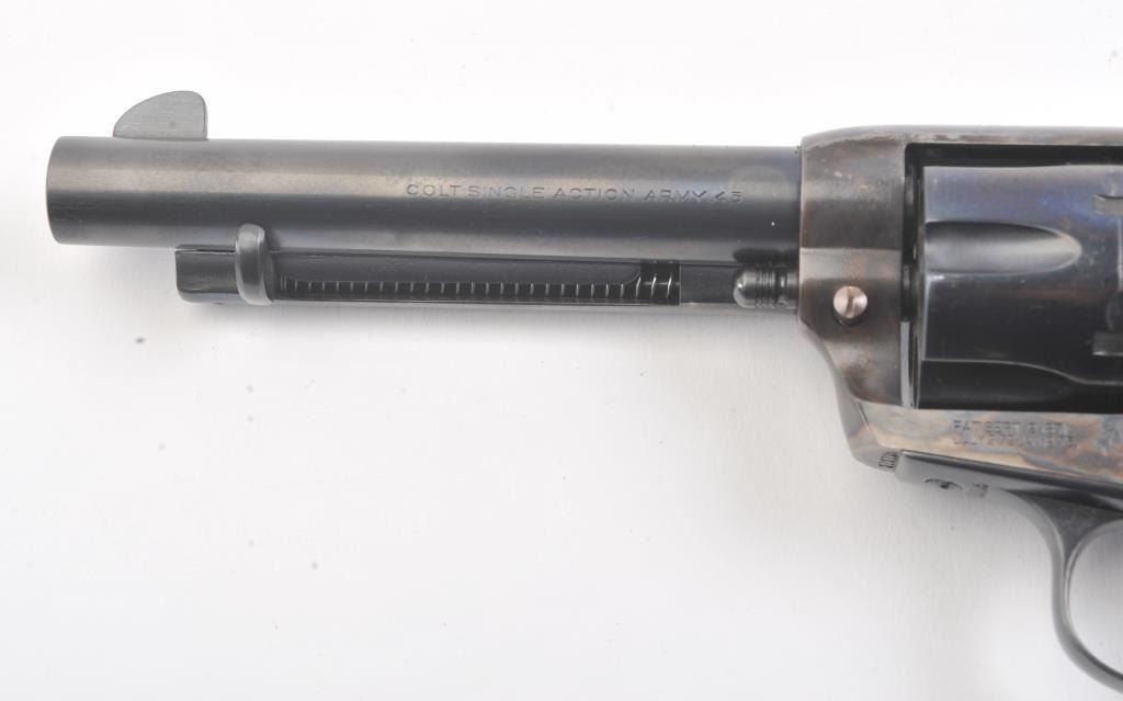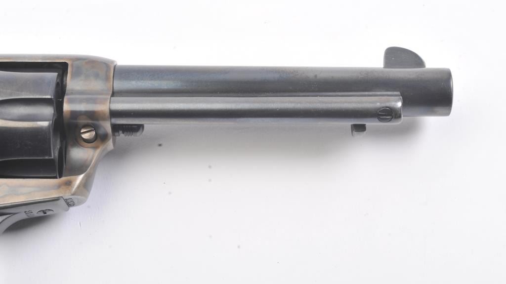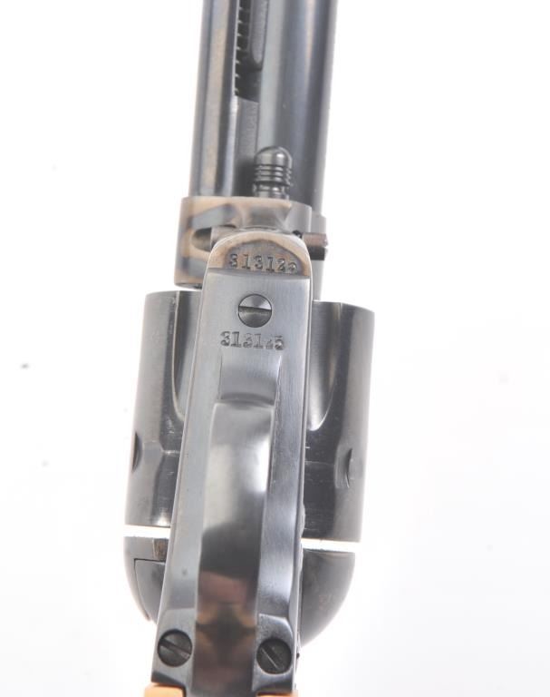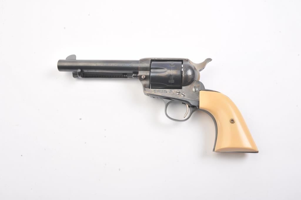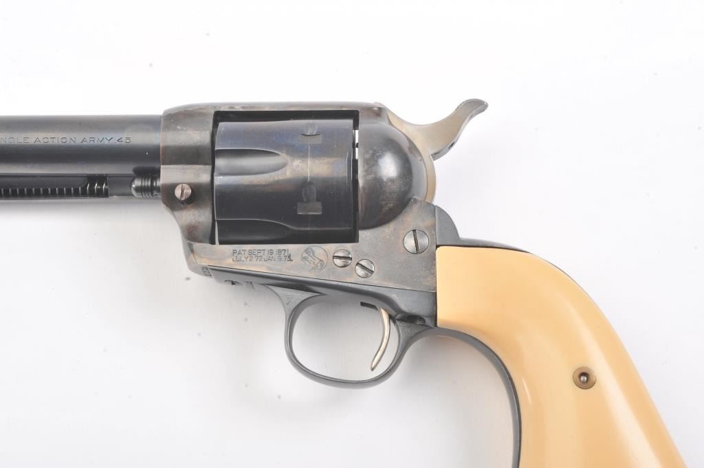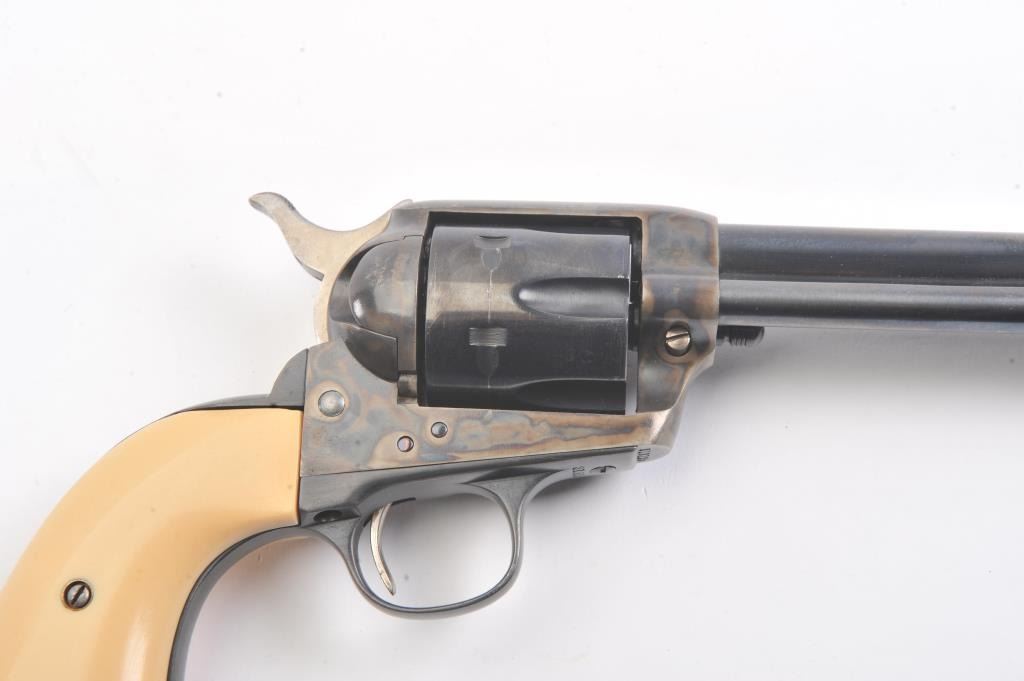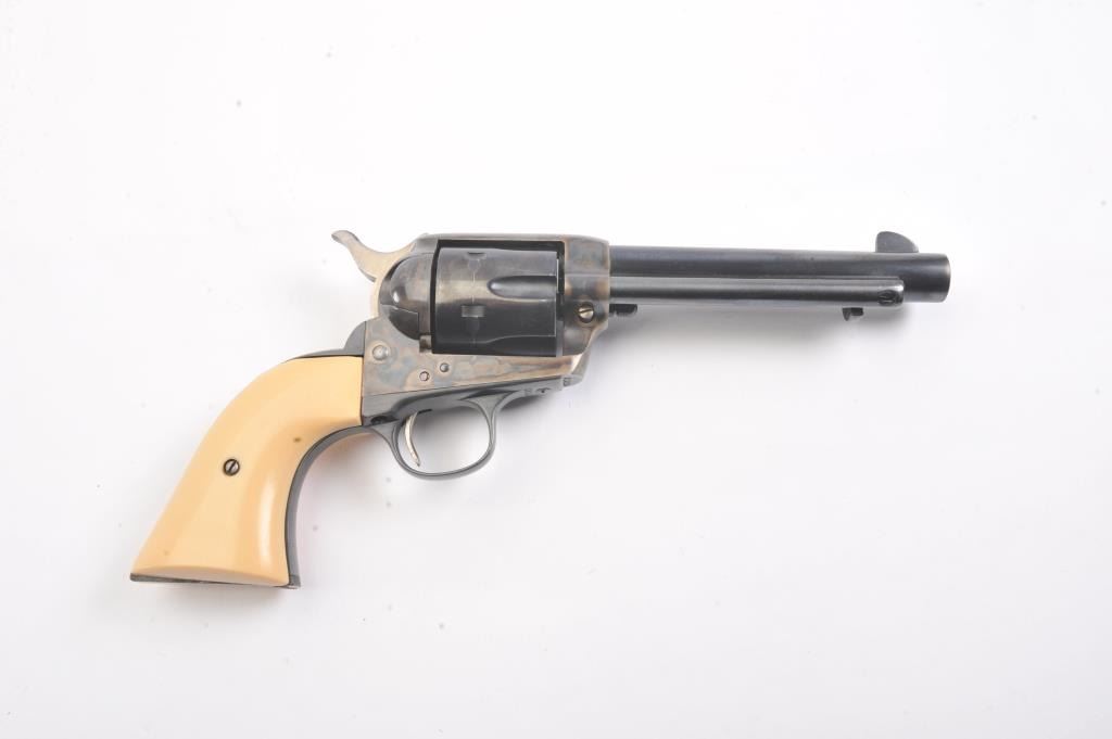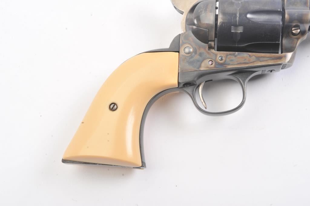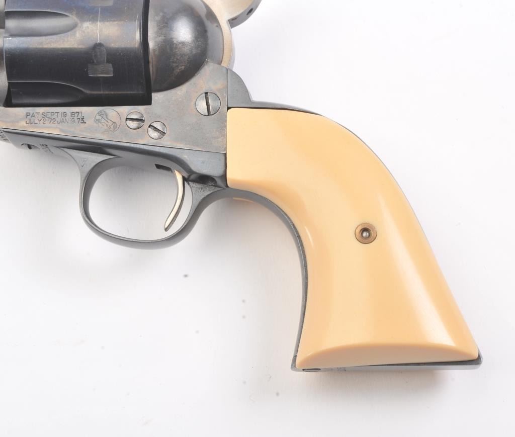 Colt SAA First Generation revolver, #313125, .45 Colt cal., 5-1/2” barrel, blue and case hardened finish, with faux ivory grips. This gun is in overall fine condition, as restored, approx. 95% reapplied blue finishon barrel assembly, cylinder and straps and approx. 95% case colors on frame, fine bore, crisp action, nice markings, fine grips. (C&R/PPT) Est.: $900-1800.