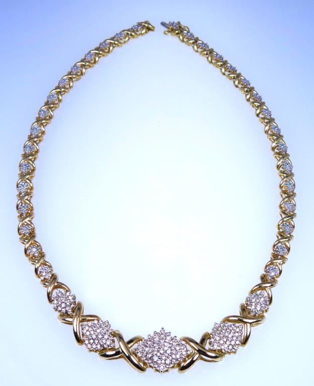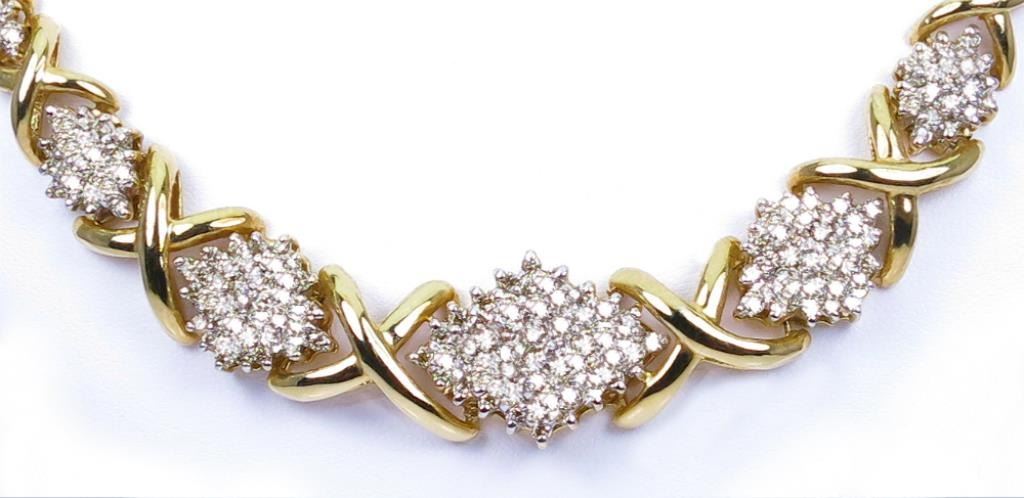 Dazzling Diamond Necklace featuring round Diamonds weighing approx. 4.00-5.00 carats with H-I colors and SI clarity set in a heavy 10 karat yellow gold setting. Retail $6,000-$8,000 Estimates $4,000-$6,000
