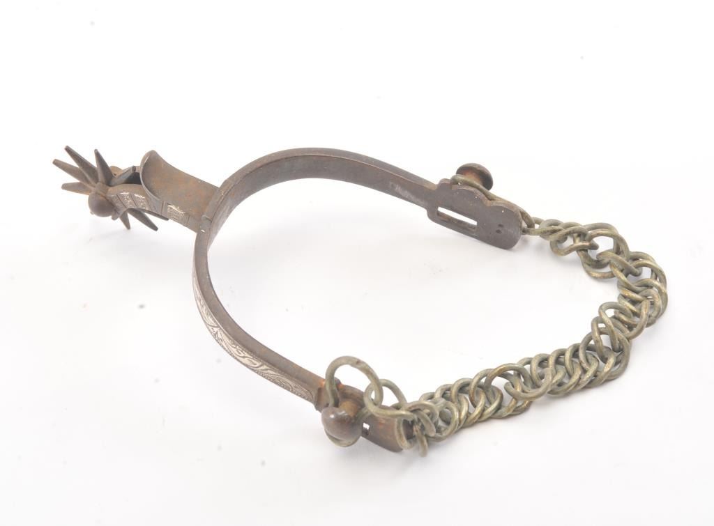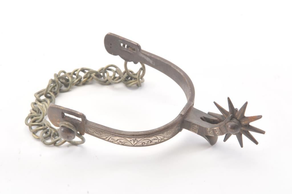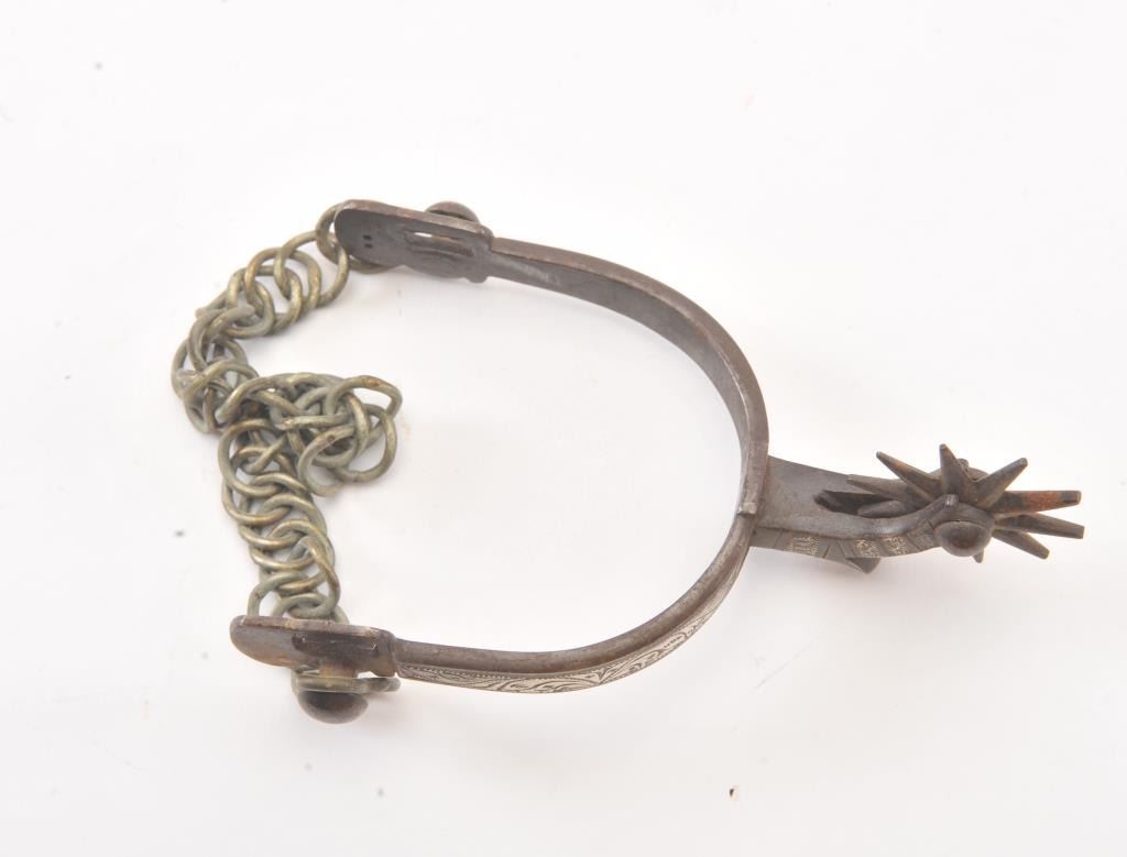 A good and early single silver decorated old west rowel spur. Good western display piece. Est.: $50-$75