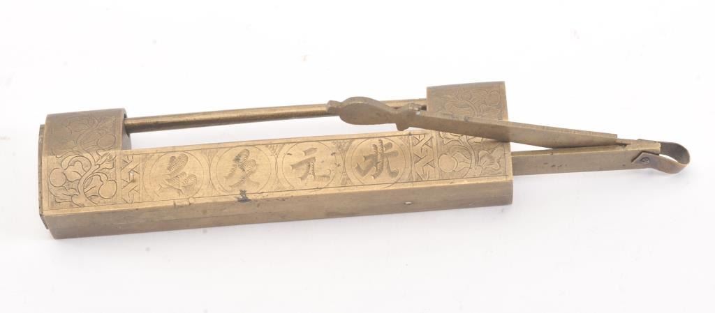 A rare Chinese engraved brass complex lock. Works properly. Late 19th or early 20th century. Fine condition. 5 ¾” overall. Est.: $50-$100
