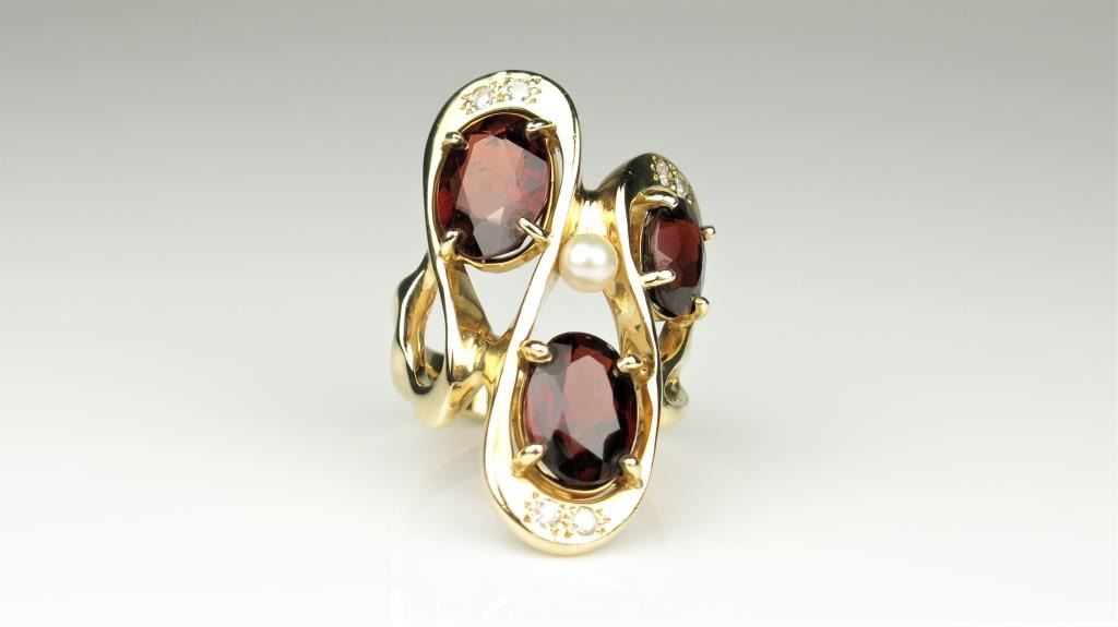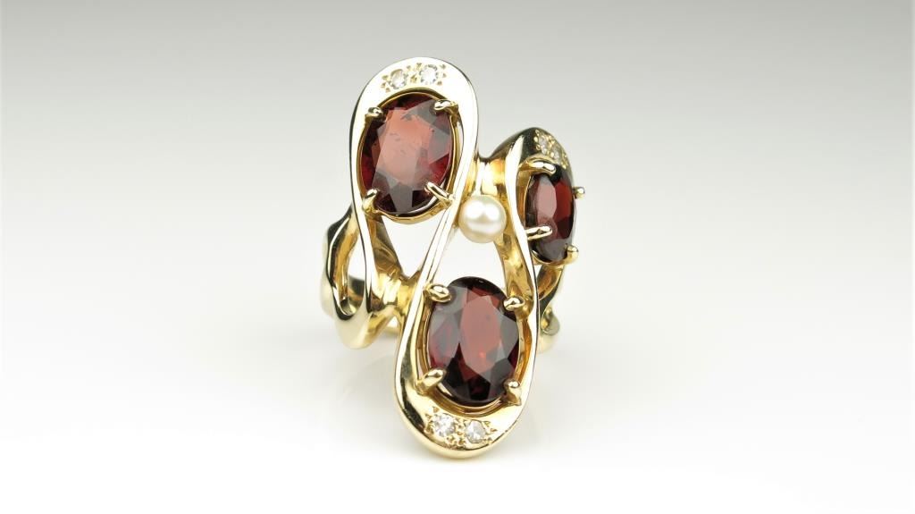 Contemporary Red Garnet, Diamond and Pearl Ring featuring 3 oval cut Red Garnets weighing approx. 6.00 carats with Diamond and Pearl accents set custom 14 karat yellow gold freeform design setting. Estimates$2,000-$3,000
