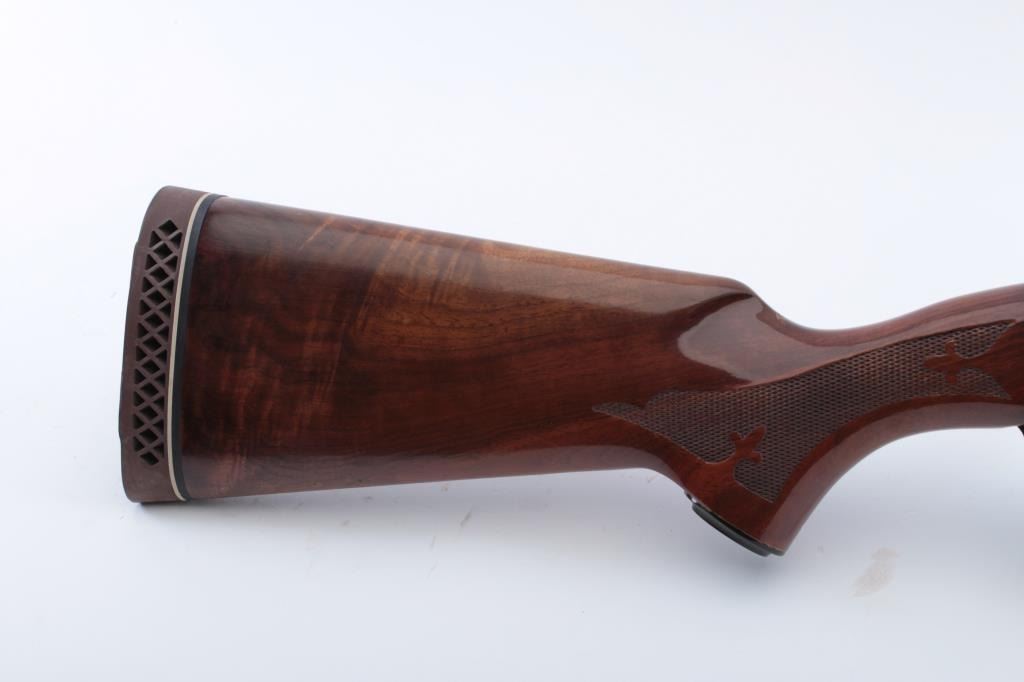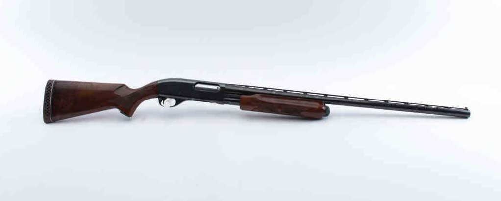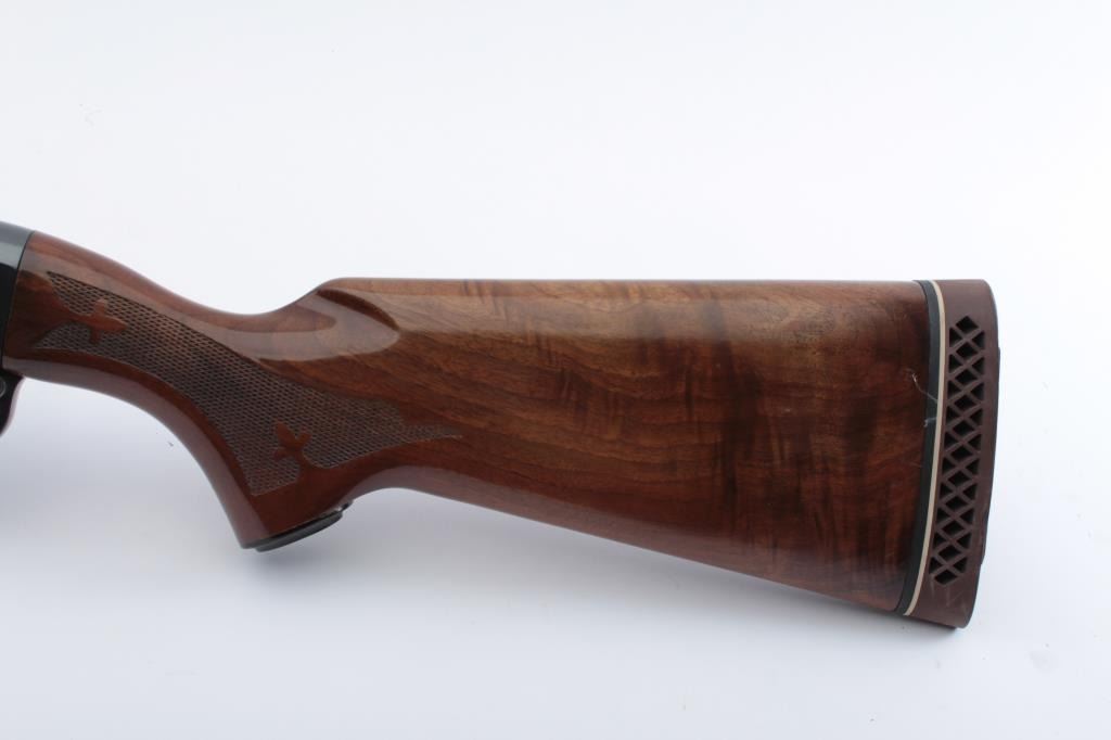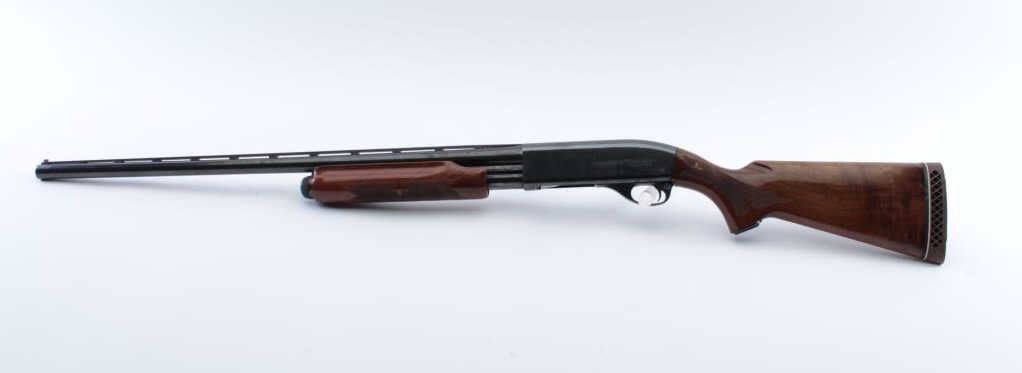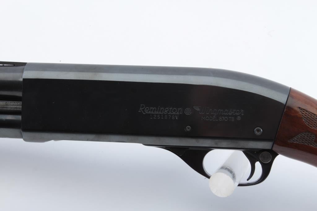 Remington Model 870 TB Wingmaster pump action shotgun, 12 gauge, 28” ventilated rib barrel, blued finish, checkered wood stocks, S/N 1251878V; overall fine condition with majority of finish remaining, fine bore,crisp action, sharp markings and fine wood stocks. (Modern). Est.: $200-$400.