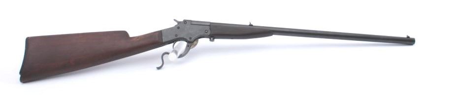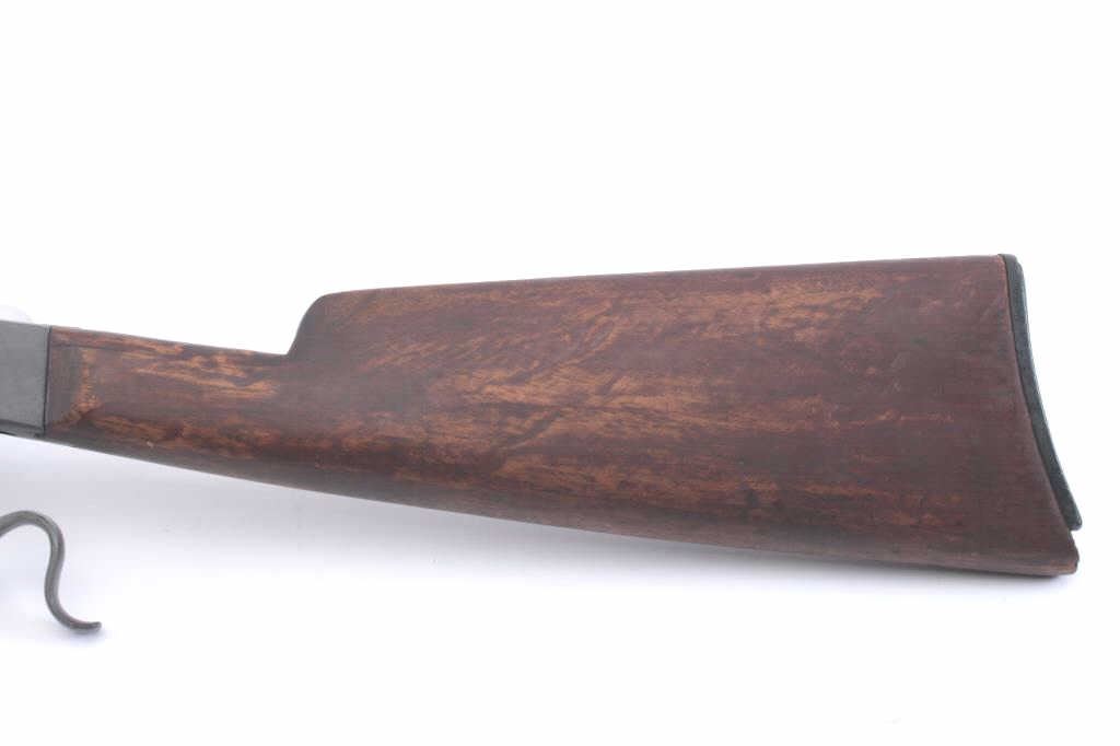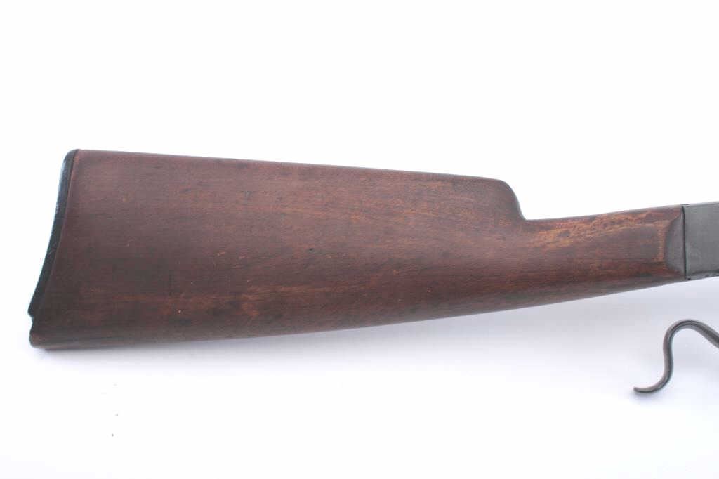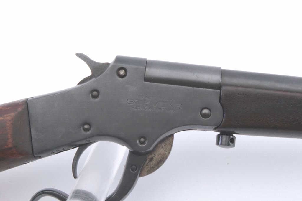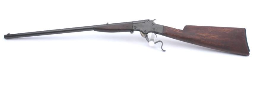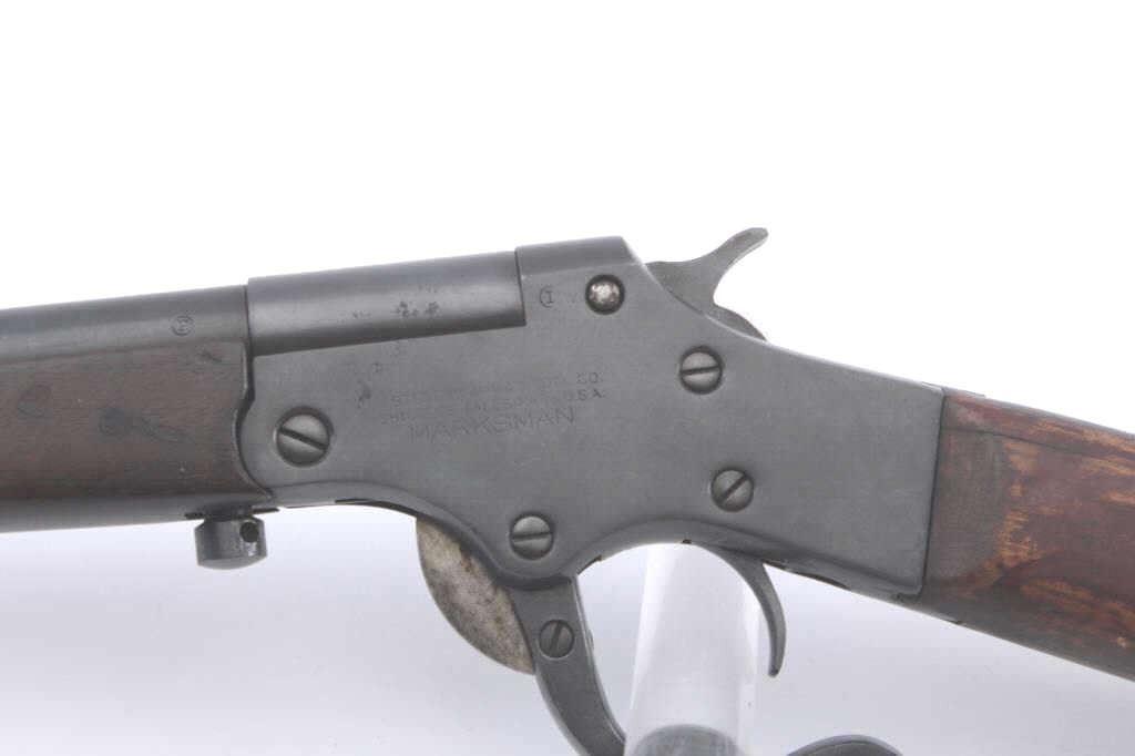 Stevens Marksman .22 caliber falling block rifle showing old re-blued finish. Good markings, fair wood, and butt chipped. Bright bore with strong rifling. .22 L.R. caliber. Scarce. (C&R) Est.: $125-$250