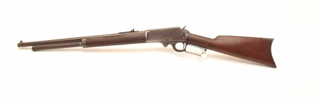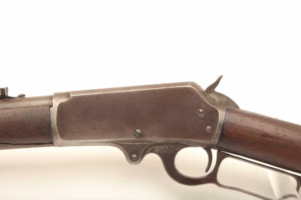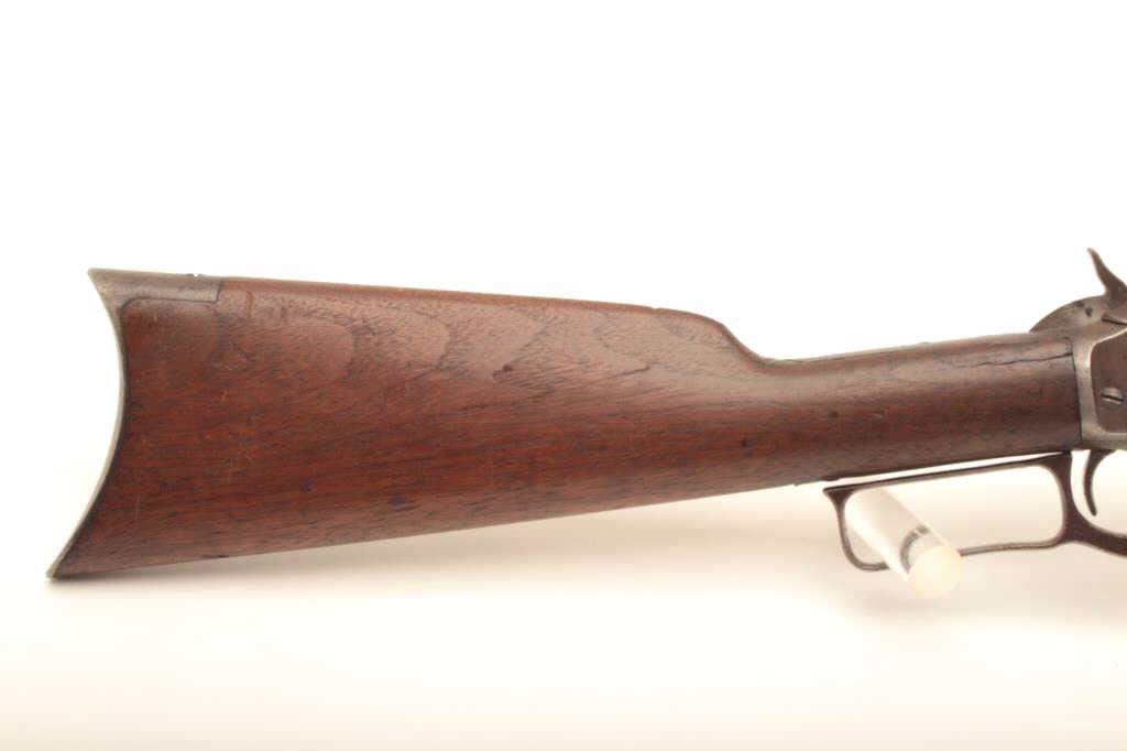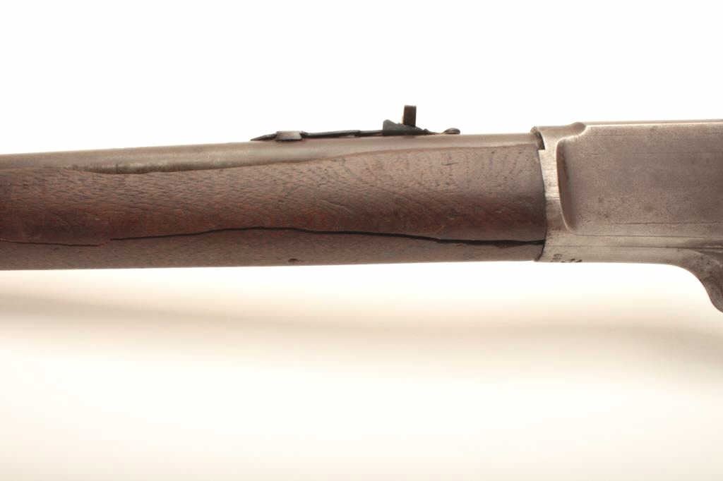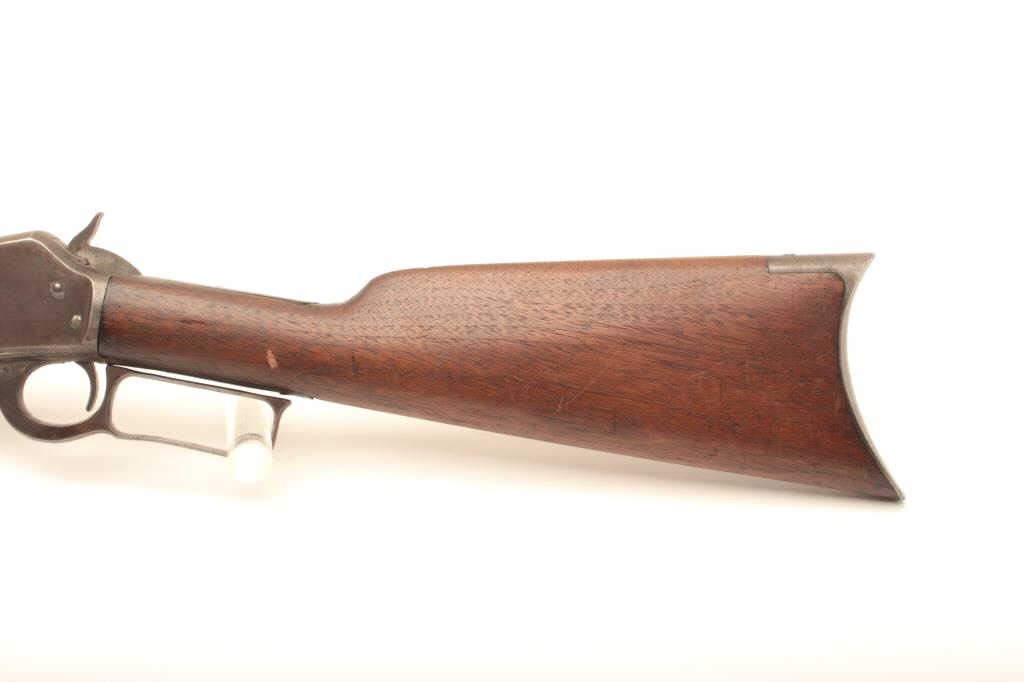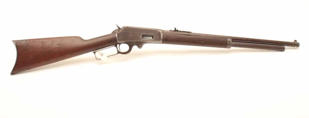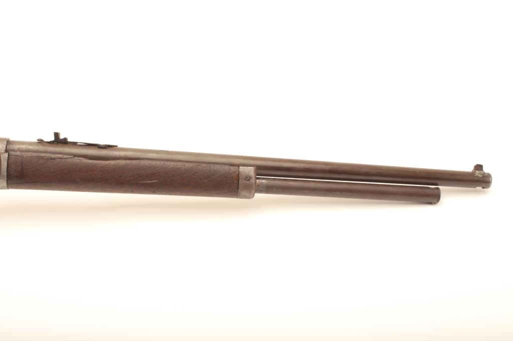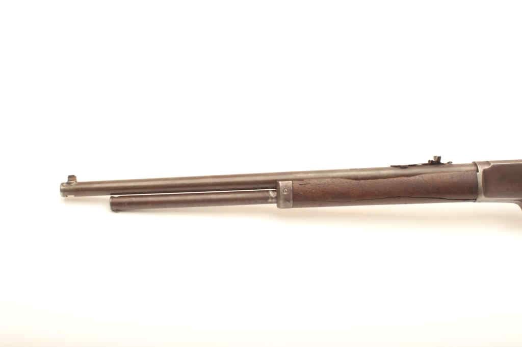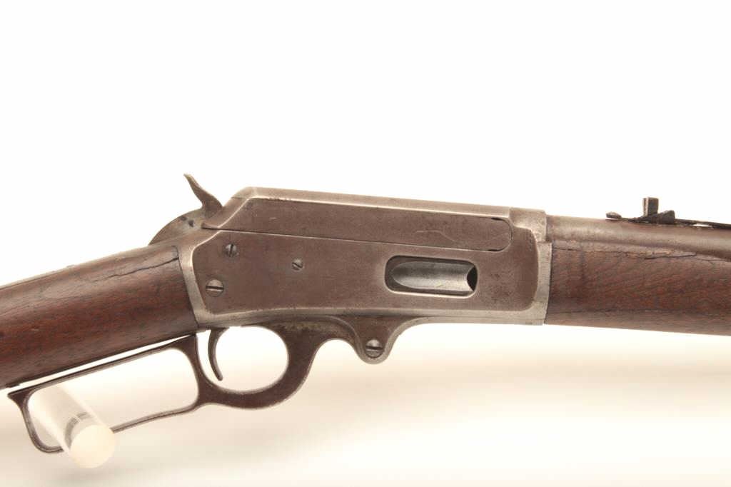 Marlin Model 1893 lever action rifle, approximately .30 caliber, Serial #257339. The rifle is in fair overall condition with a period replacement 19” round barrel and ¾ magazine. The metal surfaces have all goneto a grey/brown patina with replacement front sight and King rear with an extra dove tail filled on the barrel. The smooth wood stocks are in fair condition with several large cracks in the fore end and dents in the buttstock. The bore is fair, the action functions and the markings are legible. Est.: $150-$300. (C+R).