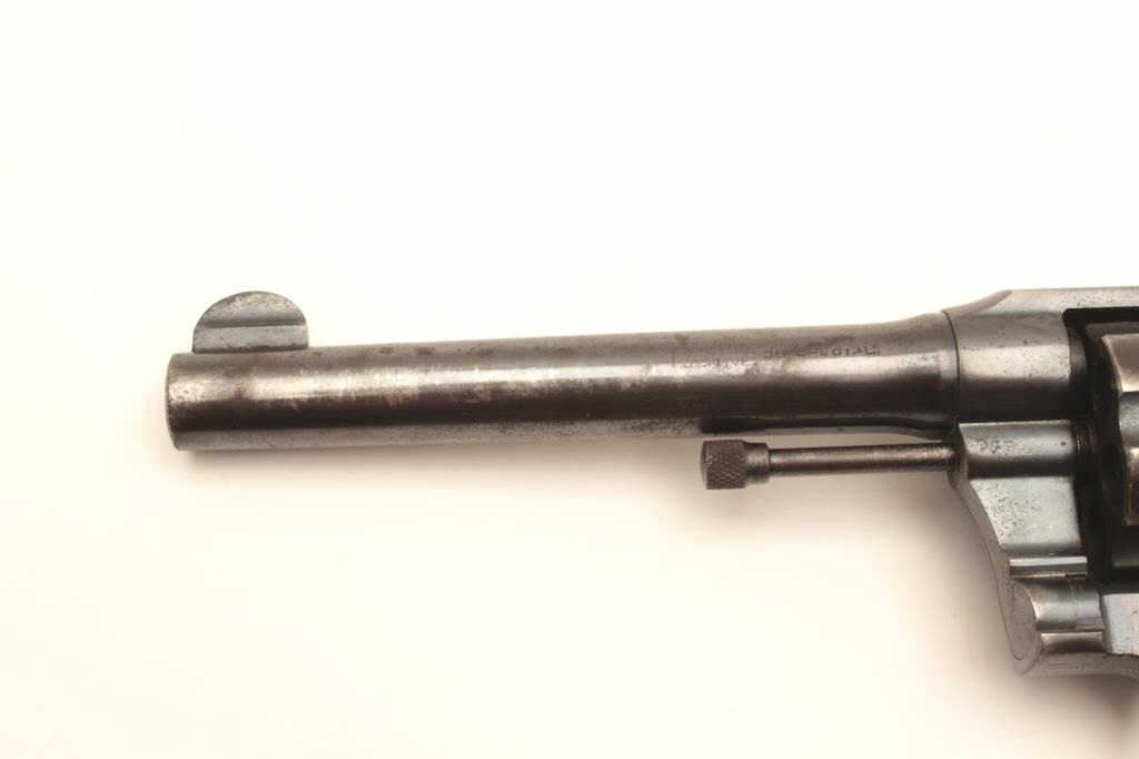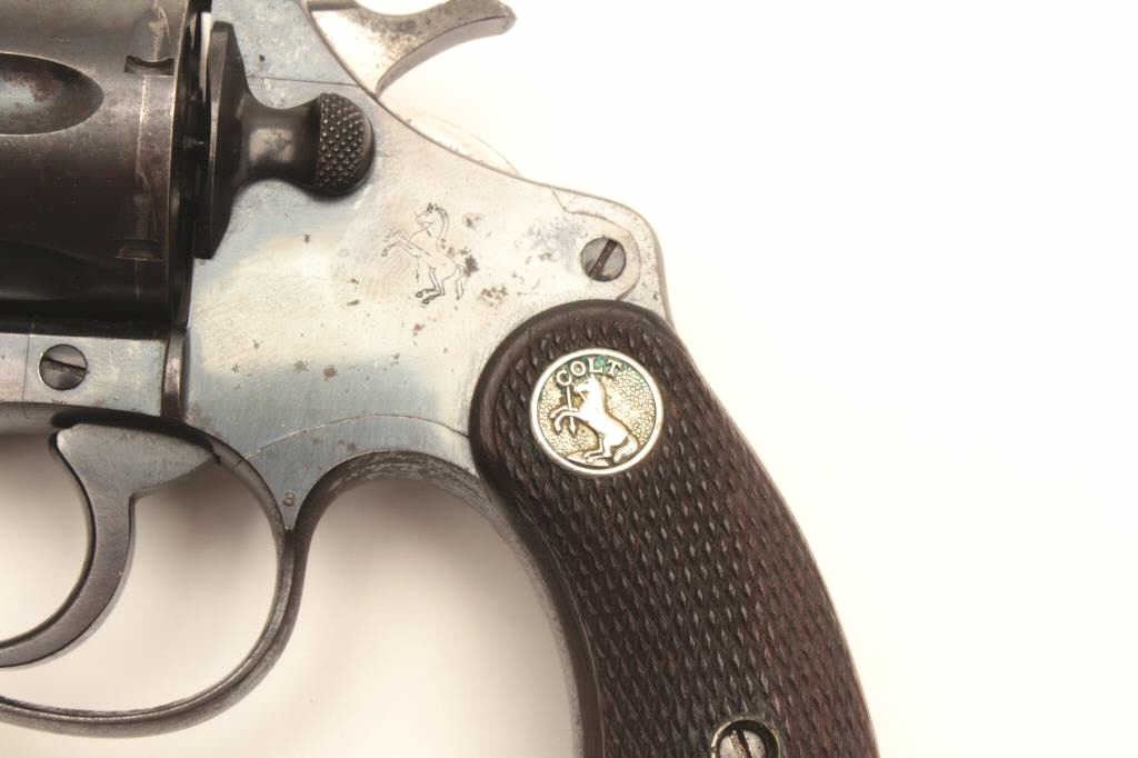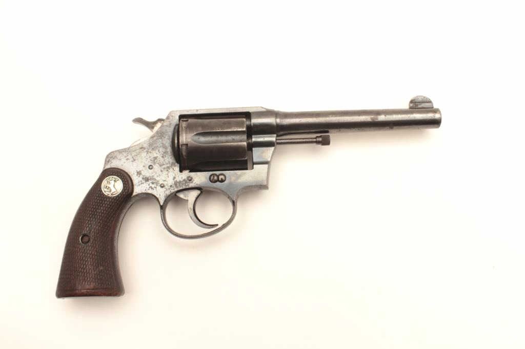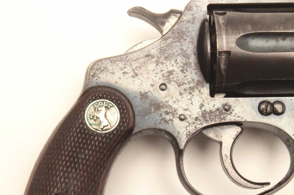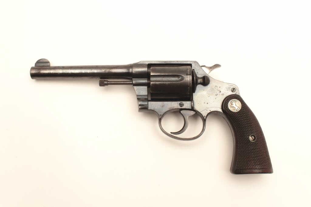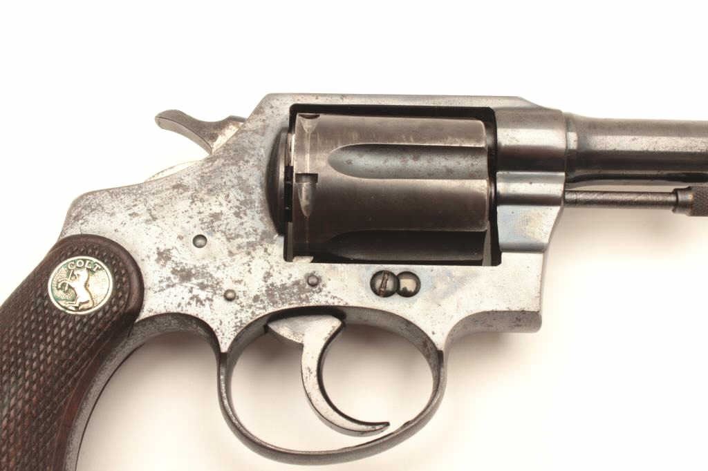 Colt Police Positive DA revolver, .38 Special caliber, 5” barrel, blued finish, checkered wood medallion grips, S/N 318785; overall good to very good condition displaying majority of original finish, some holster and high point wear and some scattered spots of erosion; crisp action, good markings and very good grips. (C&R/PPT). Est.: $175-350