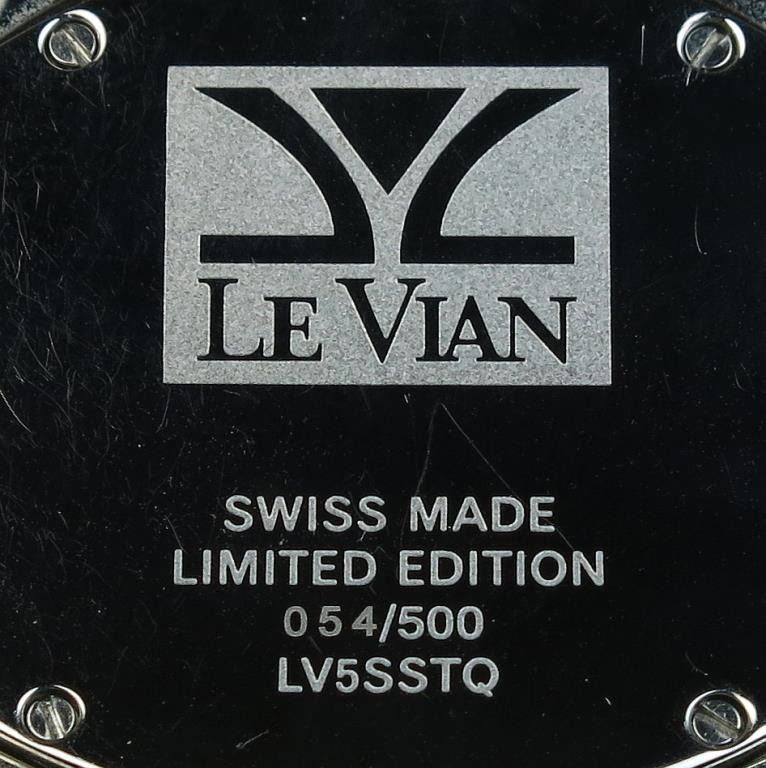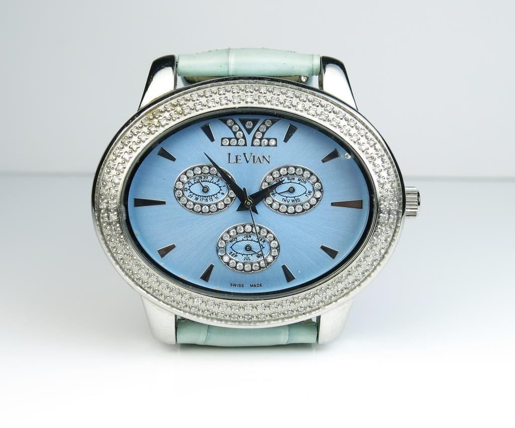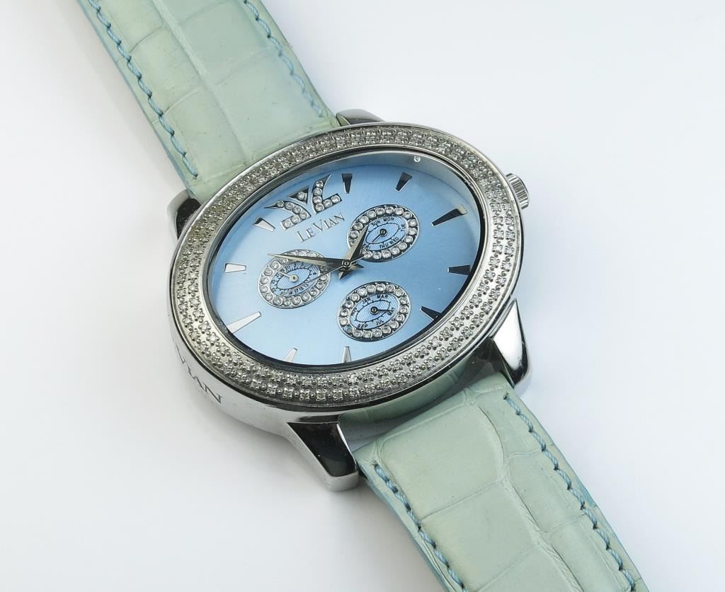 LEVIAN Limited Edition Swiss Designer Diamond Watch featuring over 192 round Diamonds on the face weighing approx. 1.50 carats with H-I colors sporting a blue Alligator band with Diamond buckle. Numbered 54 of 500 with box and papers. Retail $2,000-$3,000 Estimates $1,000-$1,500
