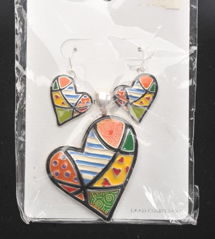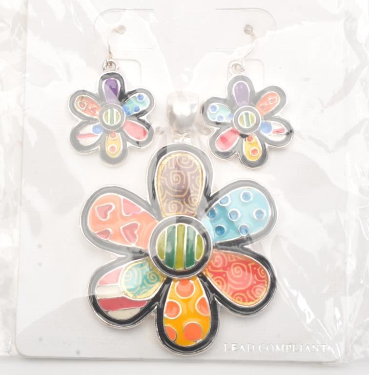A collection of fashion Jewelry including bright multi colored 3sets of pendants and matching earrings shaped as flowers, owl,and heart, Est:$40-80