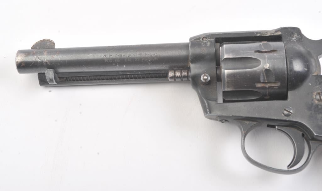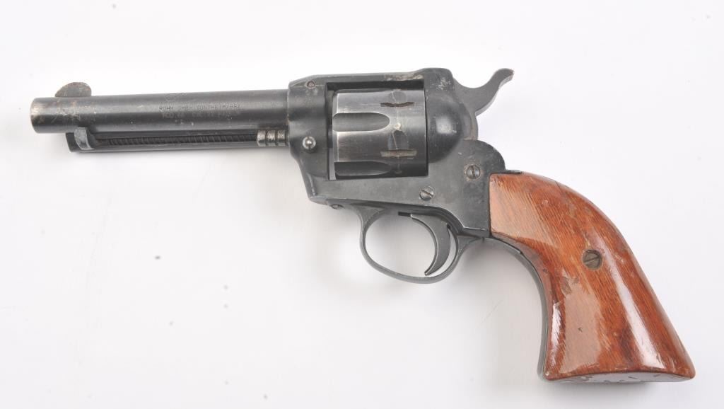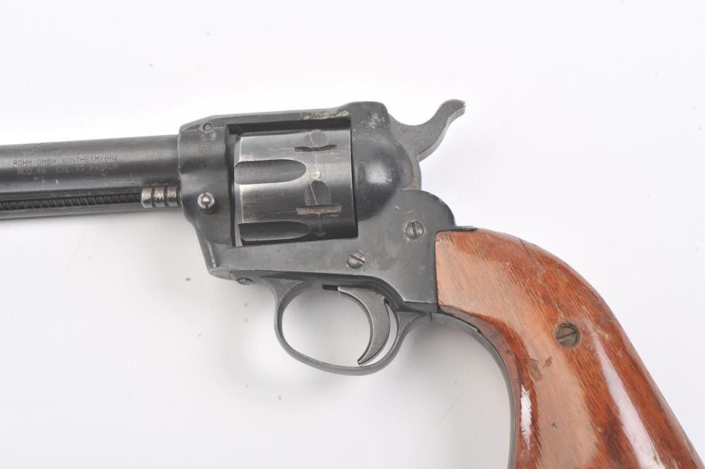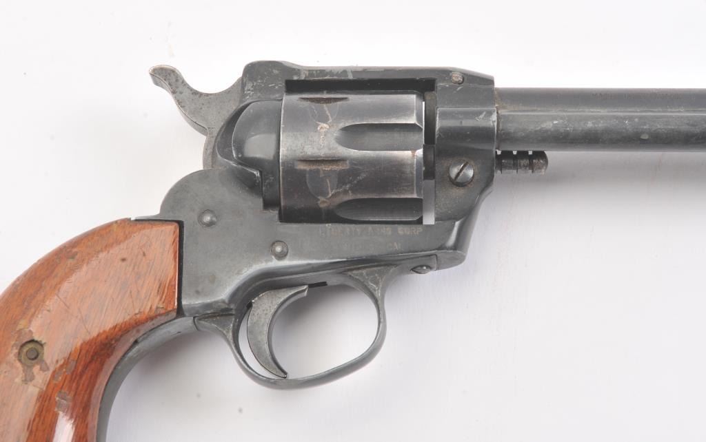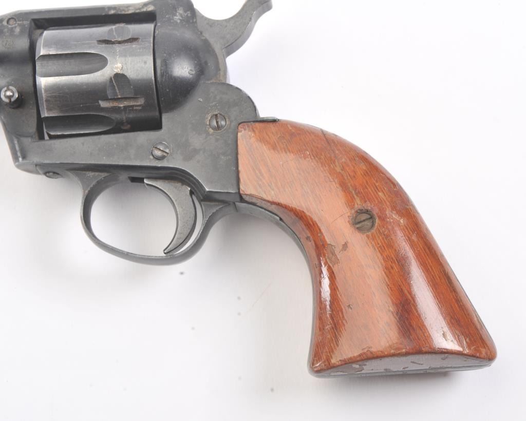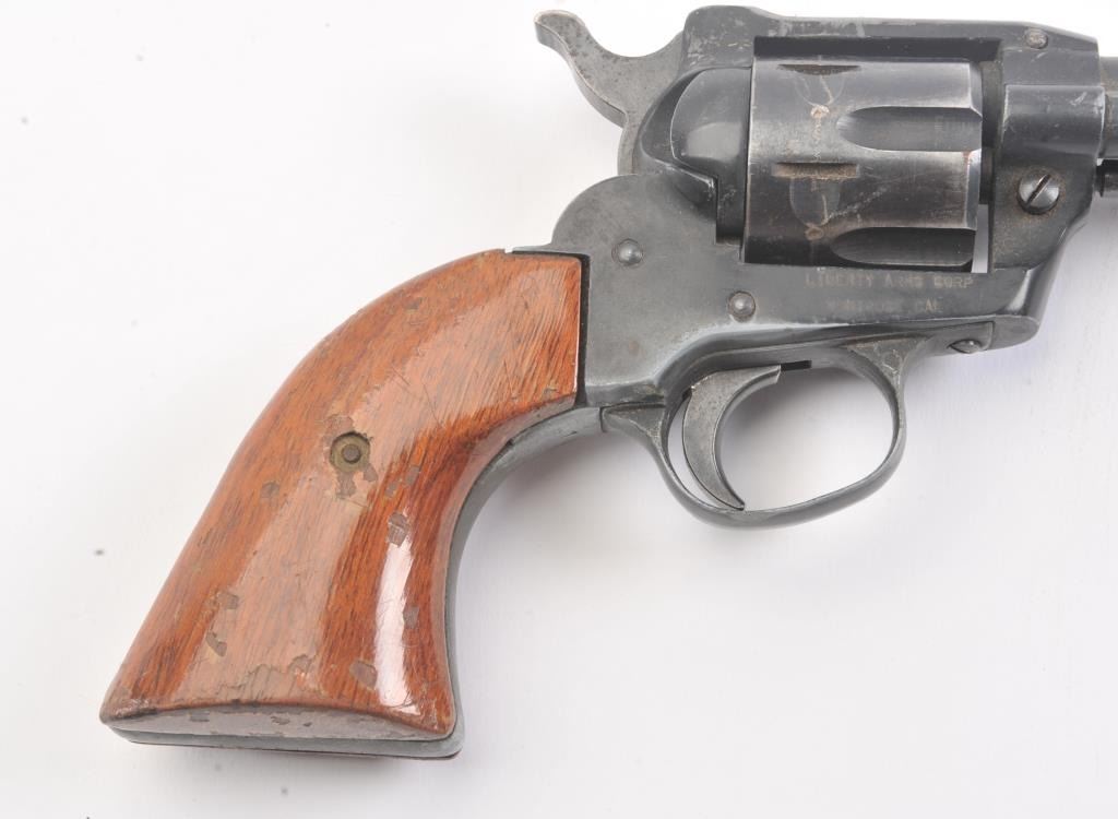 German Liberty Mustang Model 66 single action revolver, .22 Magnum caliber, Serial #IC178947. The pistol is in very good overall condition with a 4 ¾” barrel. The pistol retains approximately 85%-90% of theblue finish with holster wear at the muzzle, light scratches and a drag line. The right side of the barrel is marked, “MADE IN GERMANY”. The smooth wood grips are in good condition, the bore is good, action crisp and markings are sharp. Est.: $75-$150. (Modern/PPT).