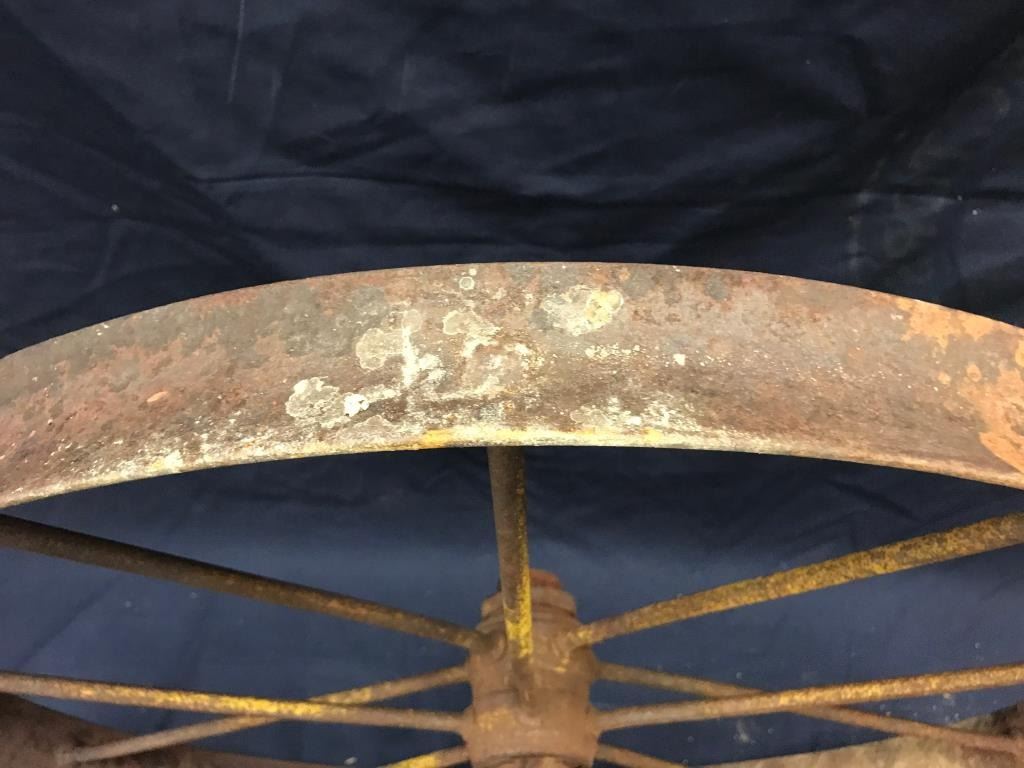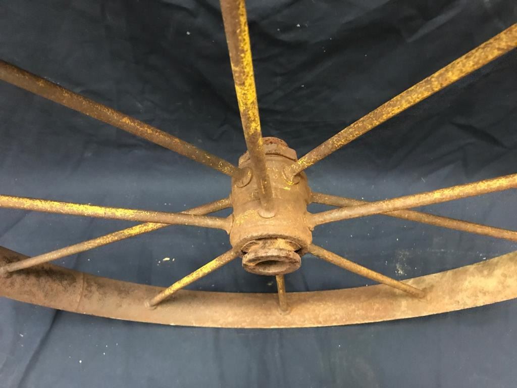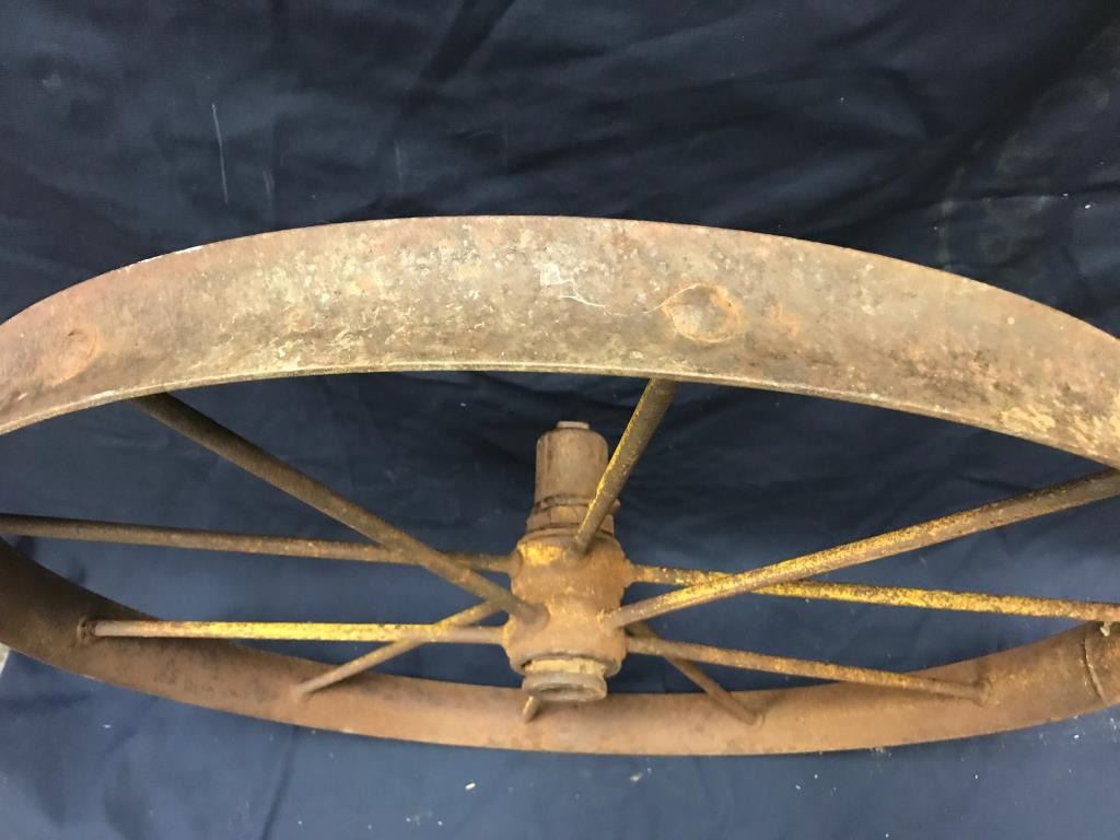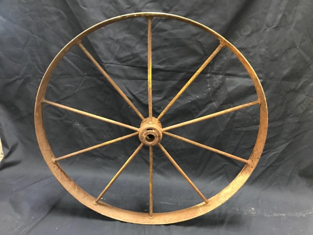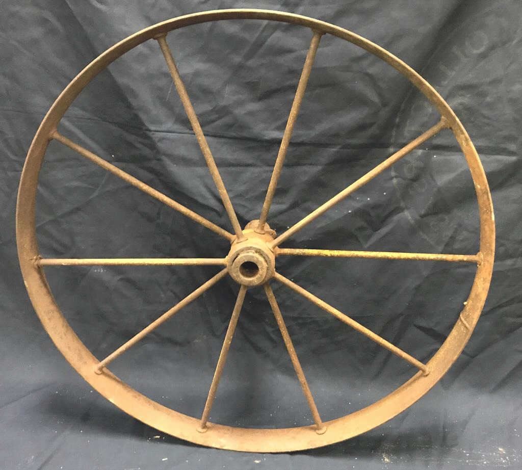 Lot of 3 weathered wagon wheels; 2 all iron and approximately 30” in diameter; 1 wooden and also approximately 30” in diameter; would make great decorators! Est.: $175-$350.